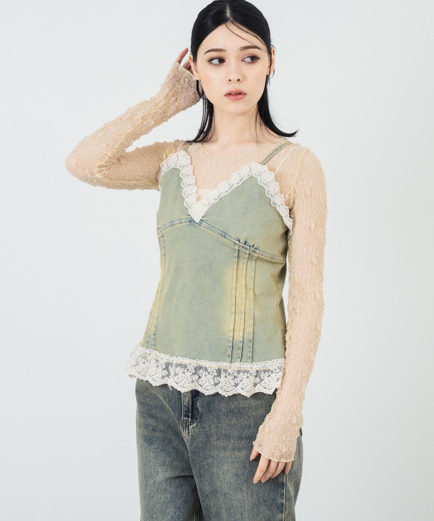 〇甘すぎないフェミニンに寄せたい→ベージュやアイボリーのキャミソールを中に忍ばせ、フレアスカートを合わせて。レースの甘さをナチュラルカラーで中和し、柔らかく女性らしい印象に。