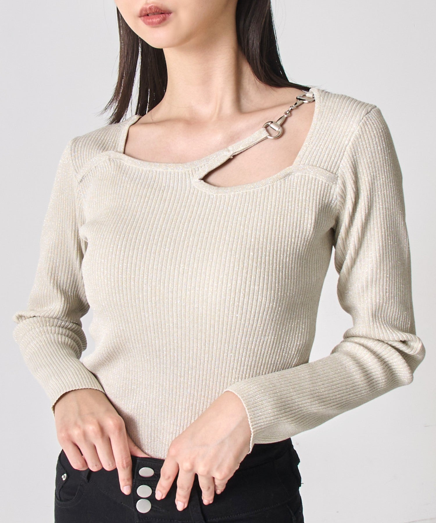 繊細なラメ糸が織り込まれたリブニットは、上品な光沢とストレッチの効いた着心地がポイント。