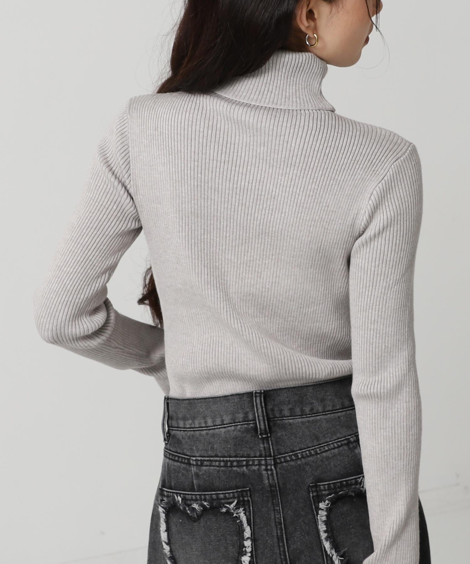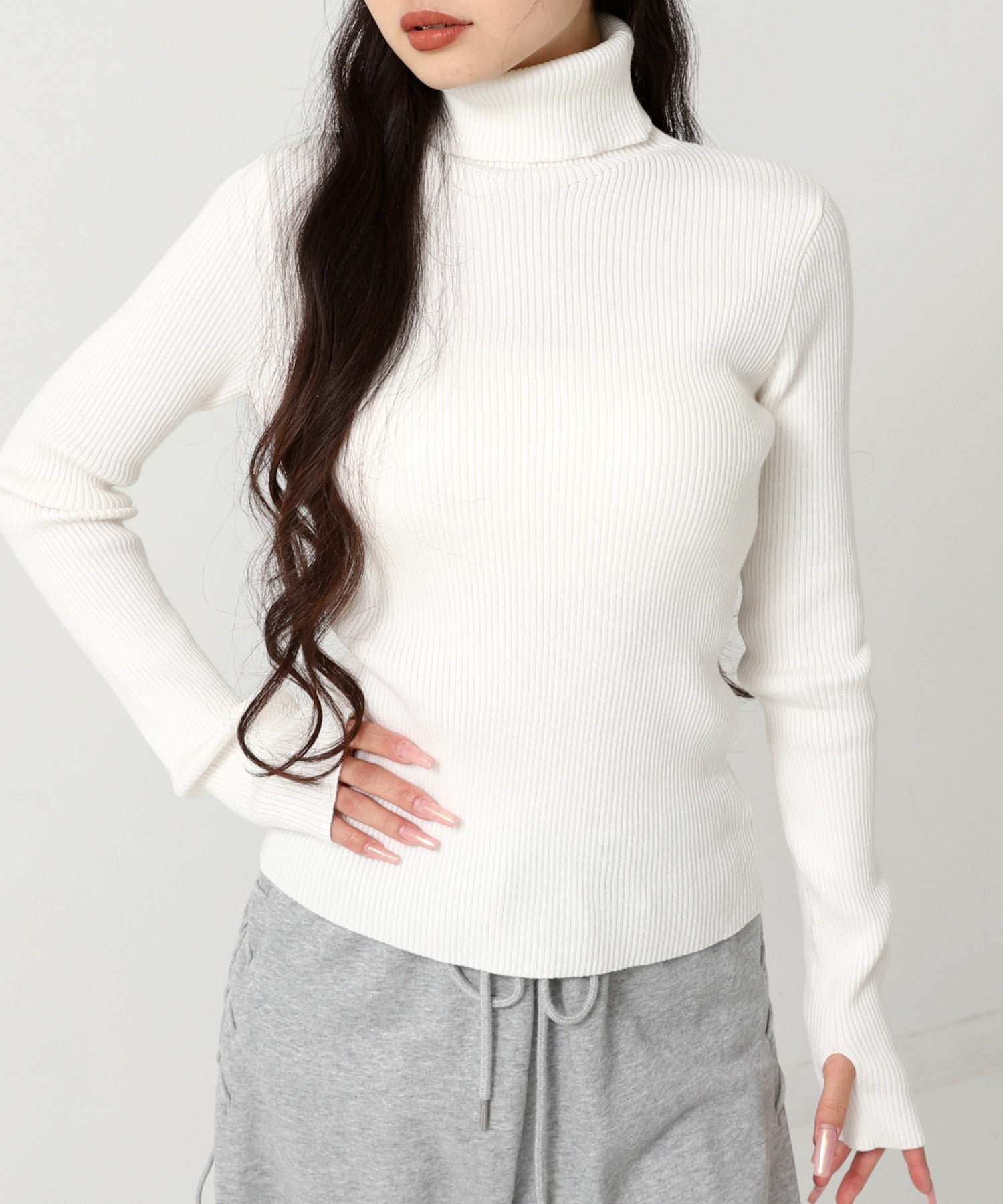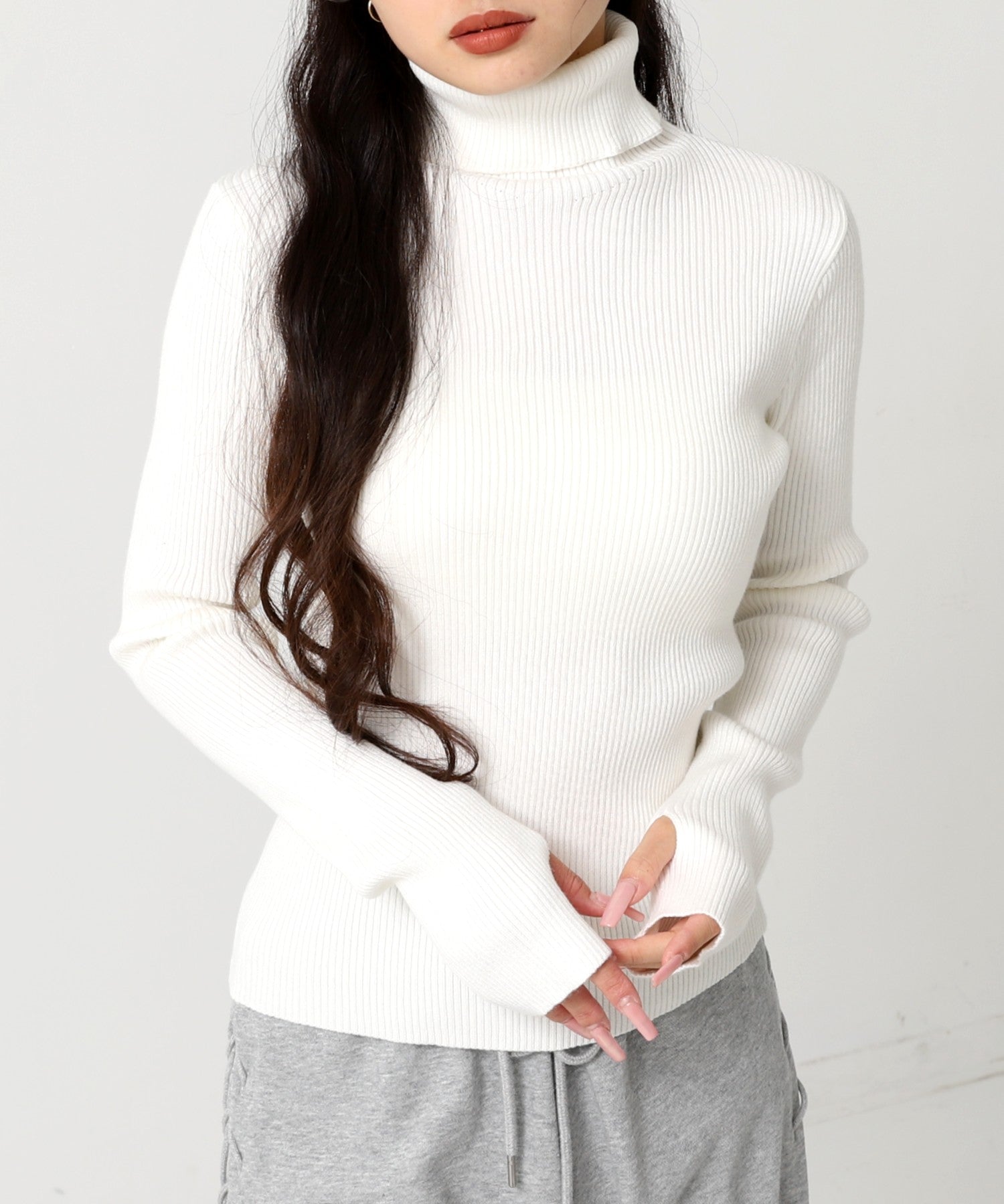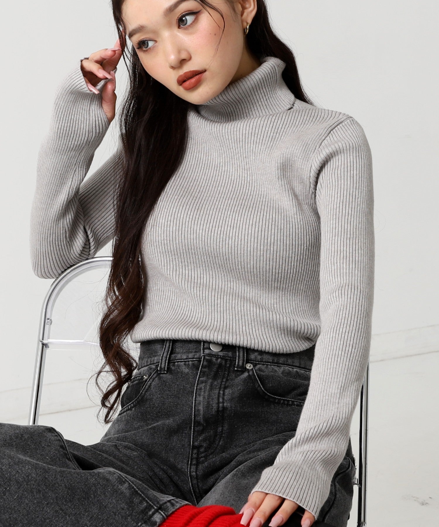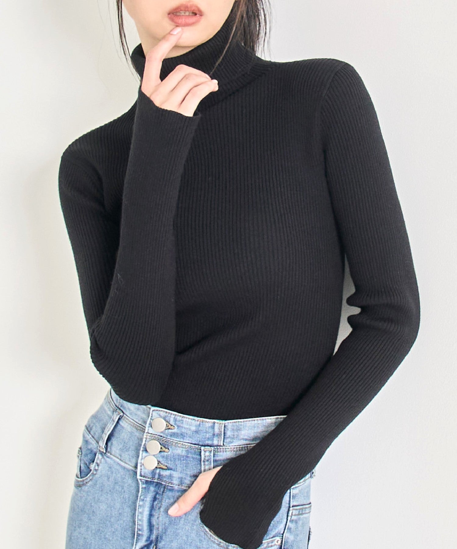 程よい厚みのリブ素材がボディラインを美しく引き立てるタートルネックニット。
