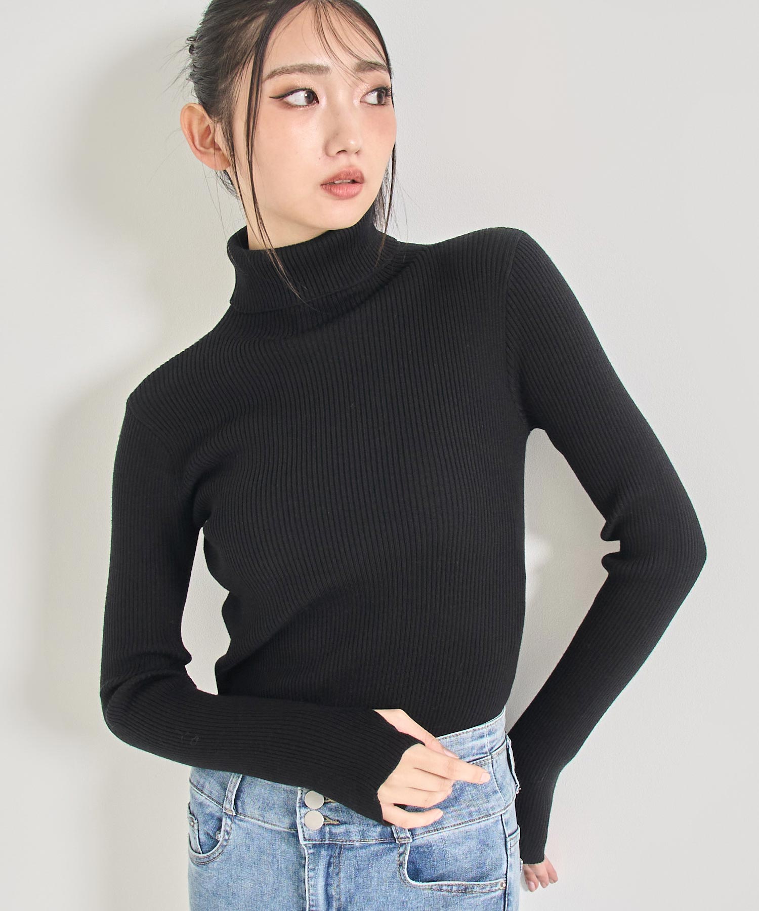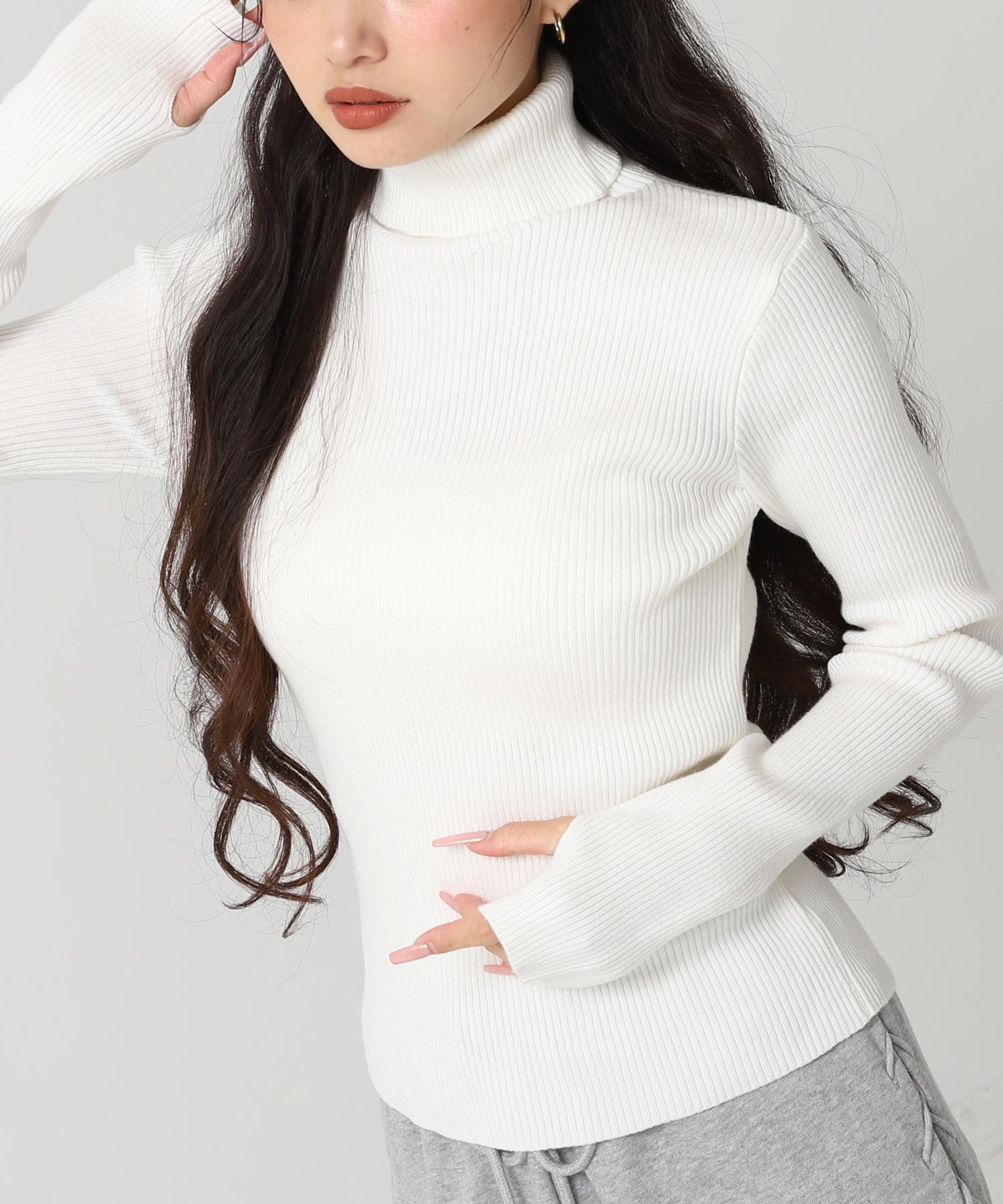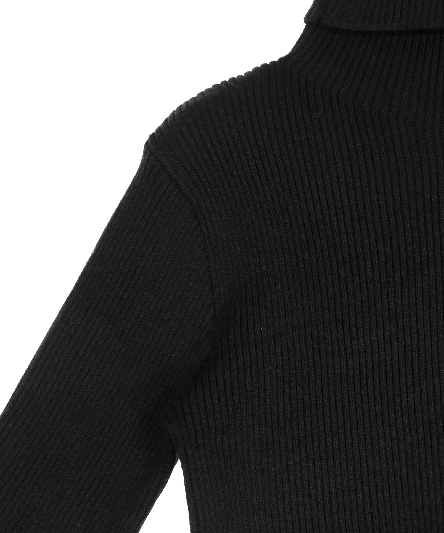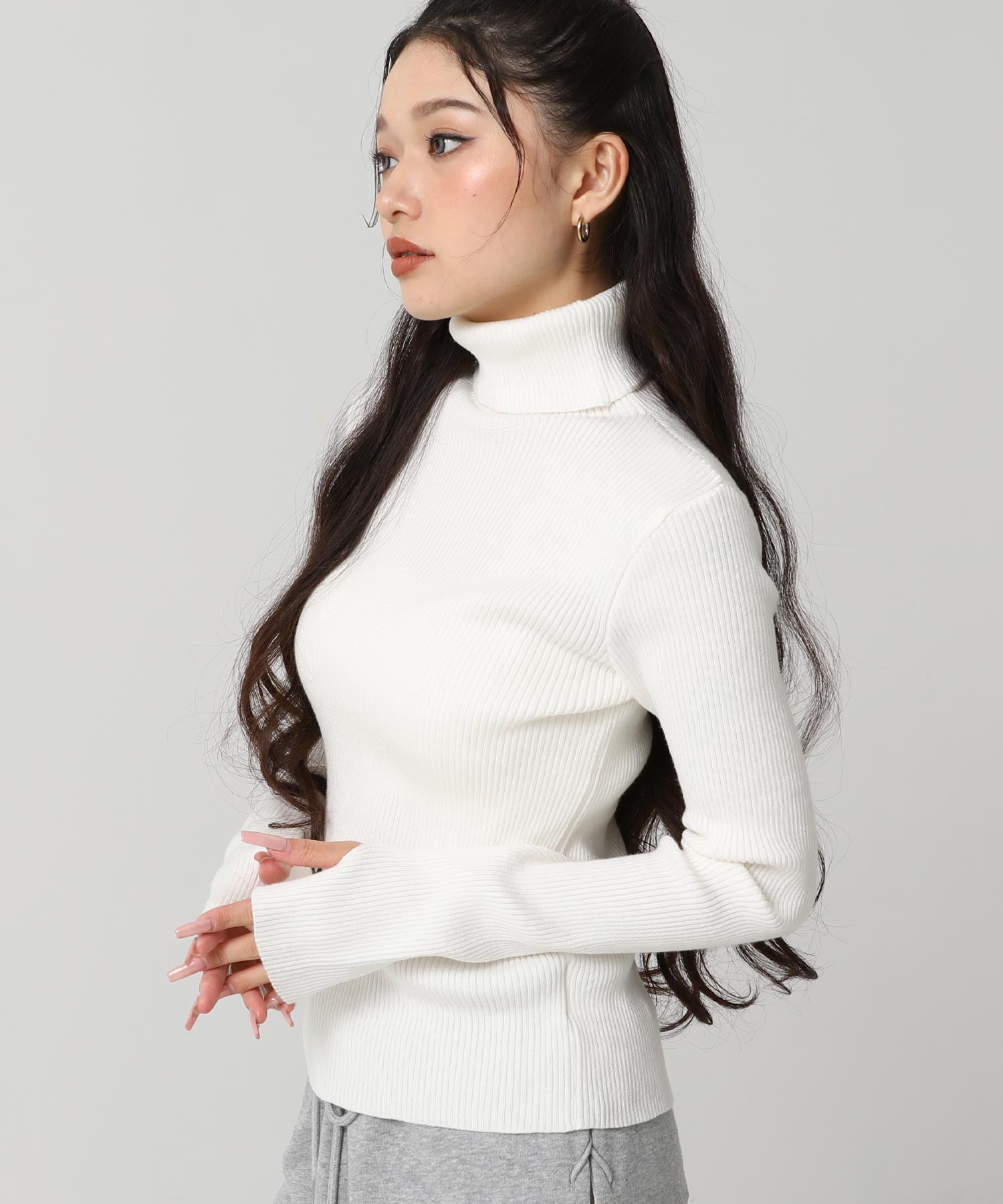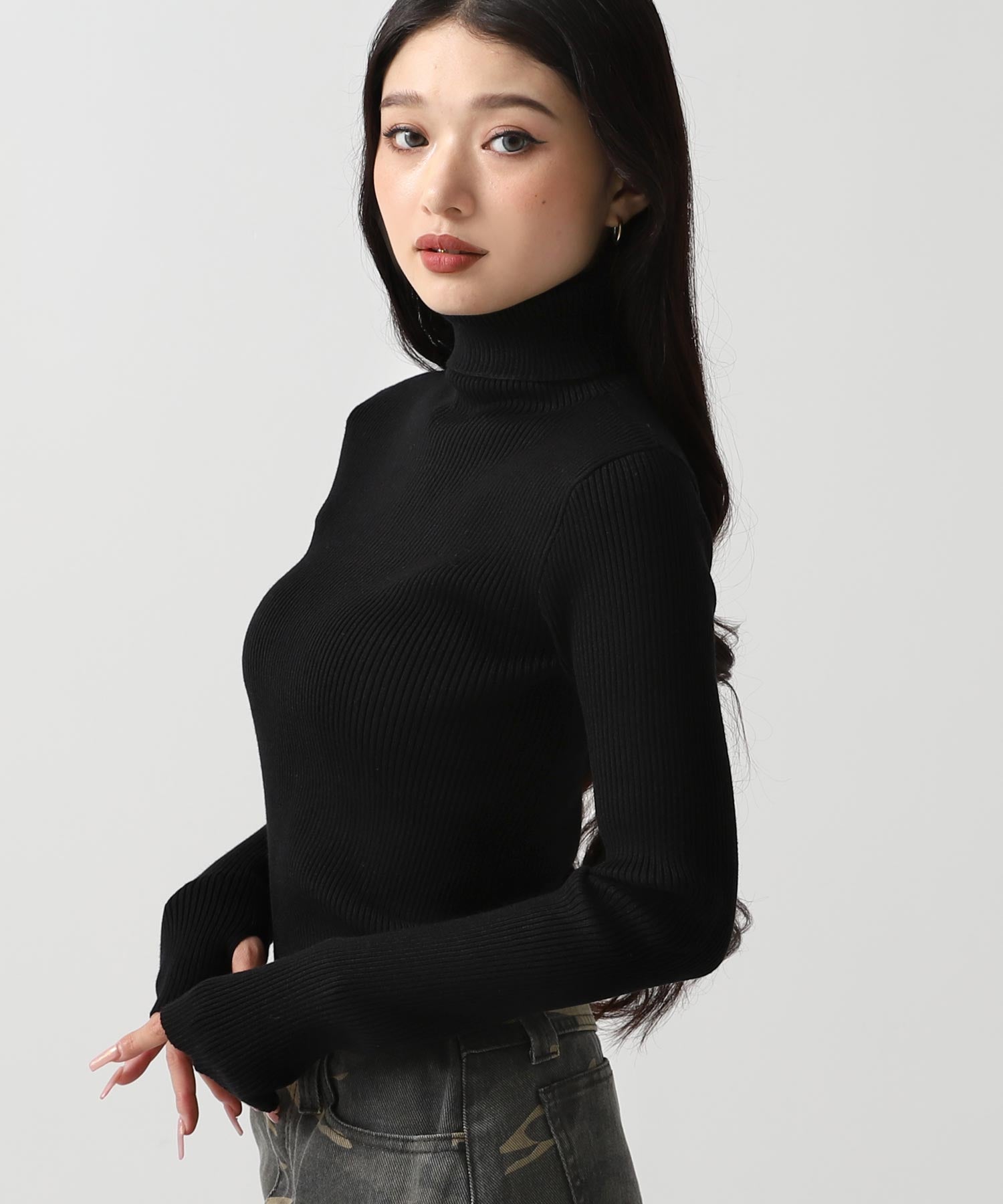 程よい厚みのリブ素材がボディラインを美しく引き立てるタートルネックニット。