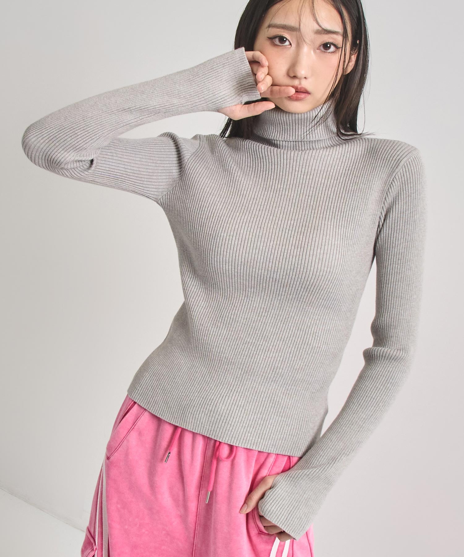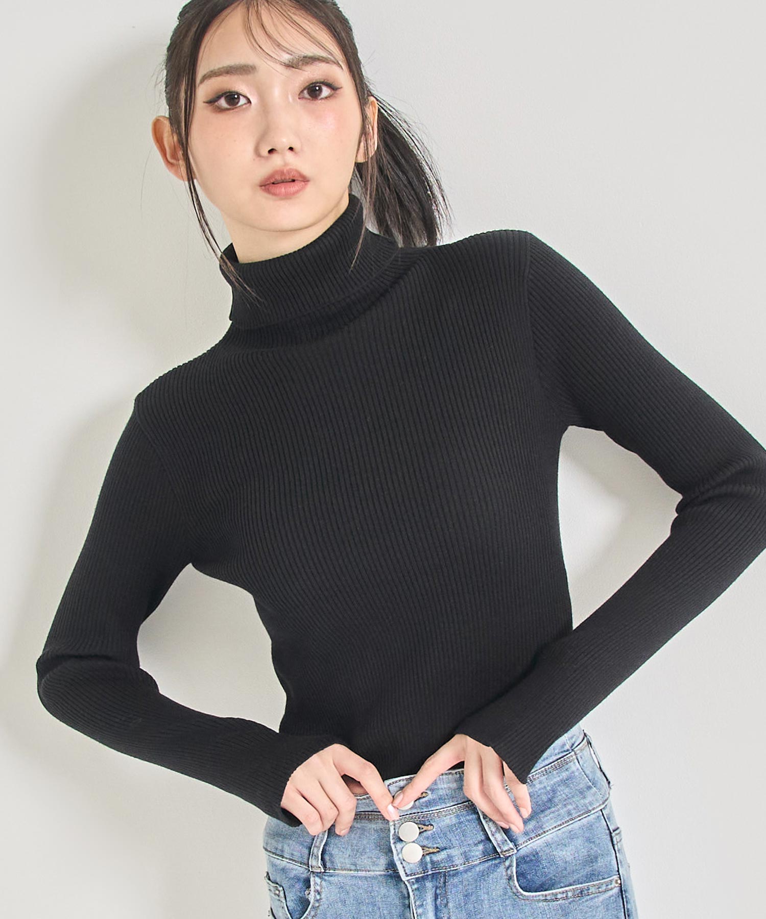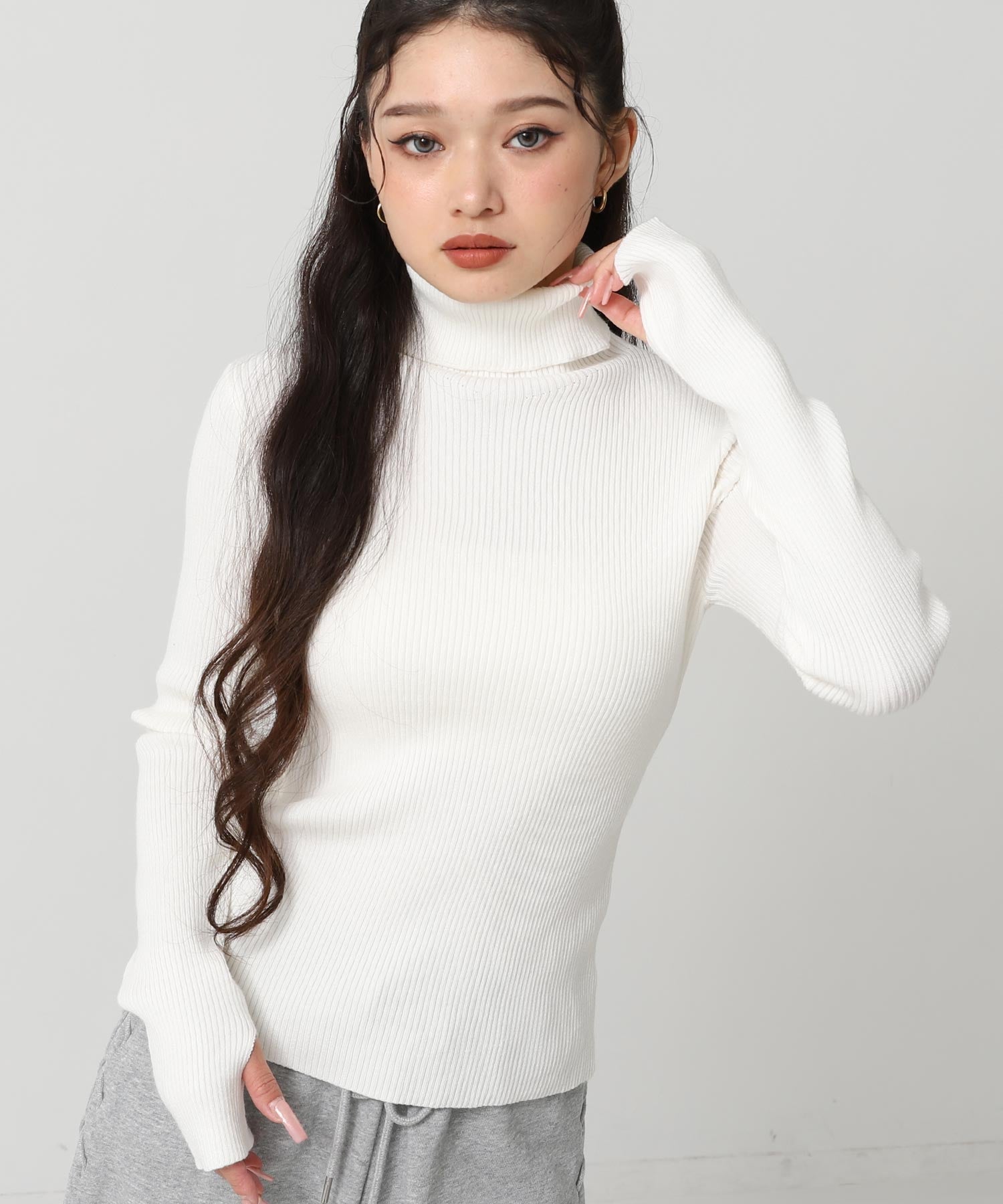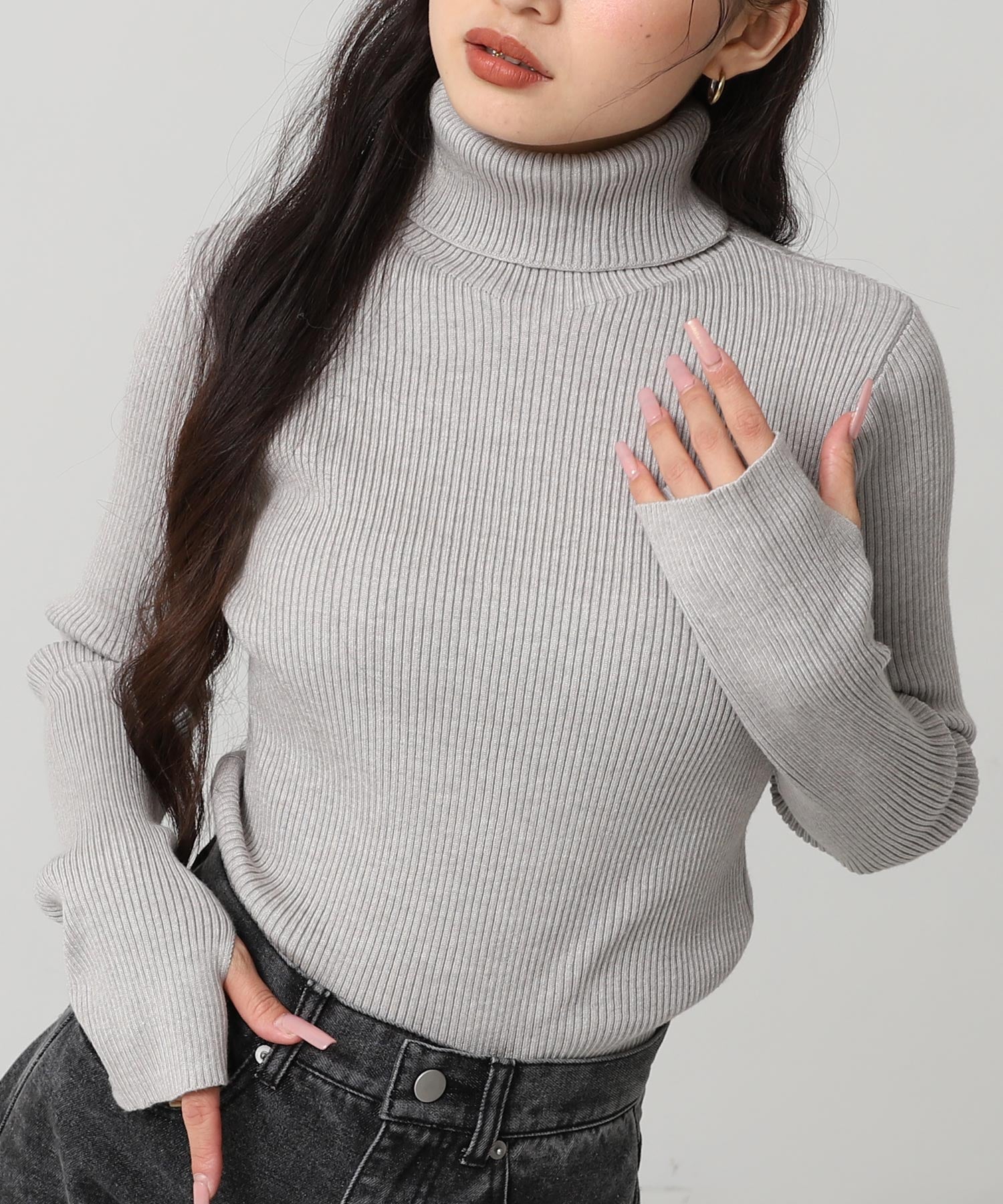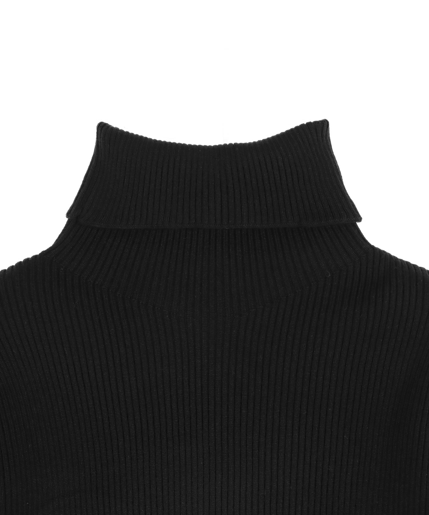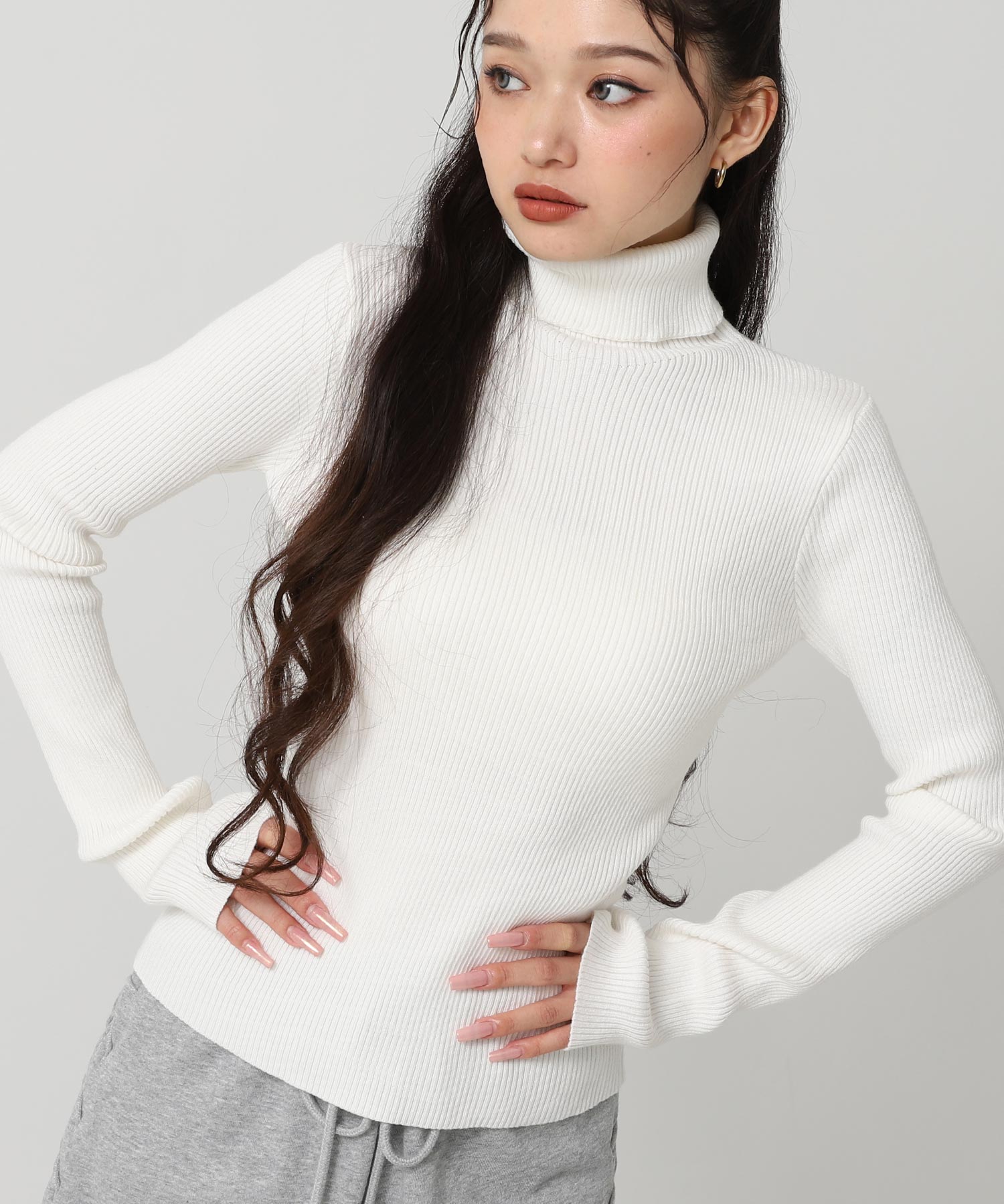 程よい厚みのリブ素材がボディラインを美しく引き立てるタートルネックニット。