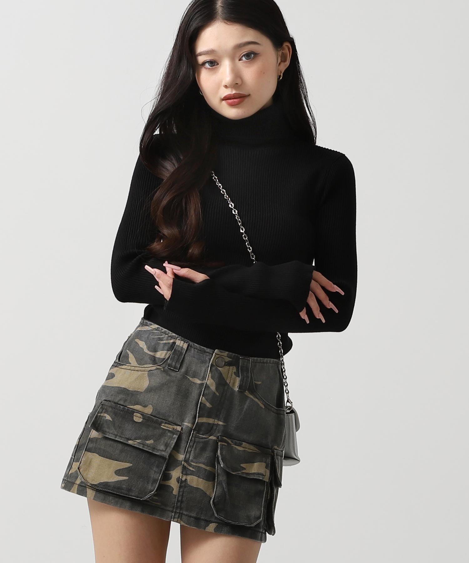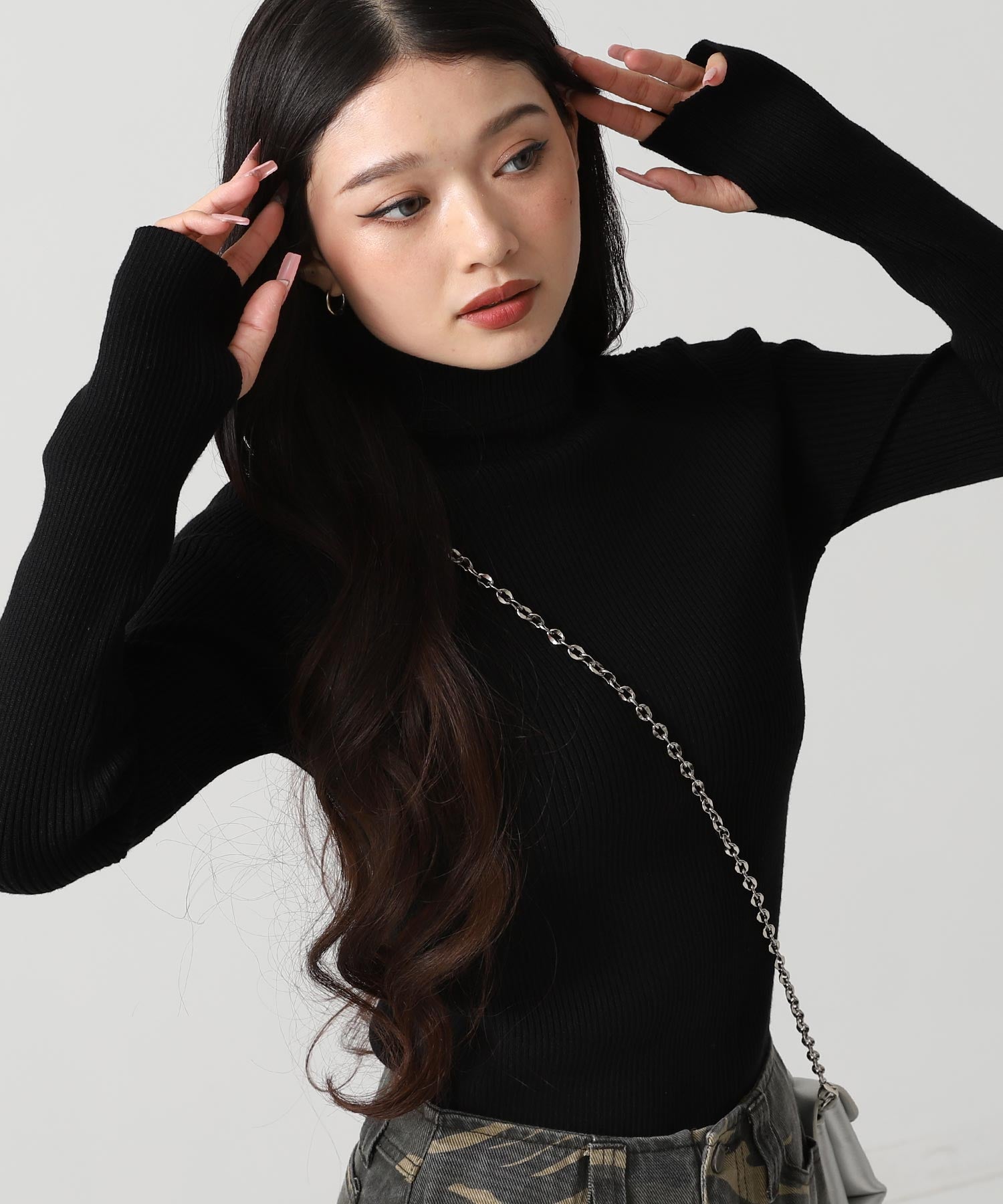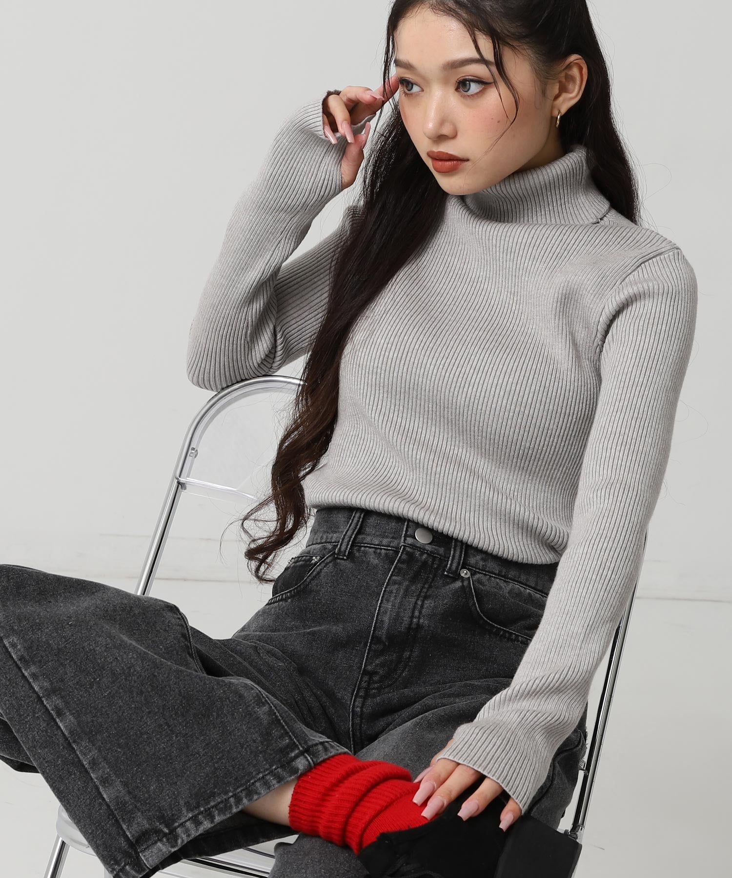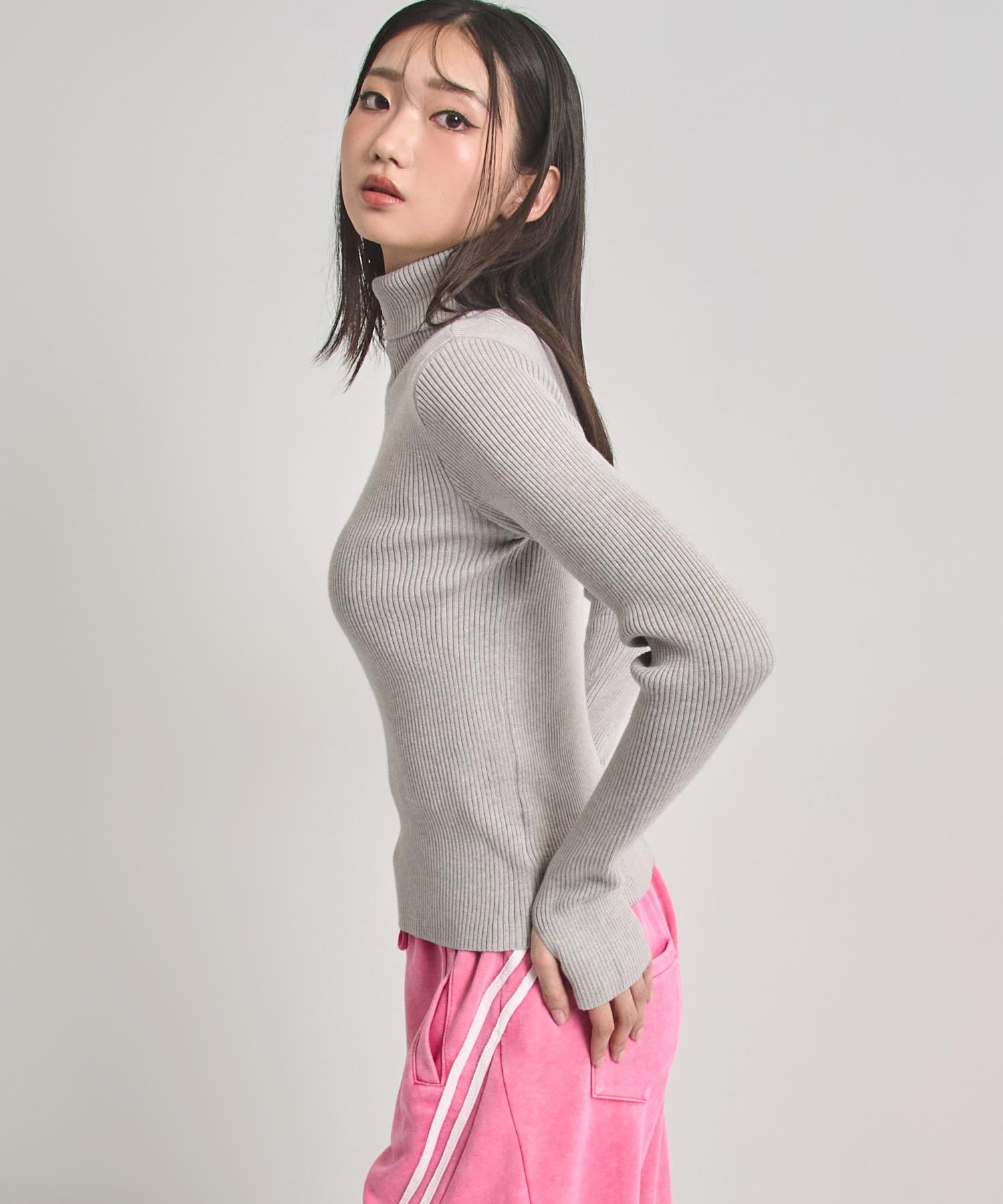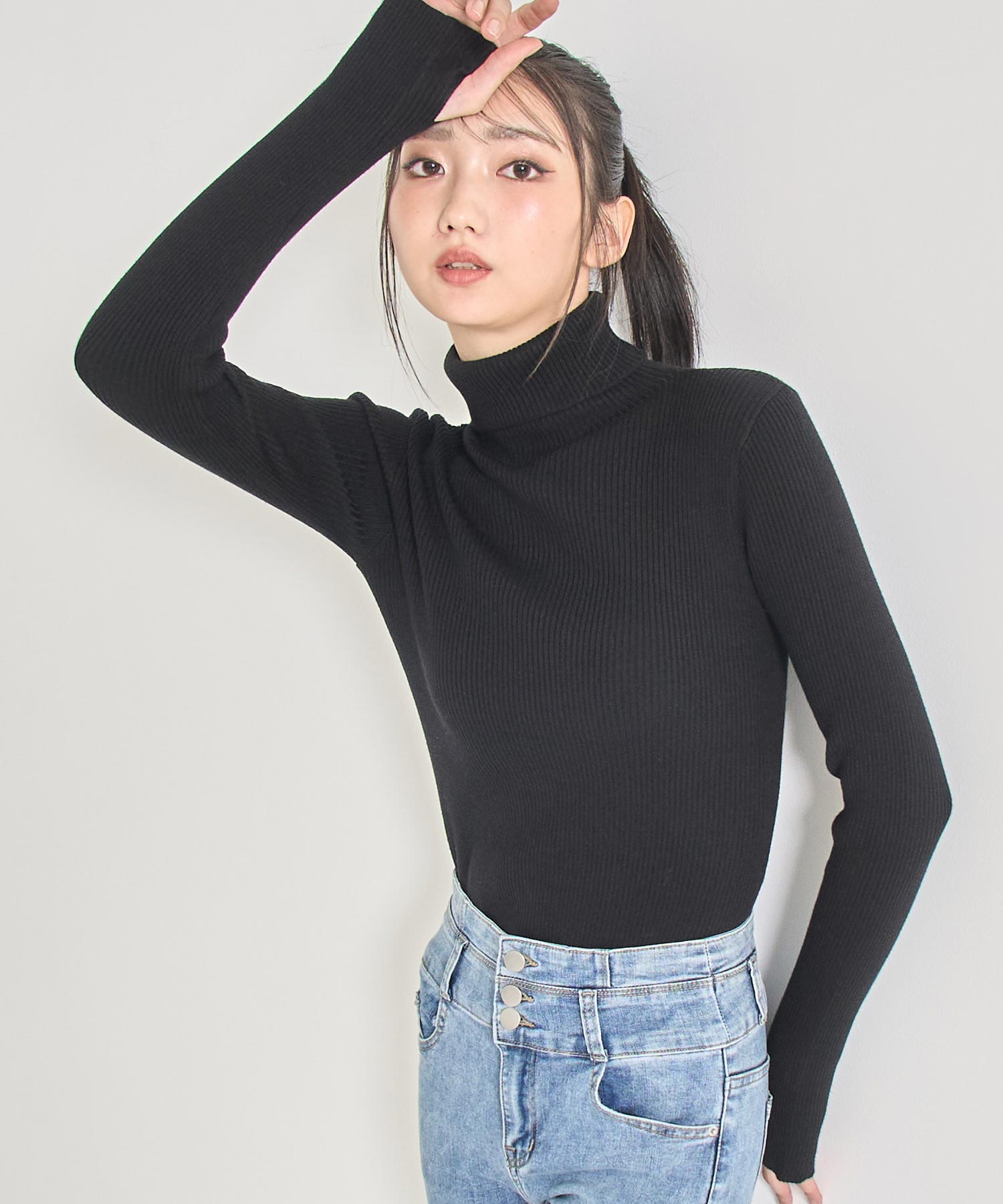 程よい厚みのリブ素材がボディラインを美しく引き立てるタートルネックニット。