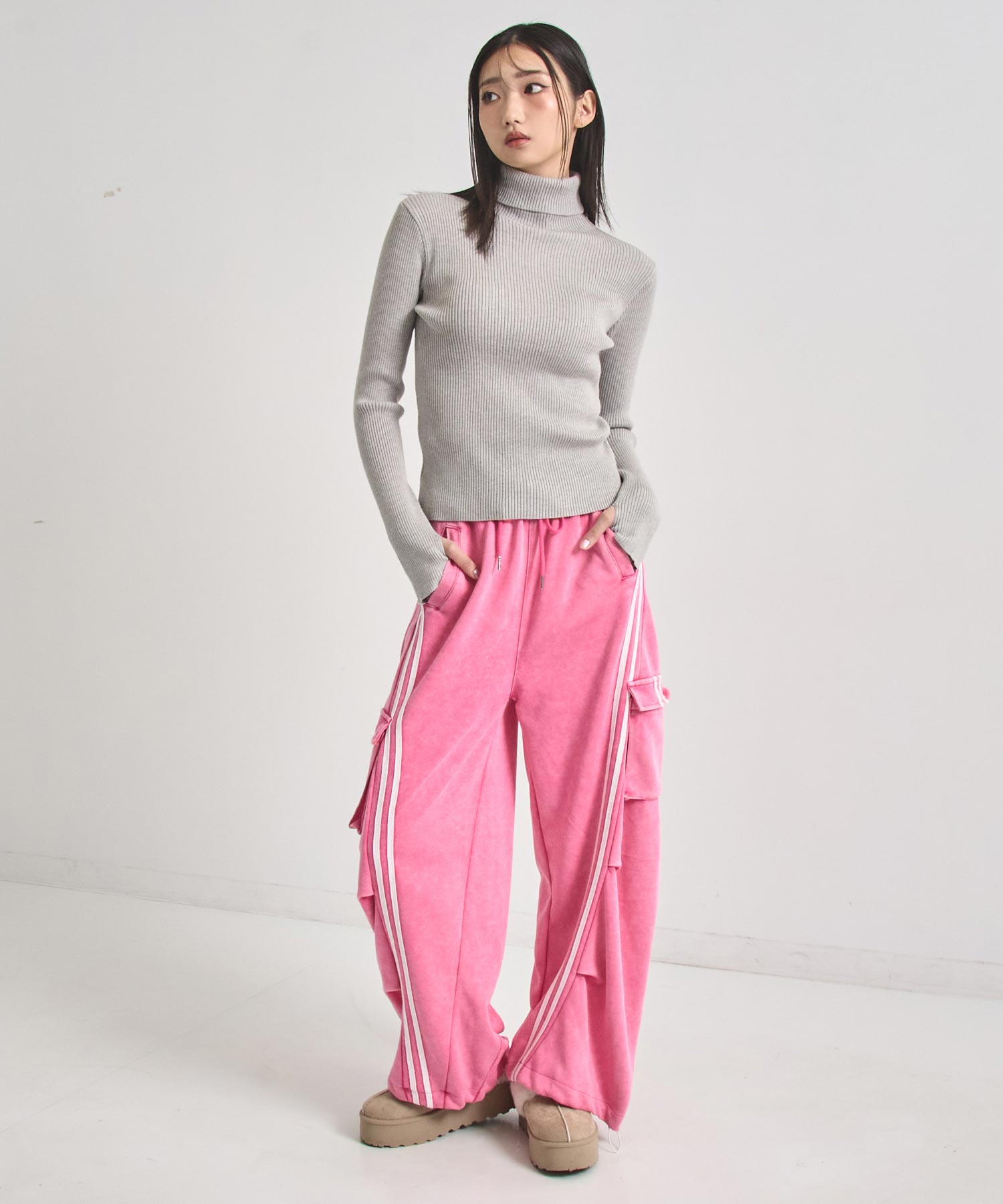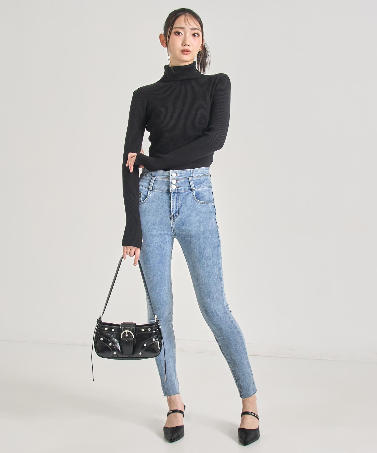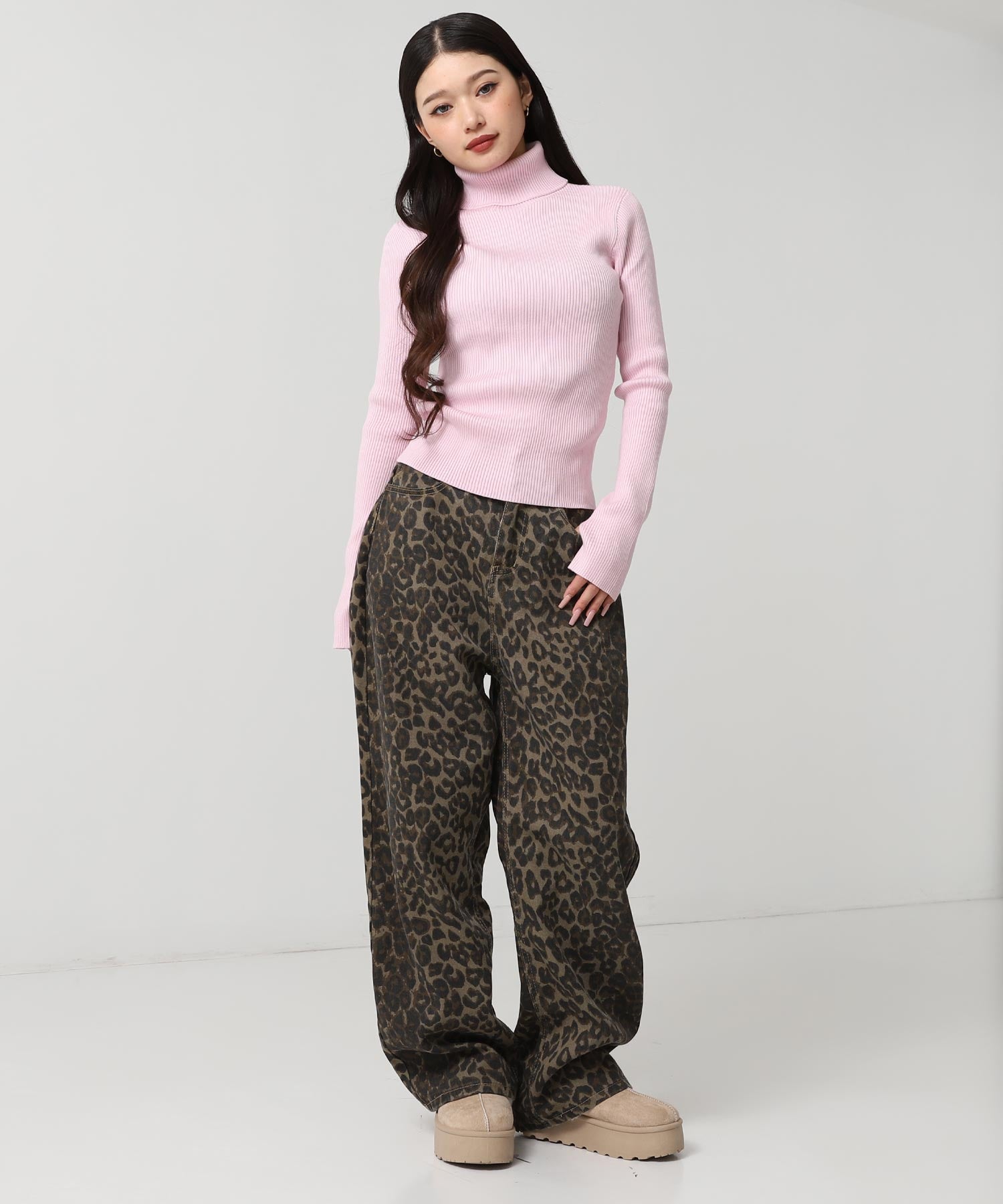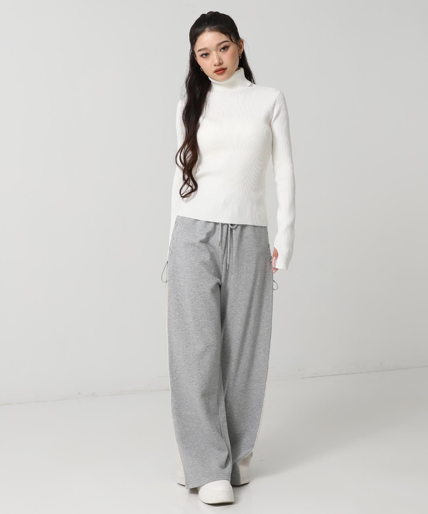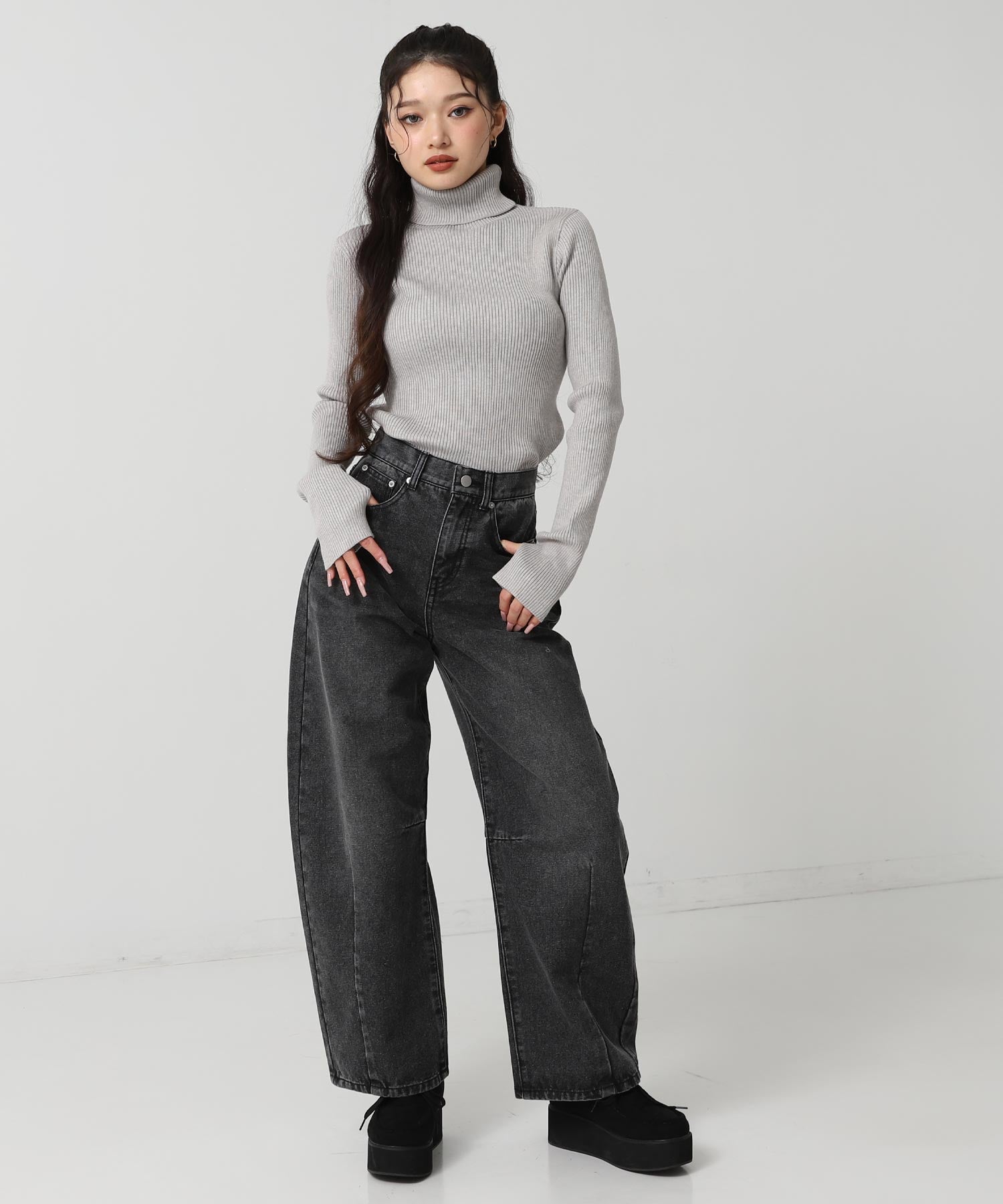 程よい厚みのリブ素材がボディラインを美しく引き立てるタートルネックニット。