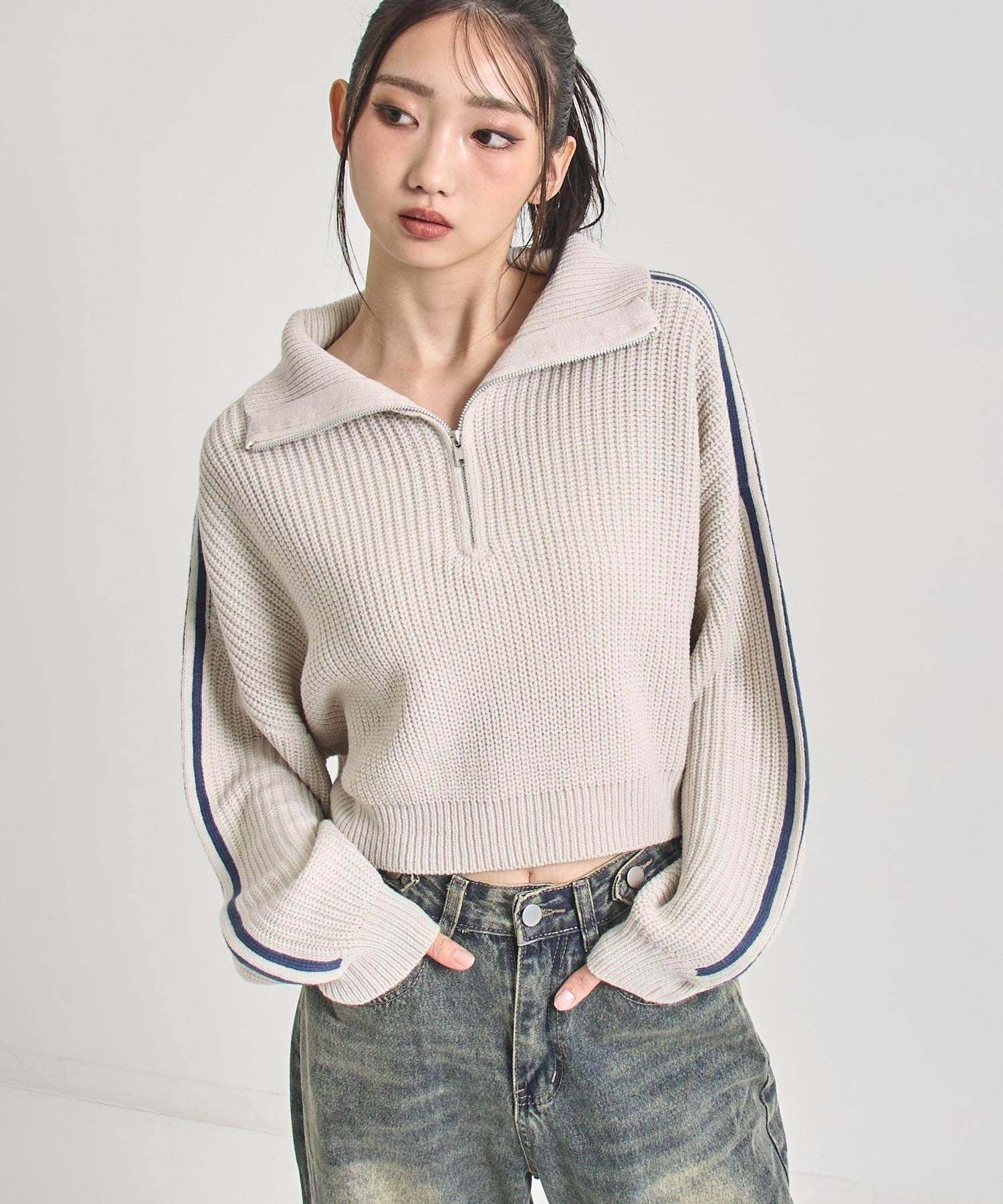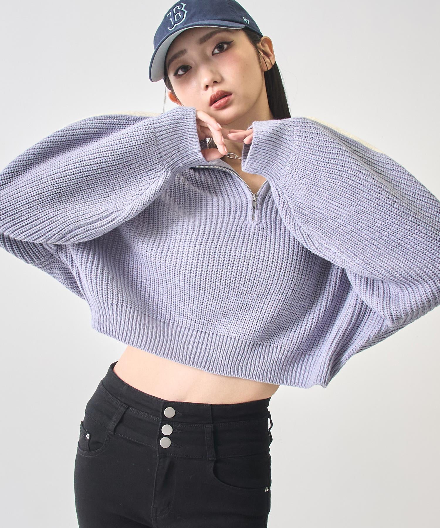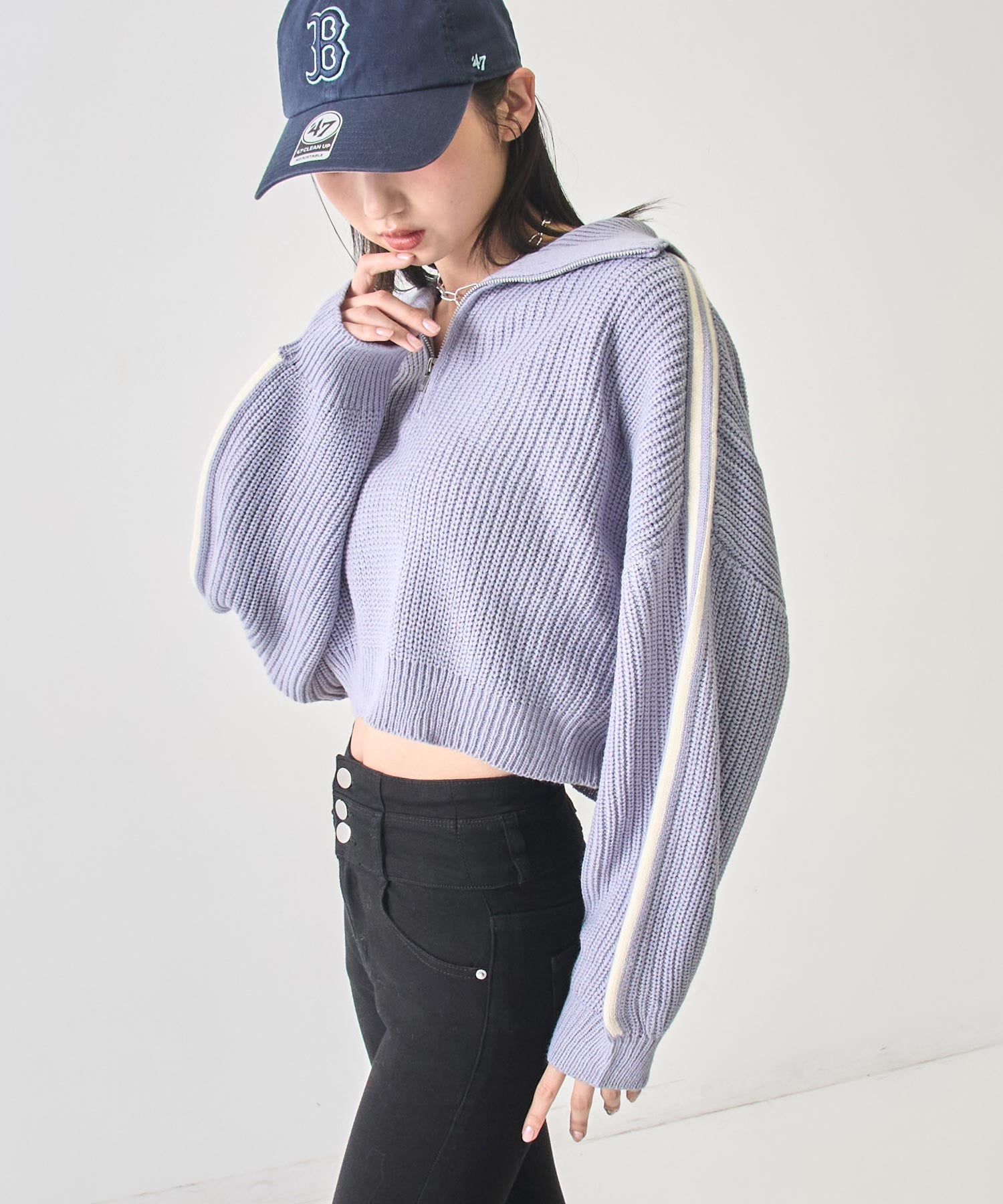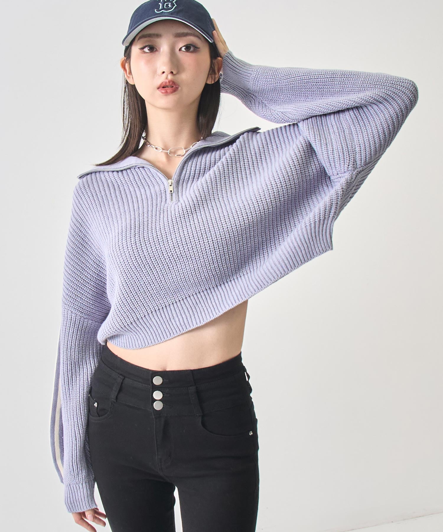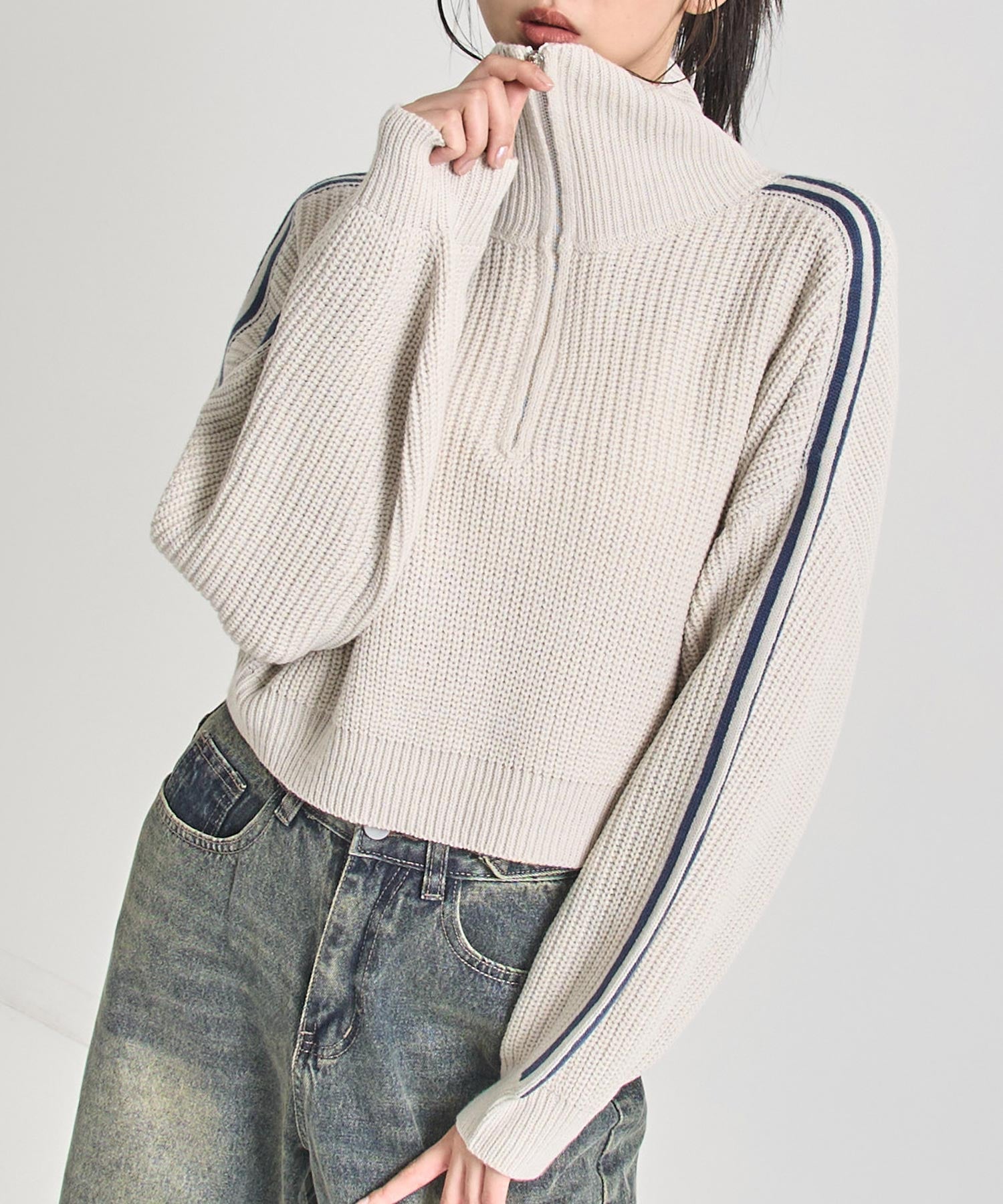 ストリート×ガーリーな抜け感を纏う、ラインで差をつけるハーフジップニット。