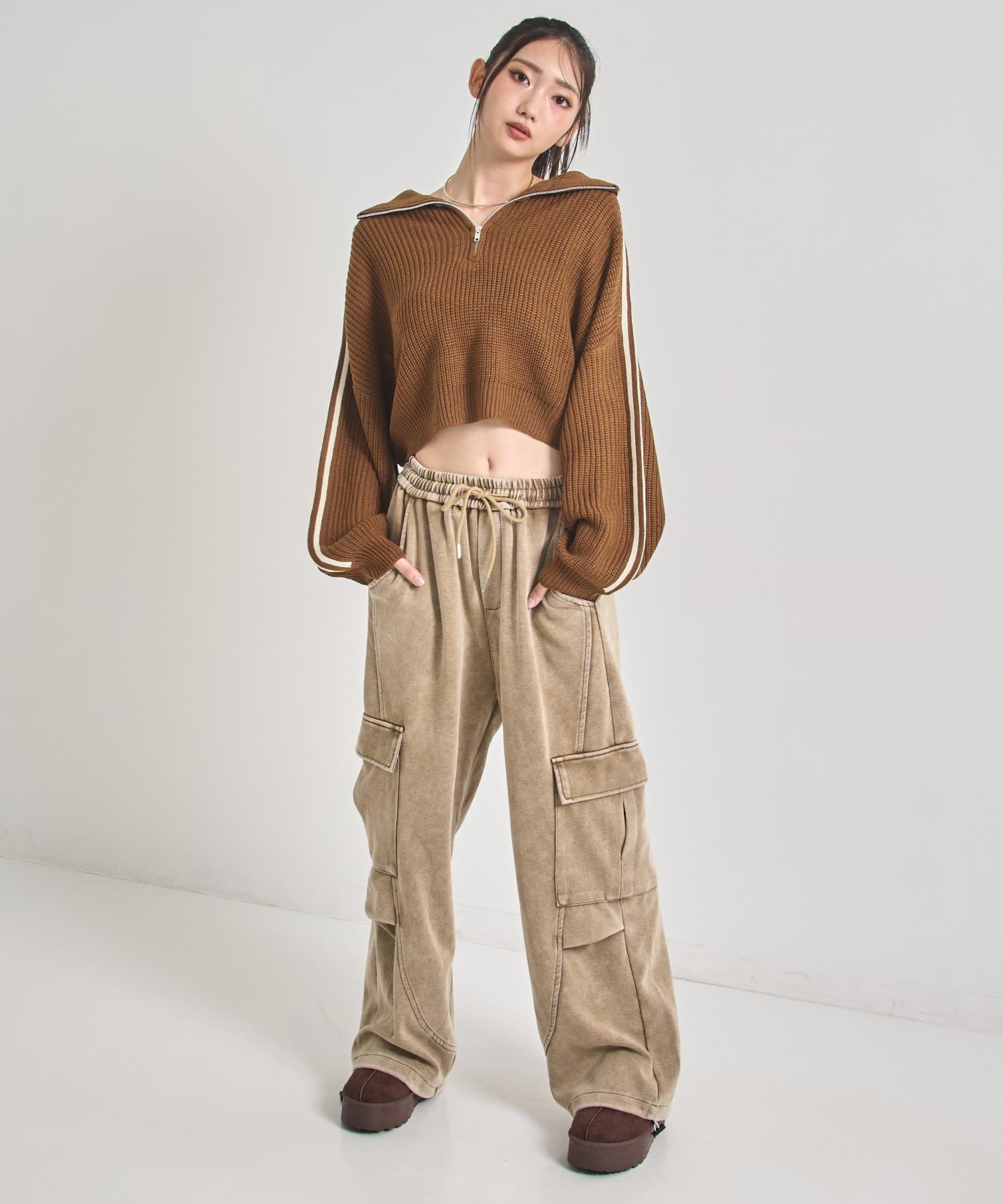 ゆるっと感とスタイルアップを両立する、トレンドど真ん中のハーフジップニット。