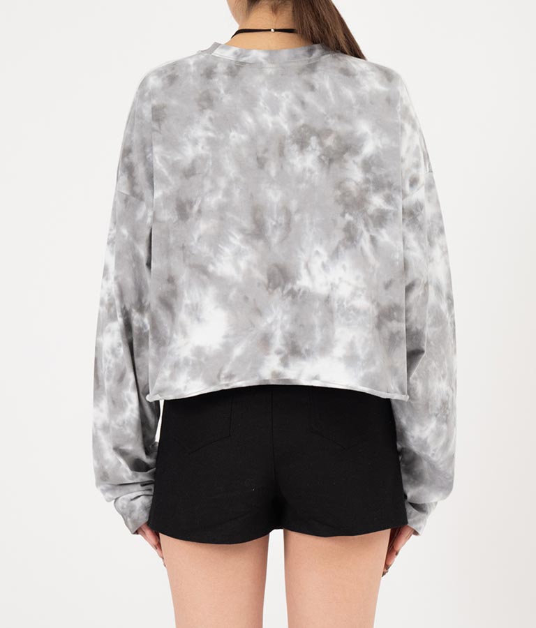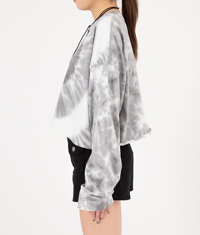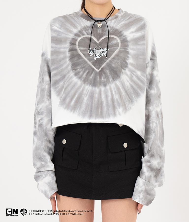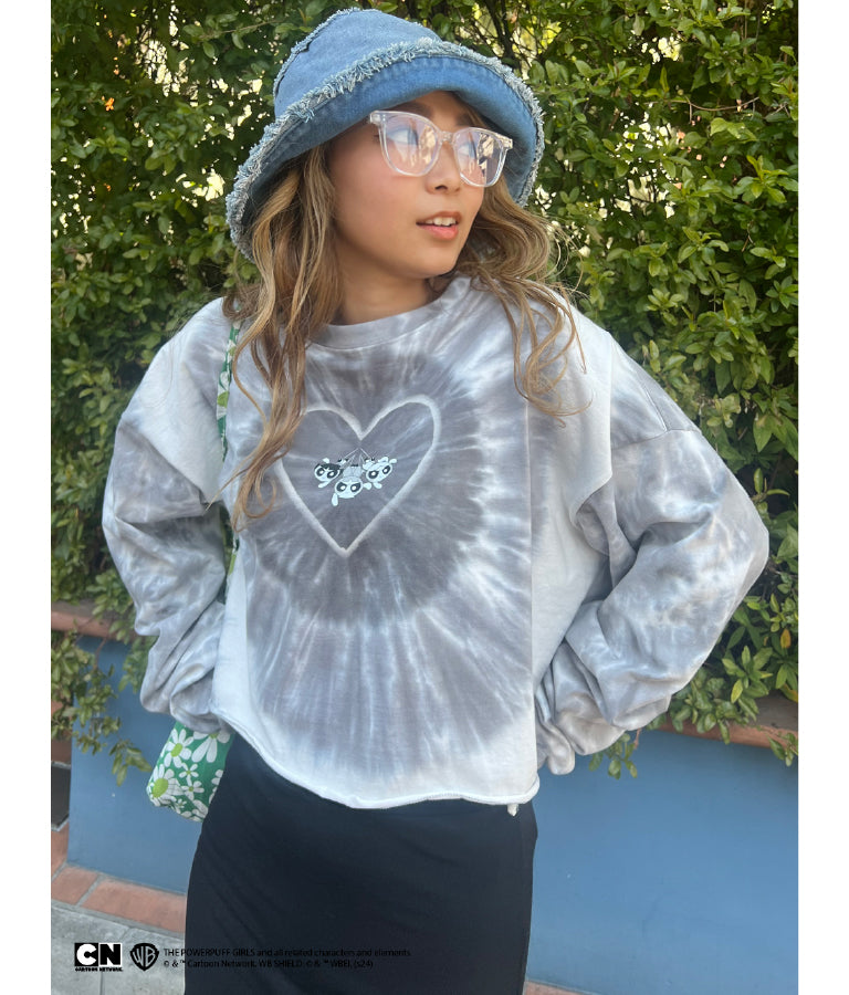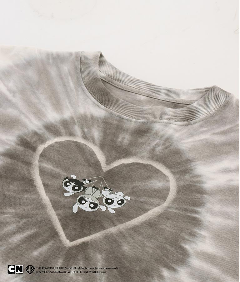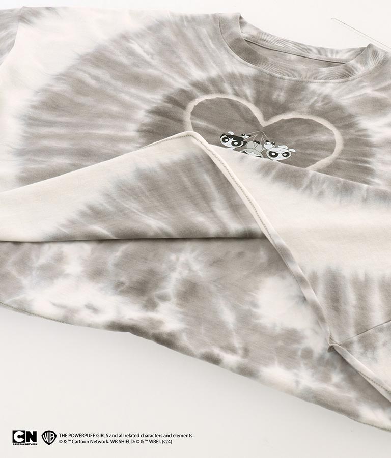 フロントのハートの中にキャラクターがプリントされたタイダイ柄のトップス。