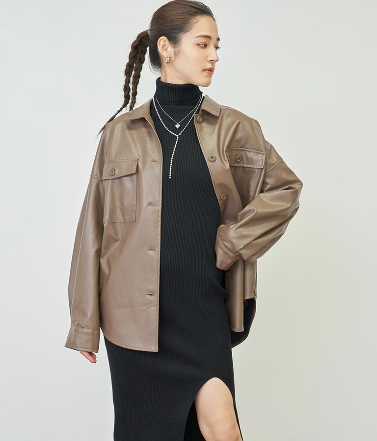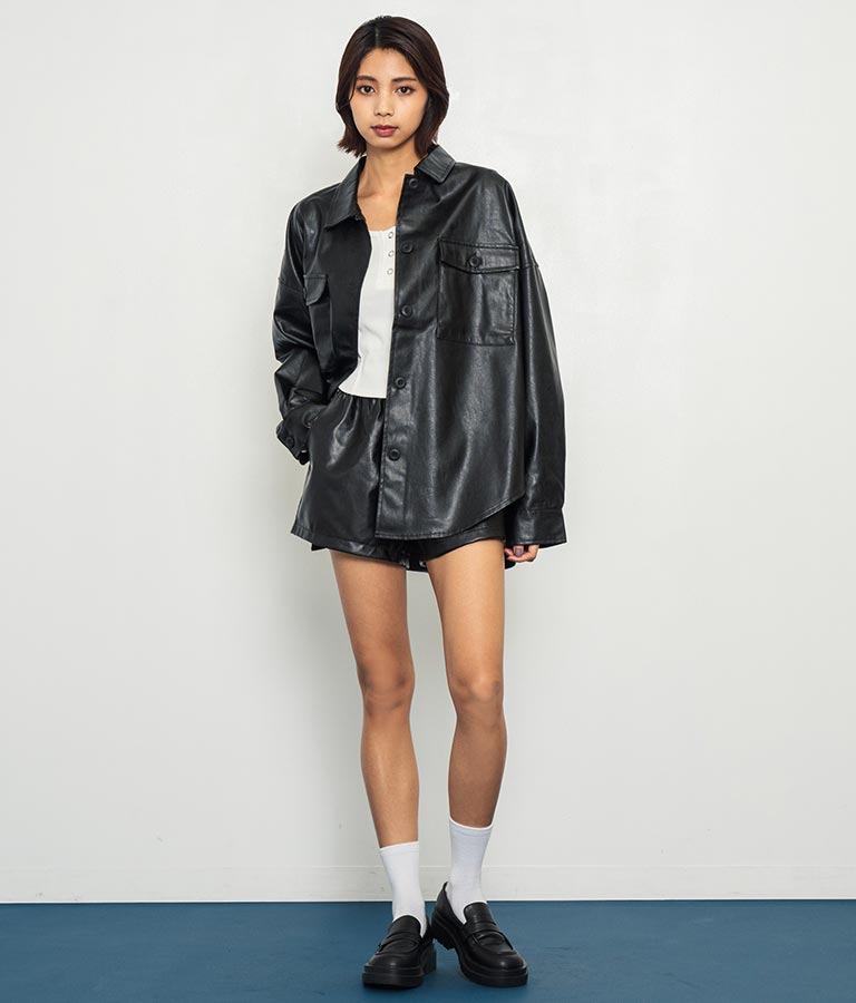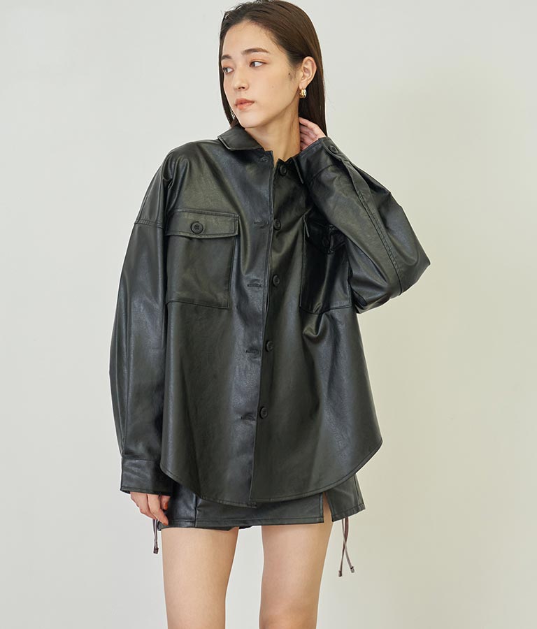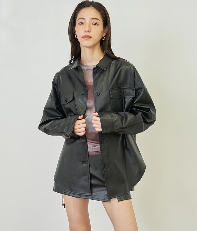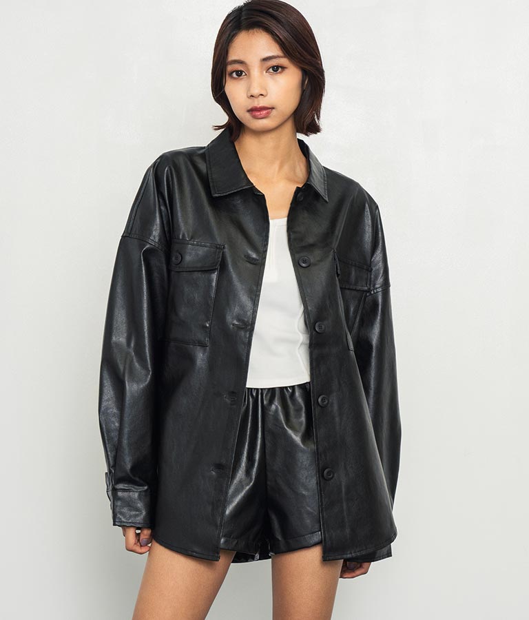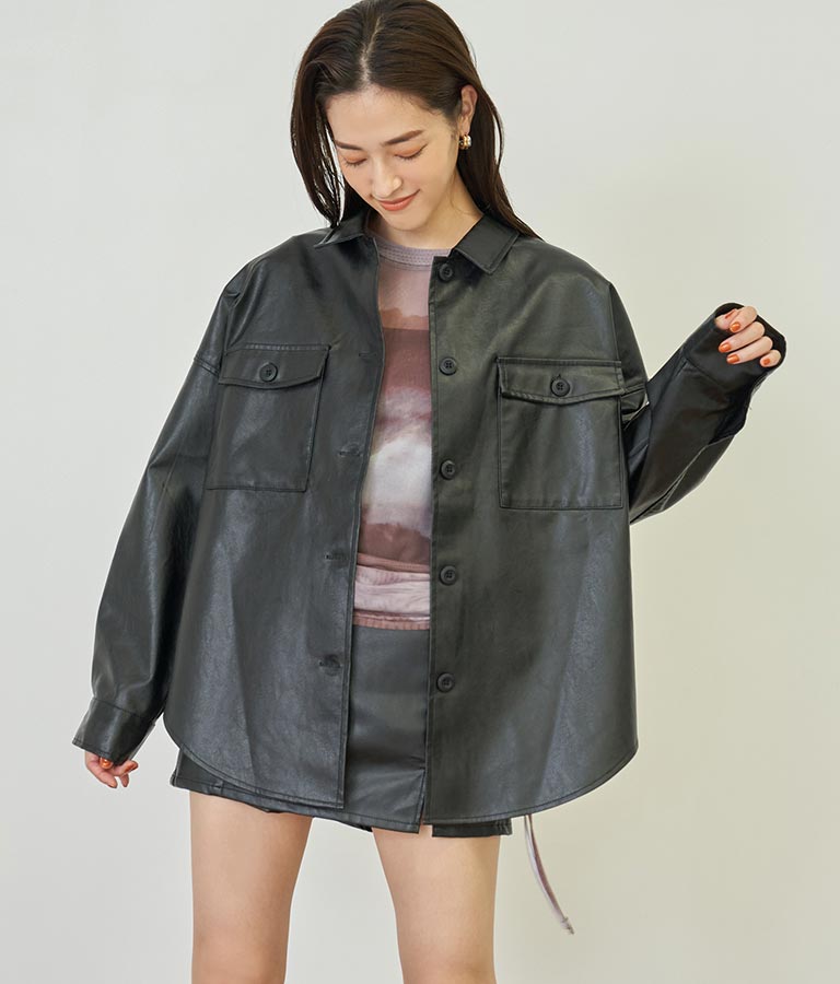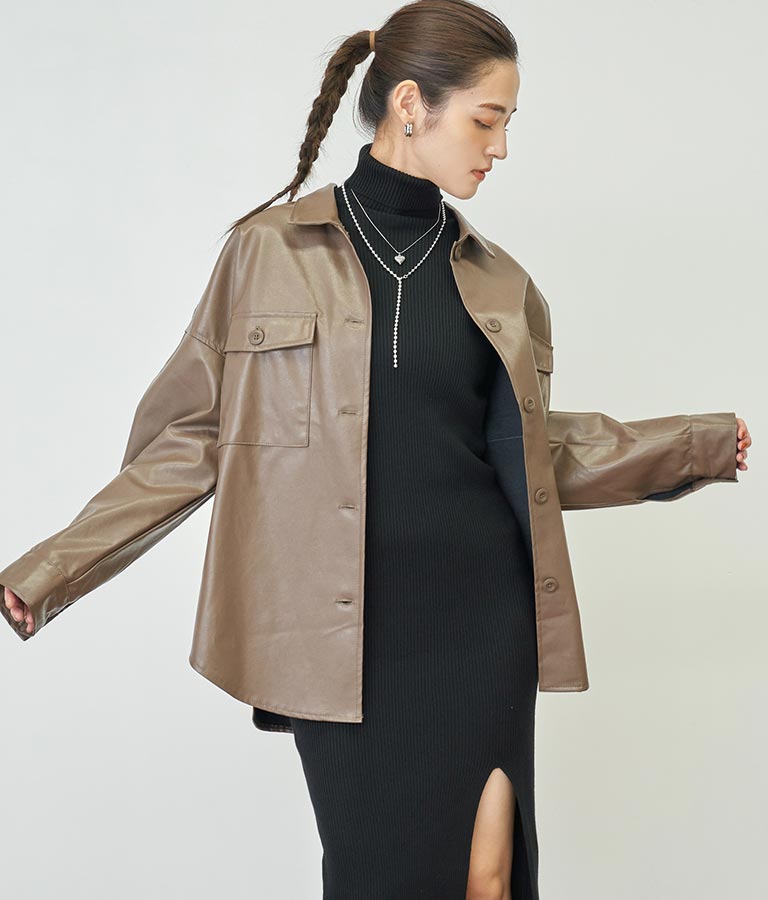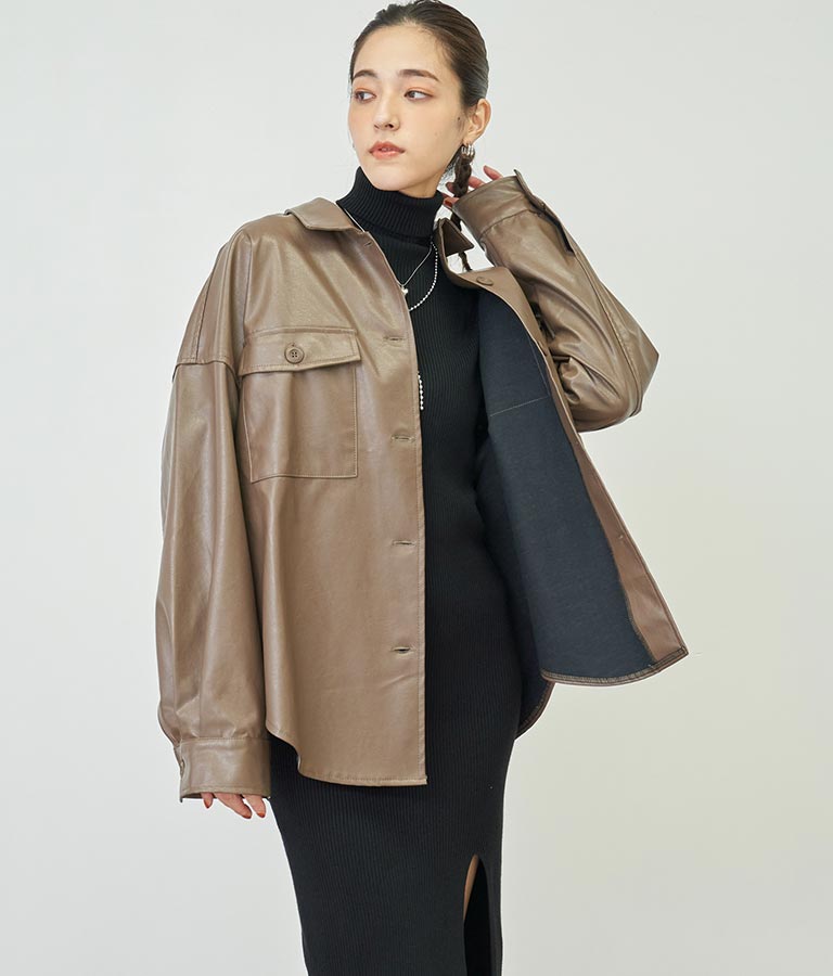 上品なフェイクレザーが大人の装いに寄り添い、さらっと合わせやすいシャツジャケット。