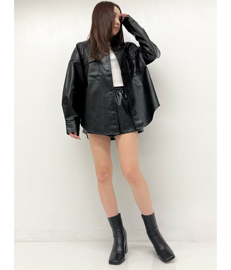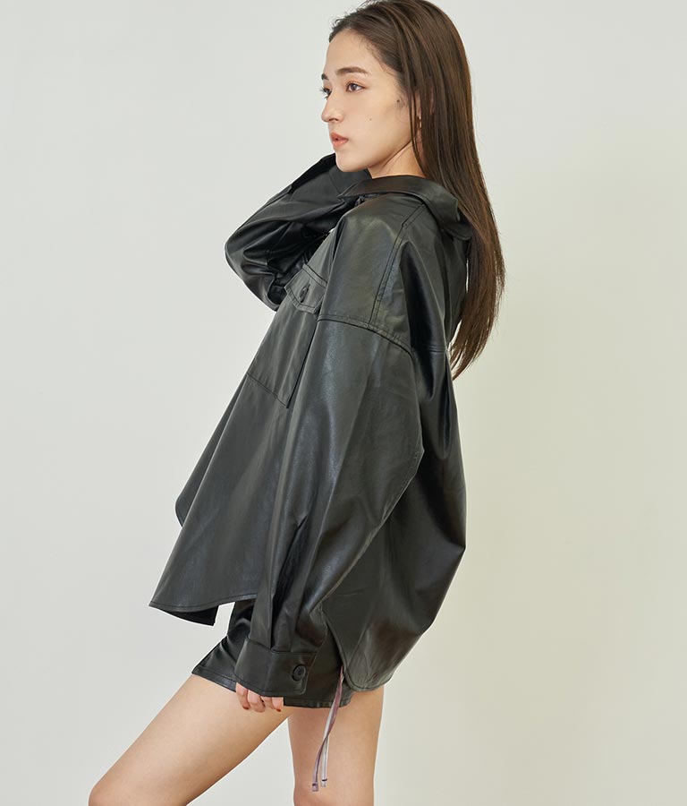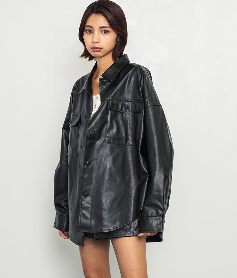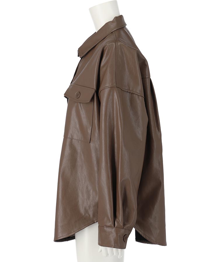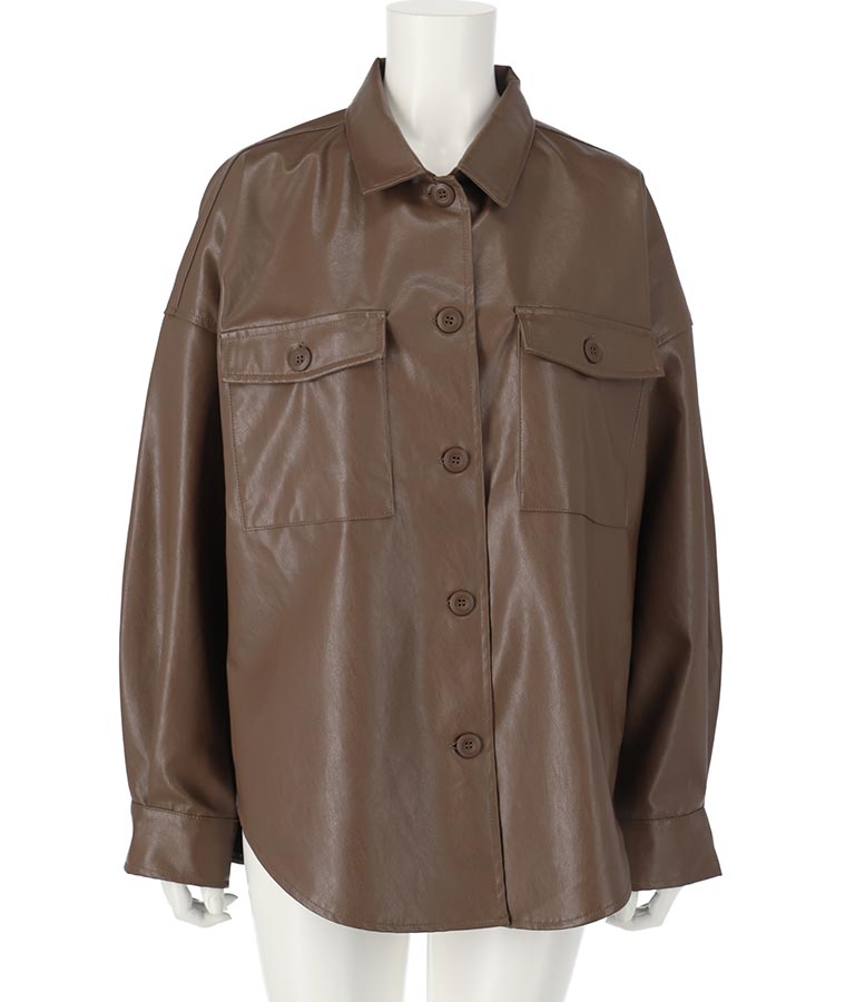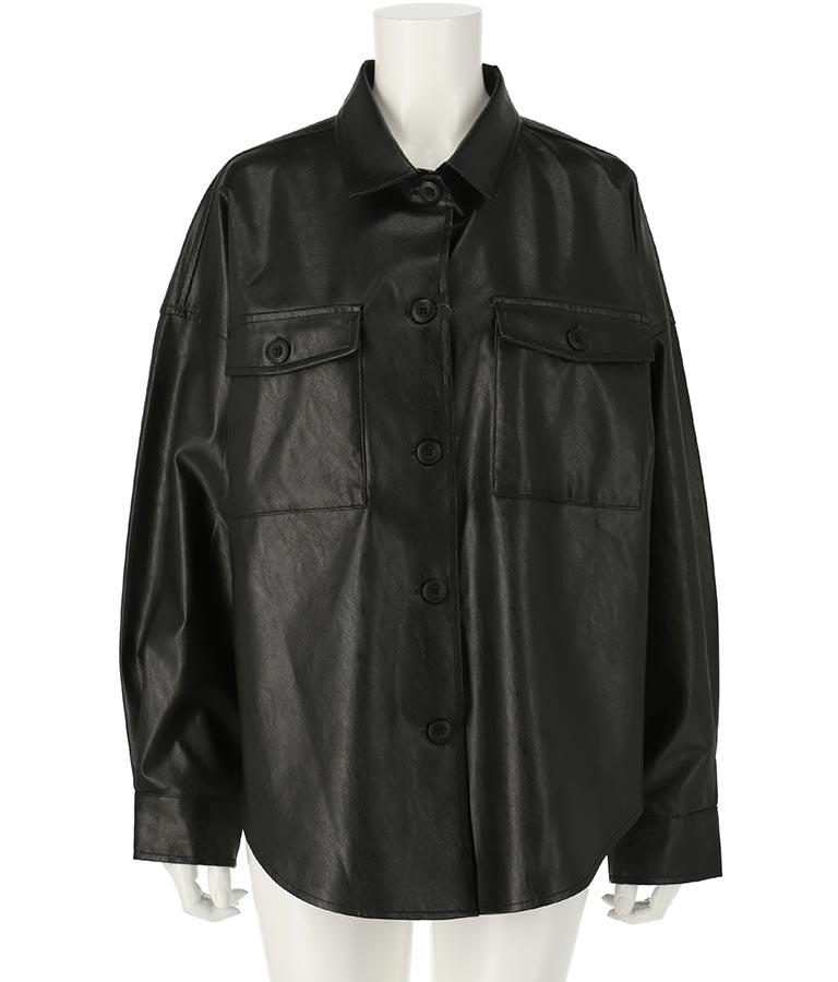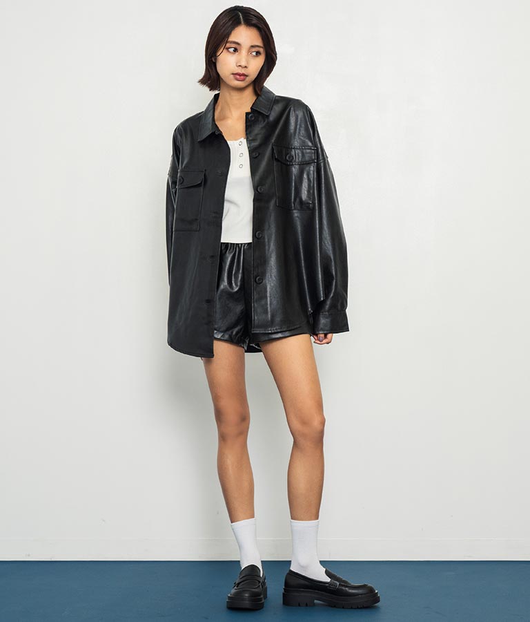 上品なフェイクレザーが大人の装いに寄り添い、さらっと合わせやすいシャツジャケット。