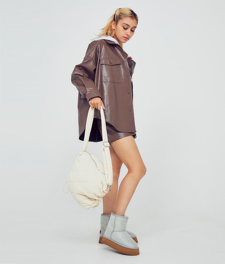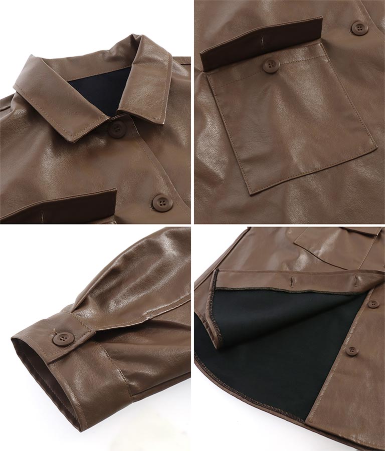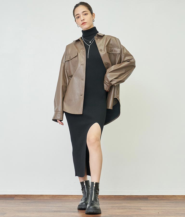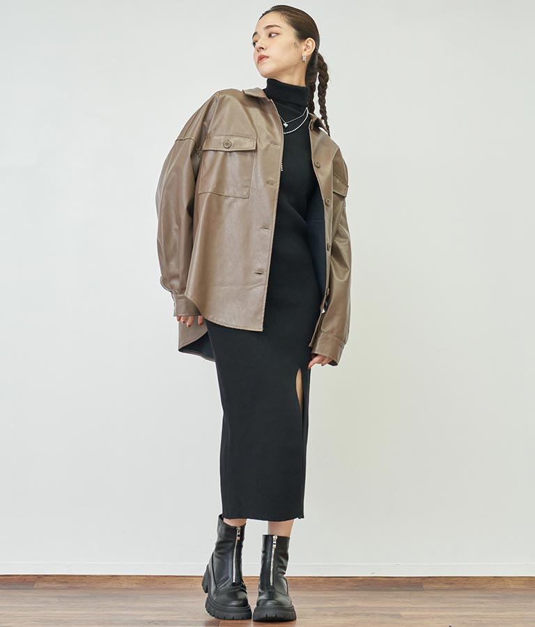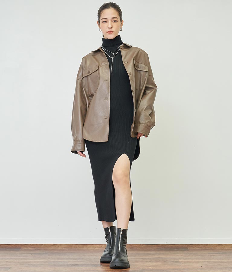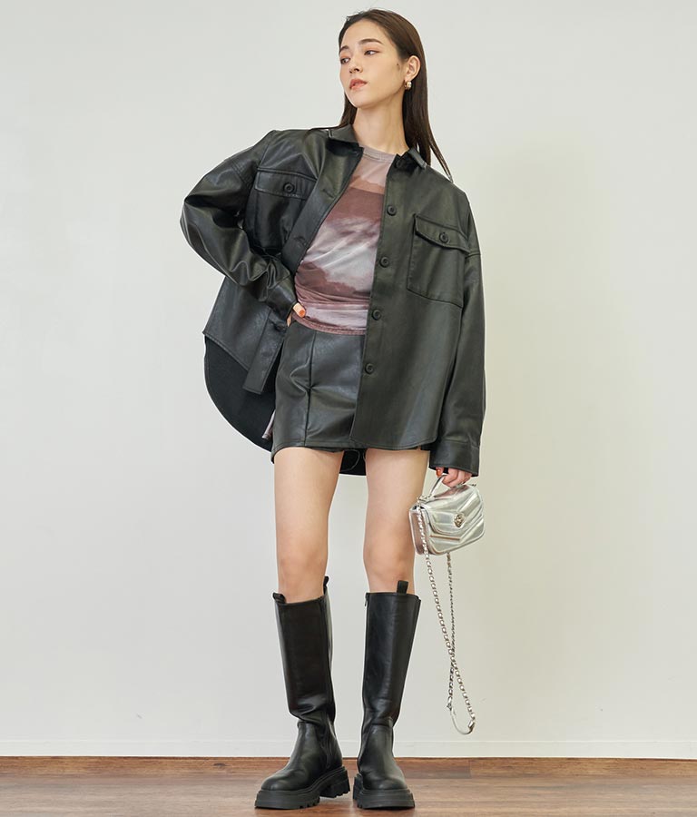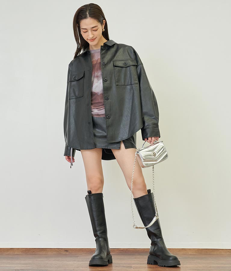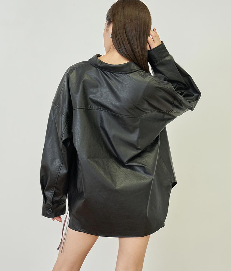 上品なフェイクレザーが大人の装いに寄り添い、さらっと合わせやすいシャツジャケット。