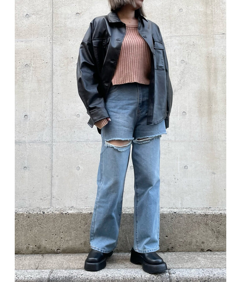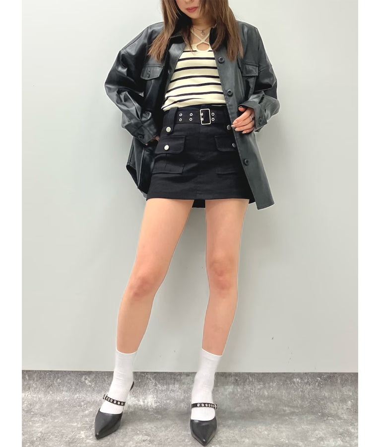 同素材の【フェイクレザースリットスカパン】とセットアップで着ても◎