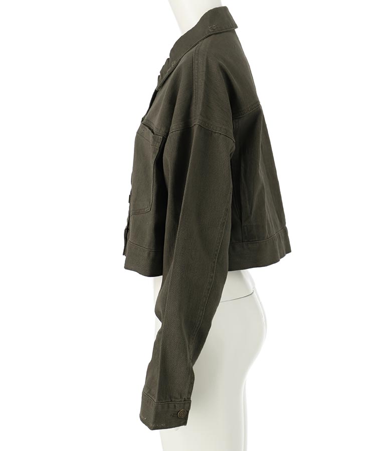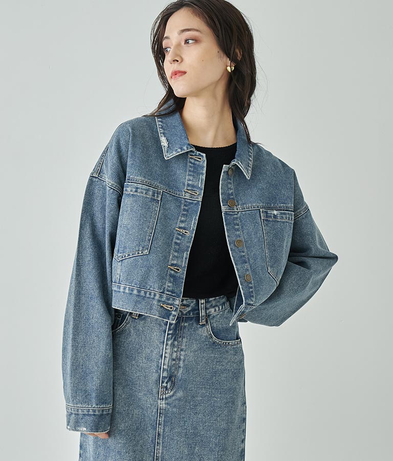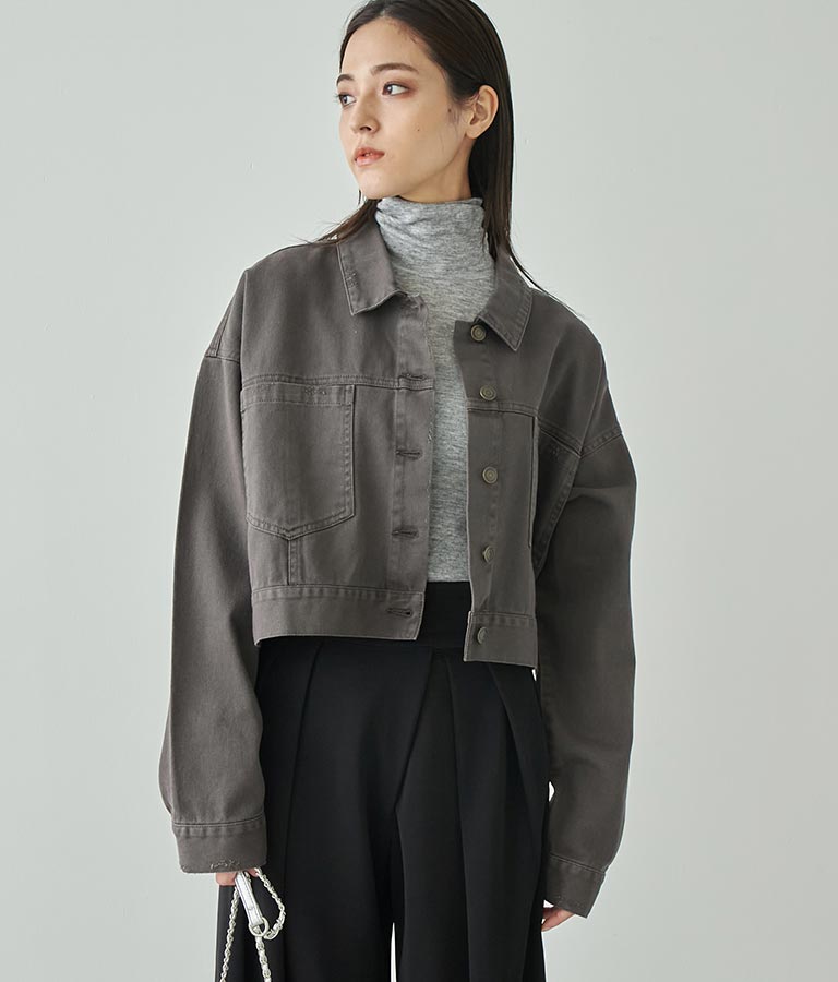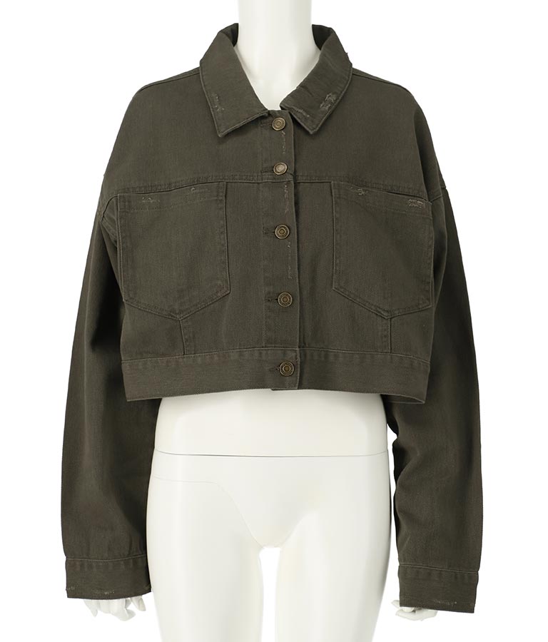 ダメージ加工を施した、ヴィンテージ感たっぷりなクロップドジャケット。