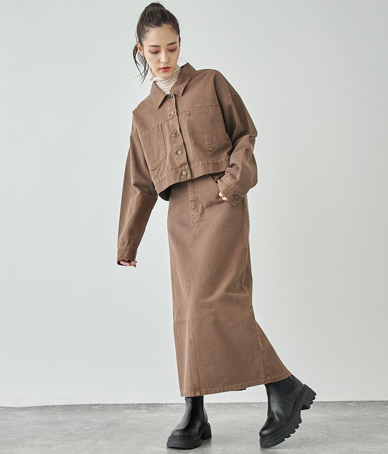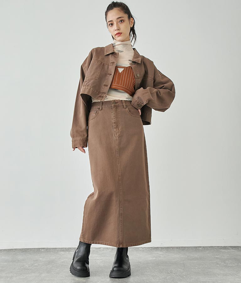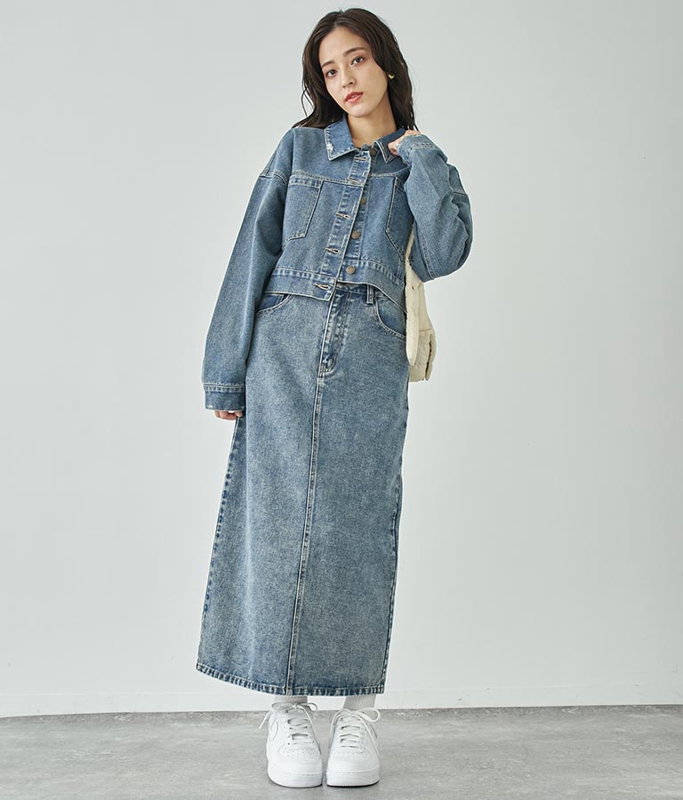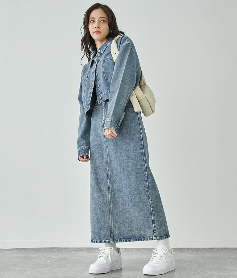 同素材を使用した【デニムバックスリットロングスカート】とのセットアップでの着こなしもおススメ。