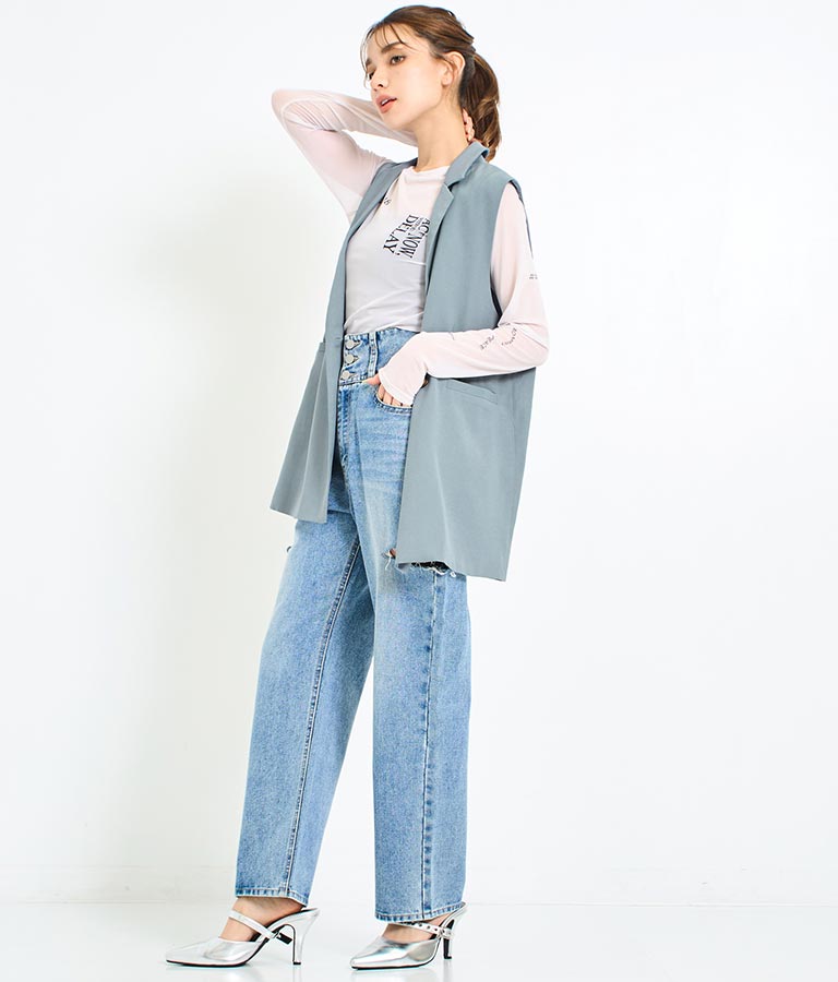 ハンサムな印象にコーデを引き締めるテーラードベスト。