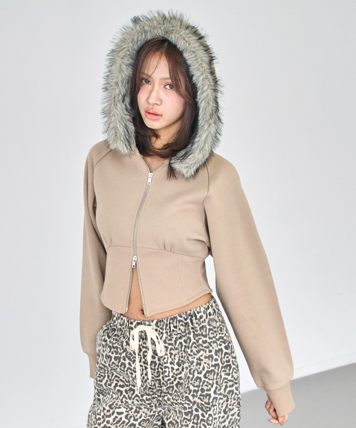 フード部分にはボリュームのあるファーをあしらい、顔まわりを華やかに演出。