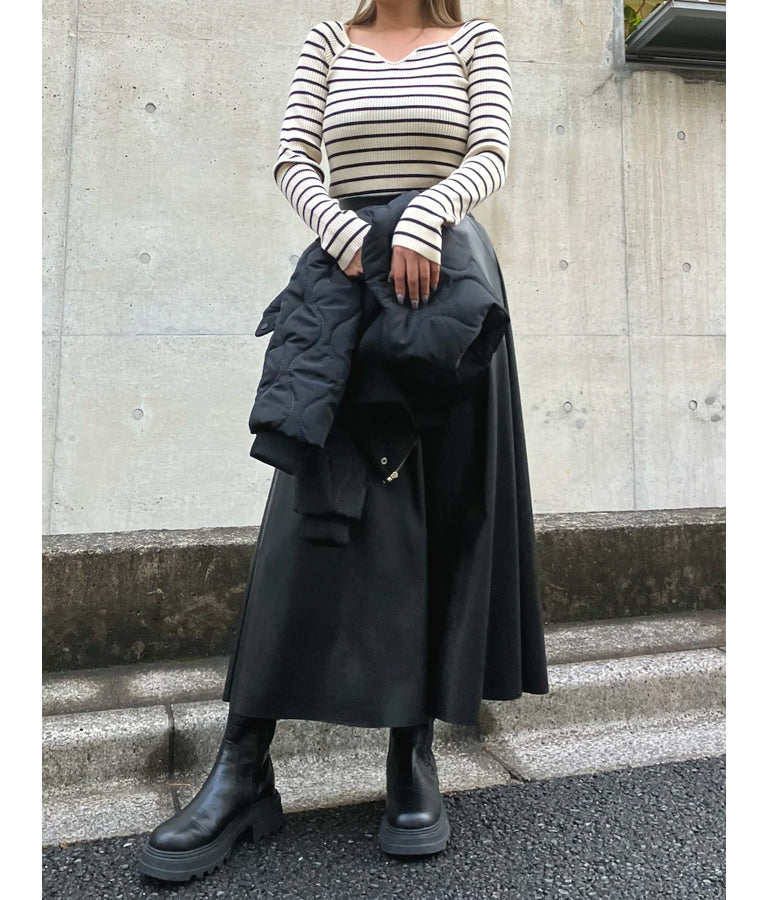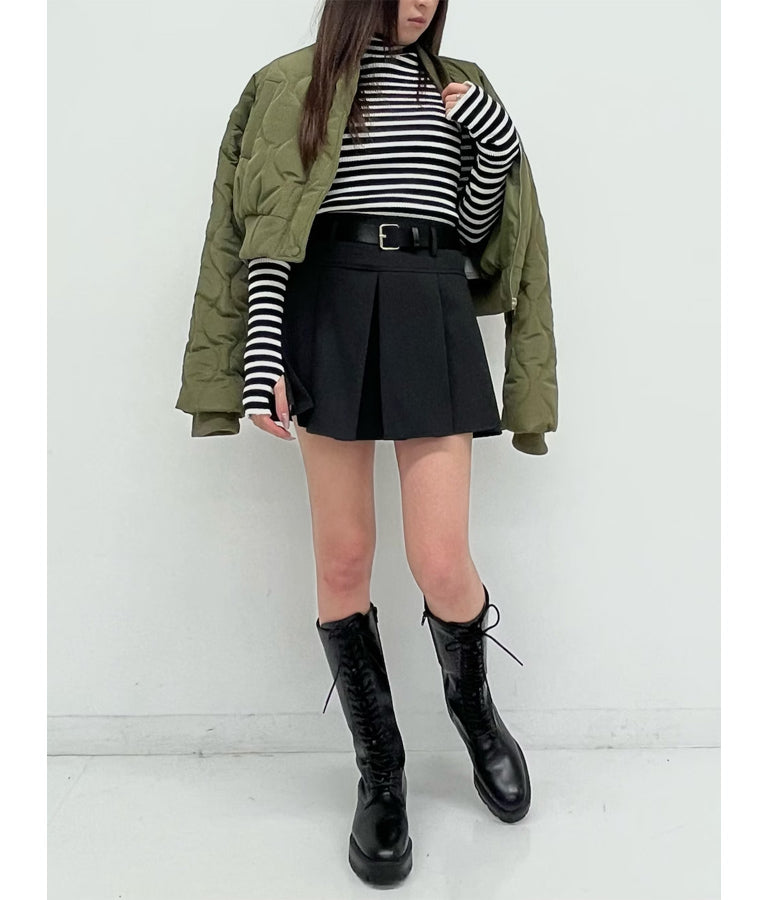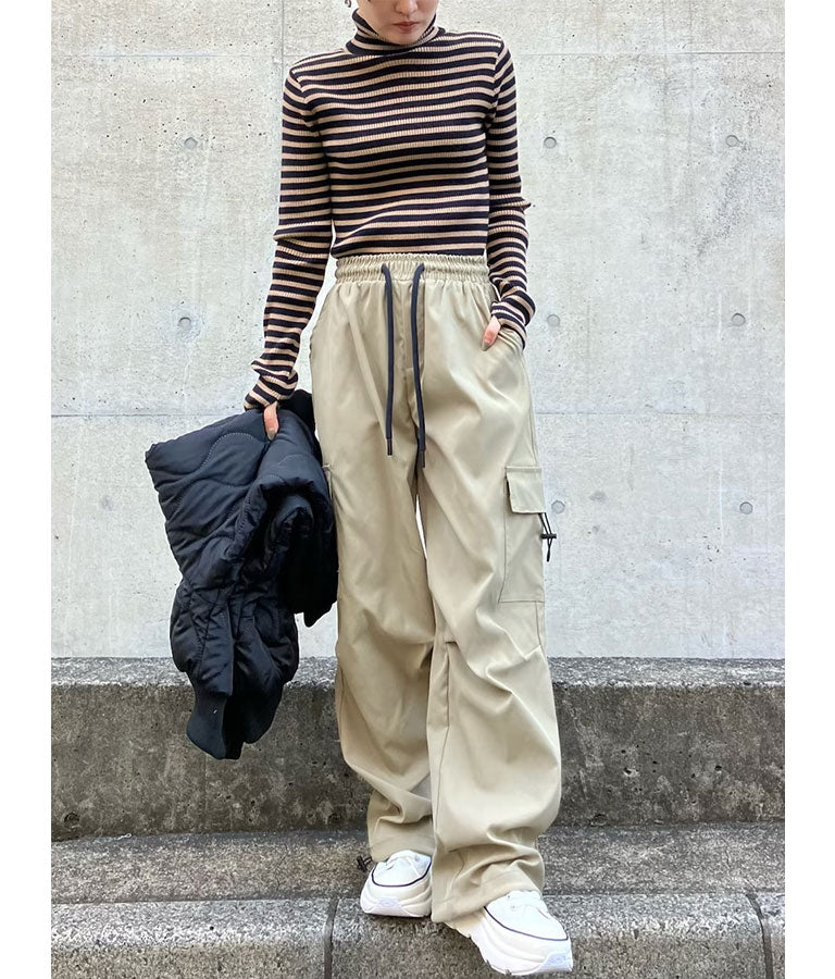 ノーカラーなのでハイネックのトップスやボーダートップスを合わせるのもオススメです。