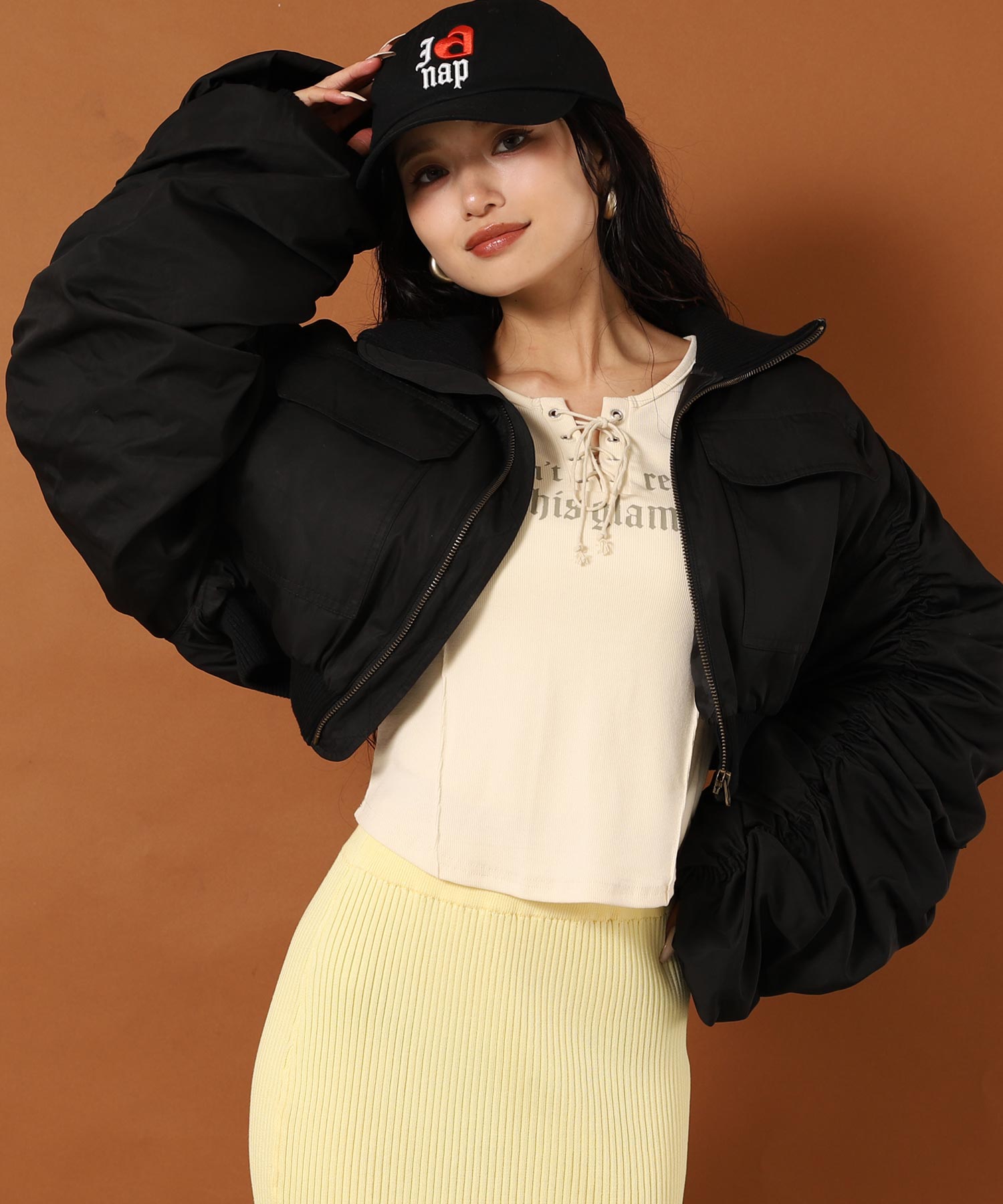 立体感のあるギャザー袖が、コーディネートに抜群のインパクトを与えます。