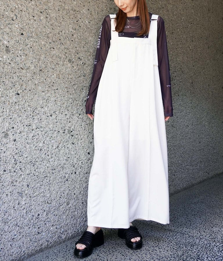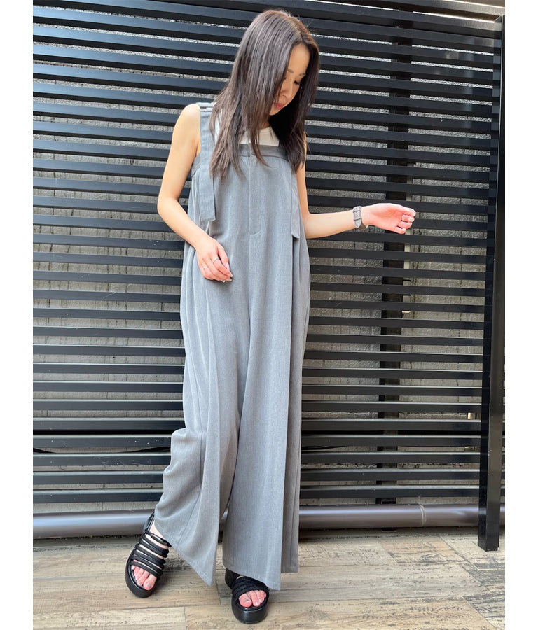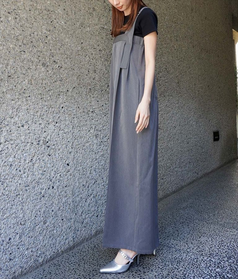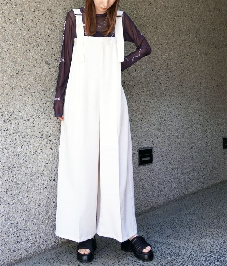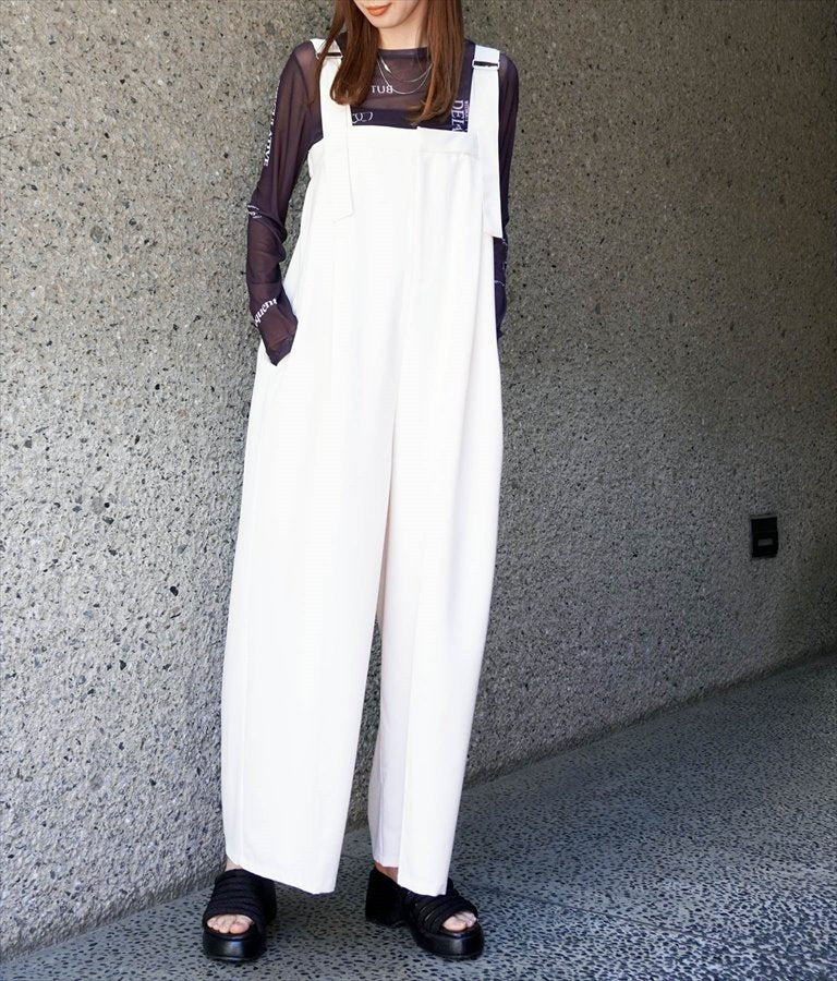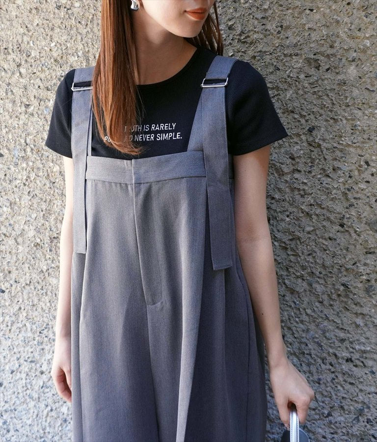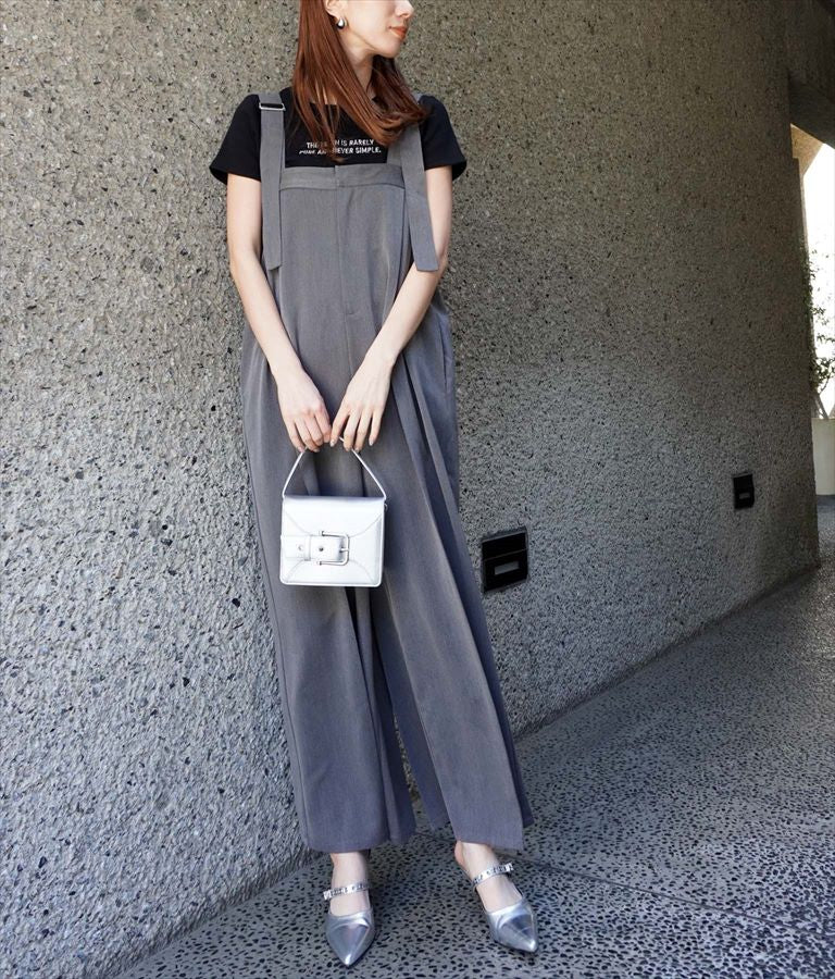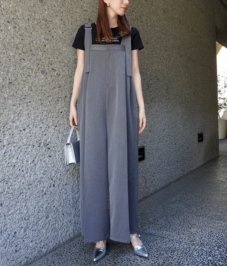 太めのショルダーベルトとシルバーの金具使いがモードな個性派サロペット。