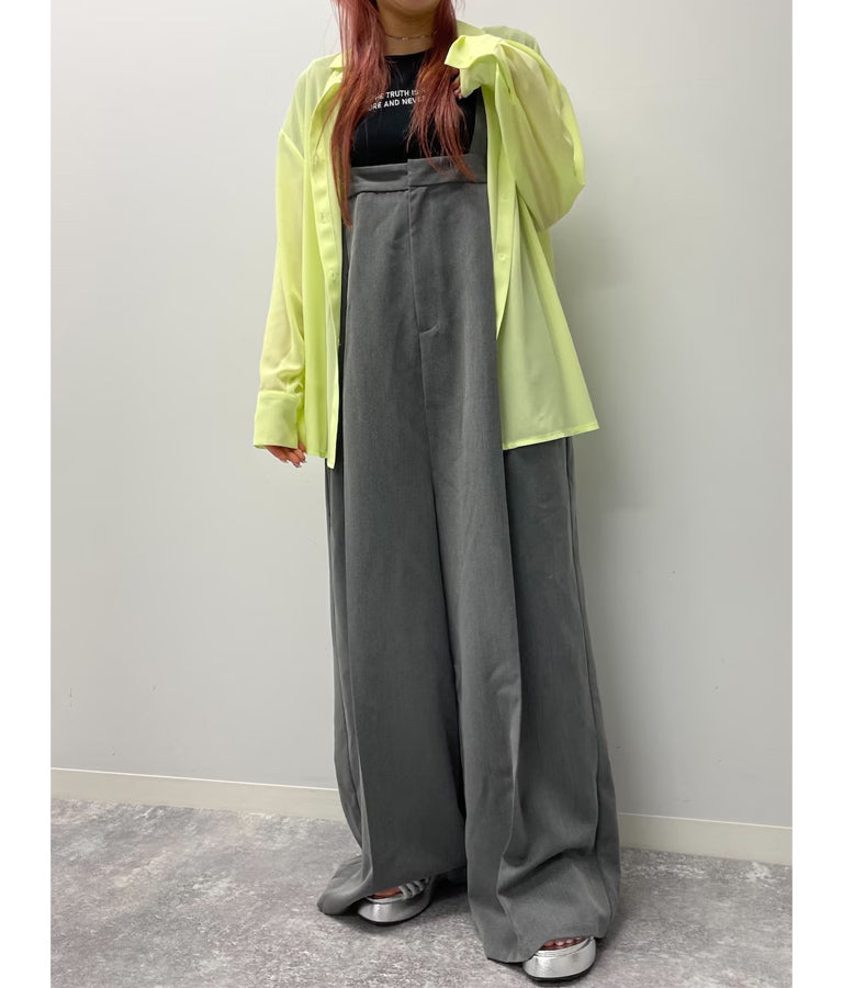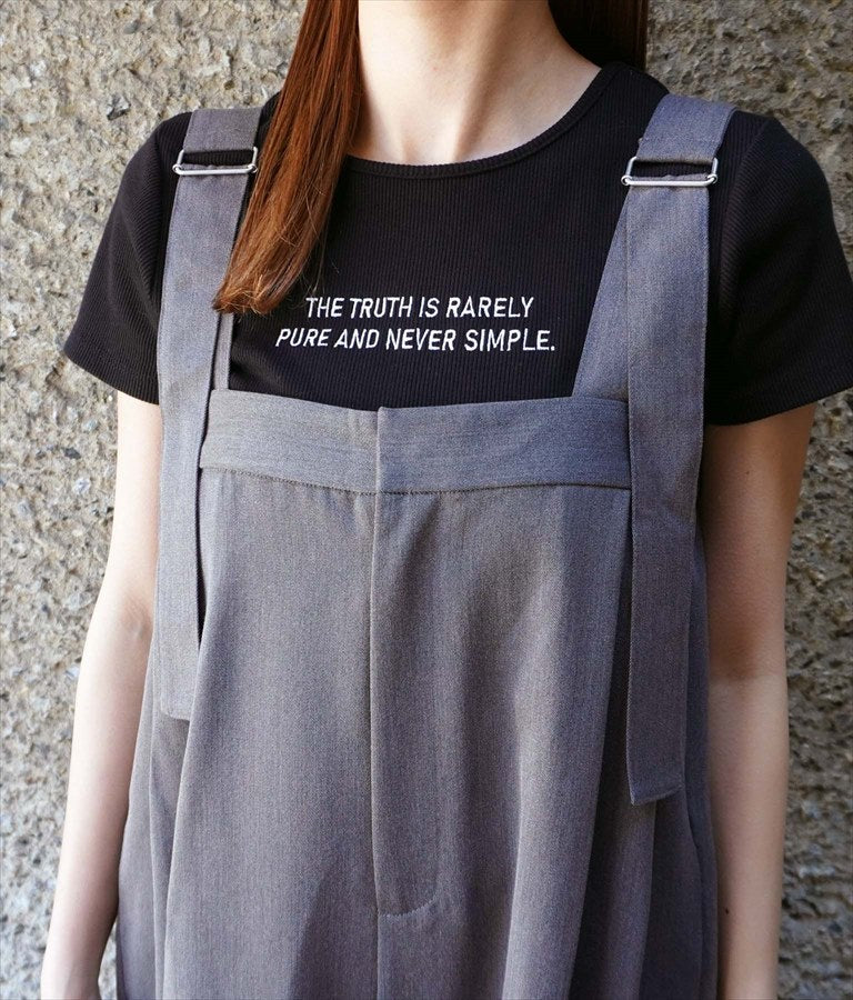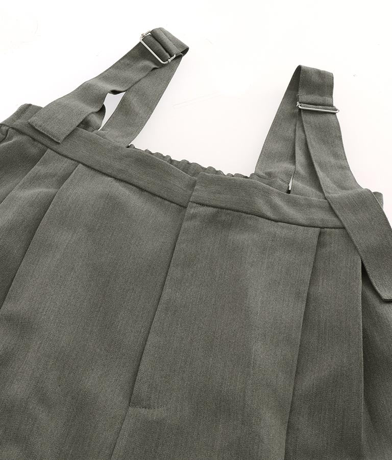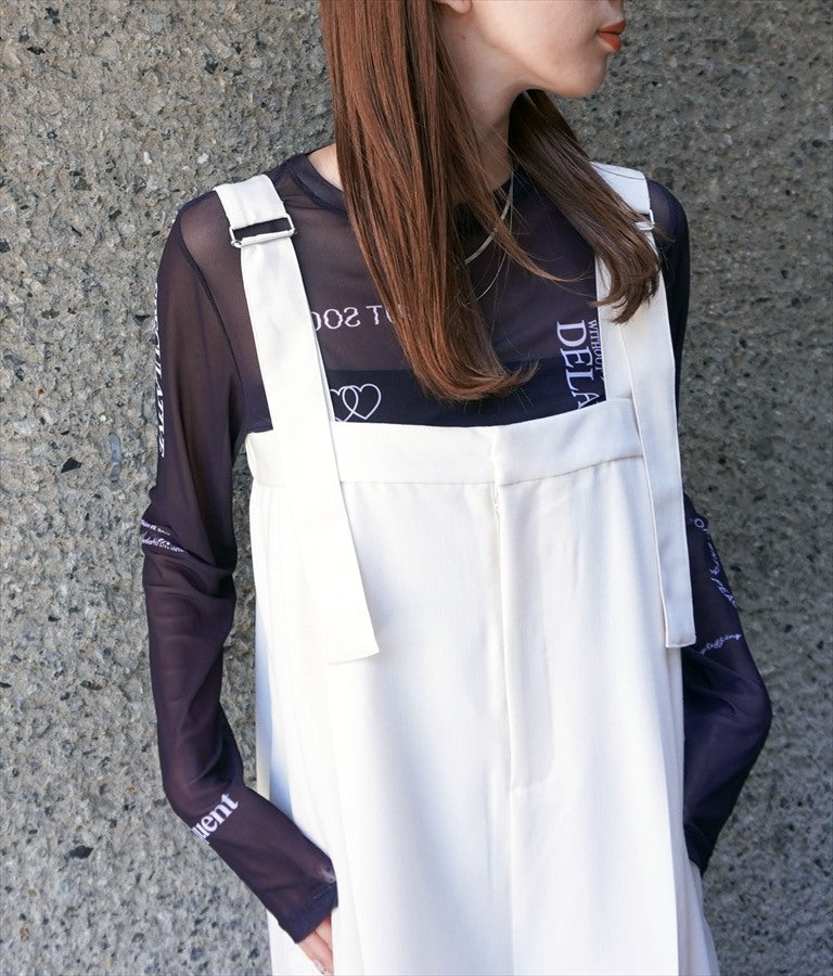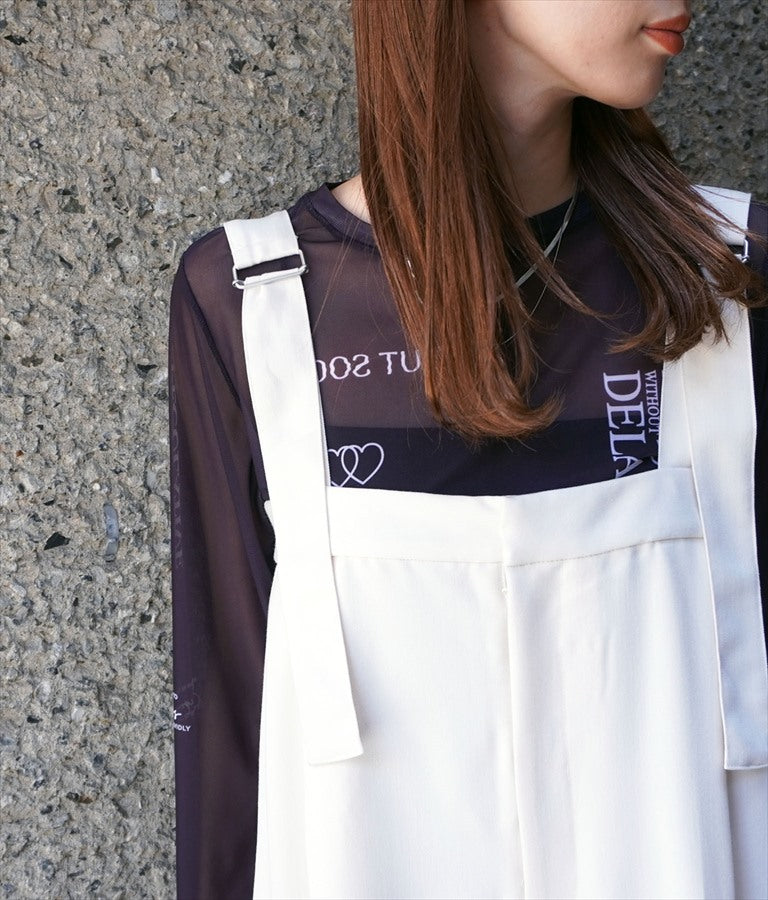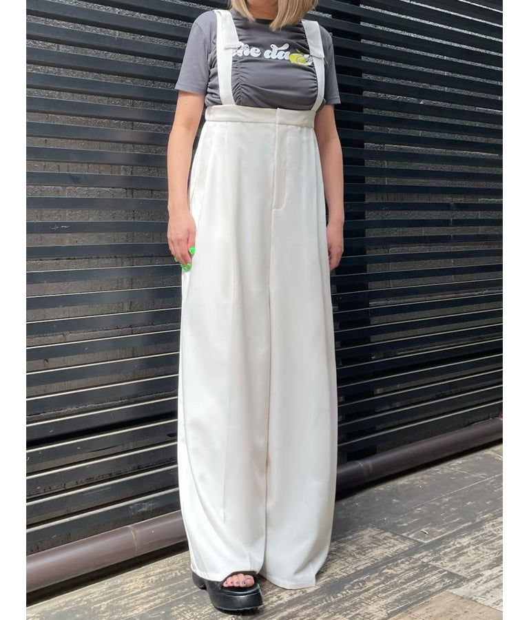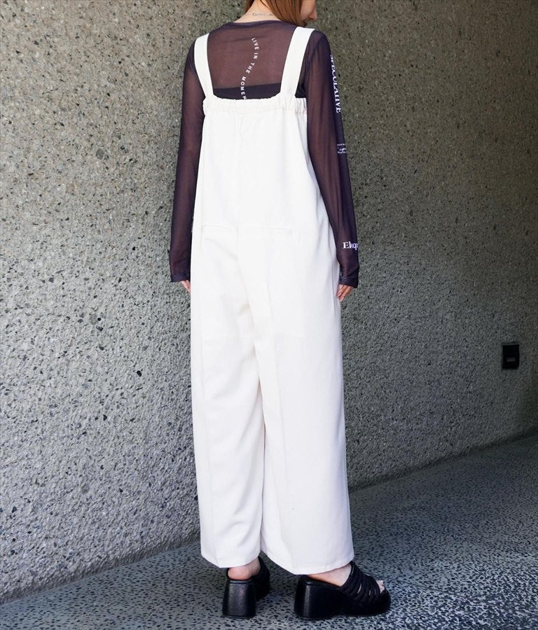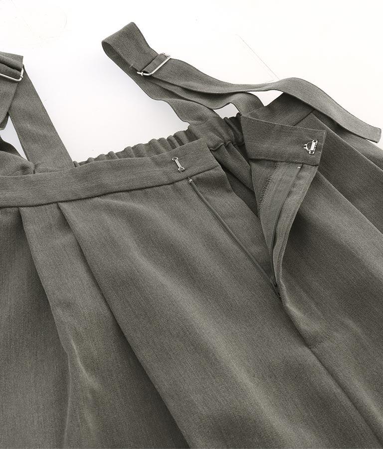 太めのショルダーベルトとシルバーの金具使いがモードな個性派サロペット。