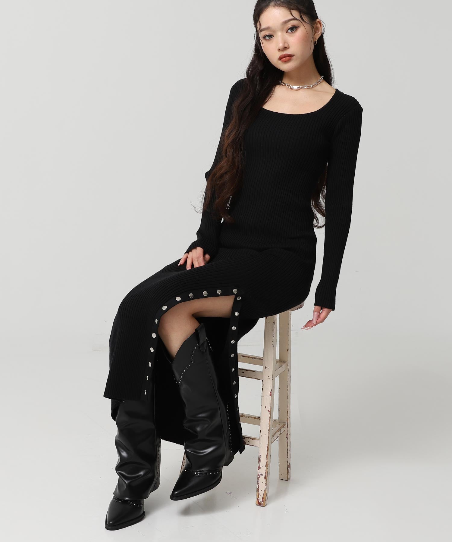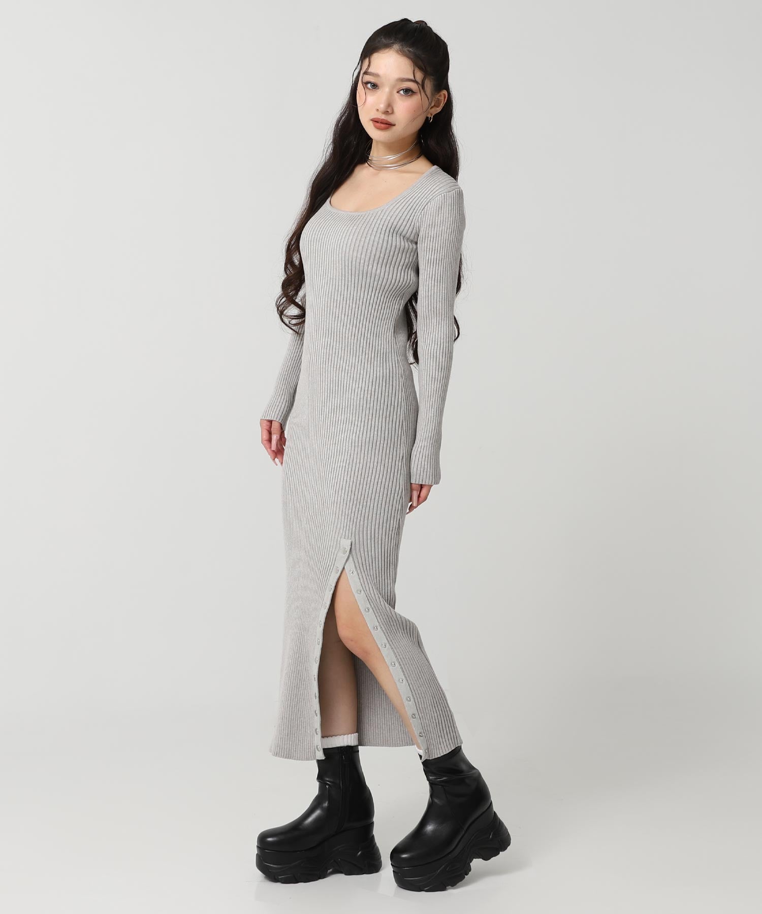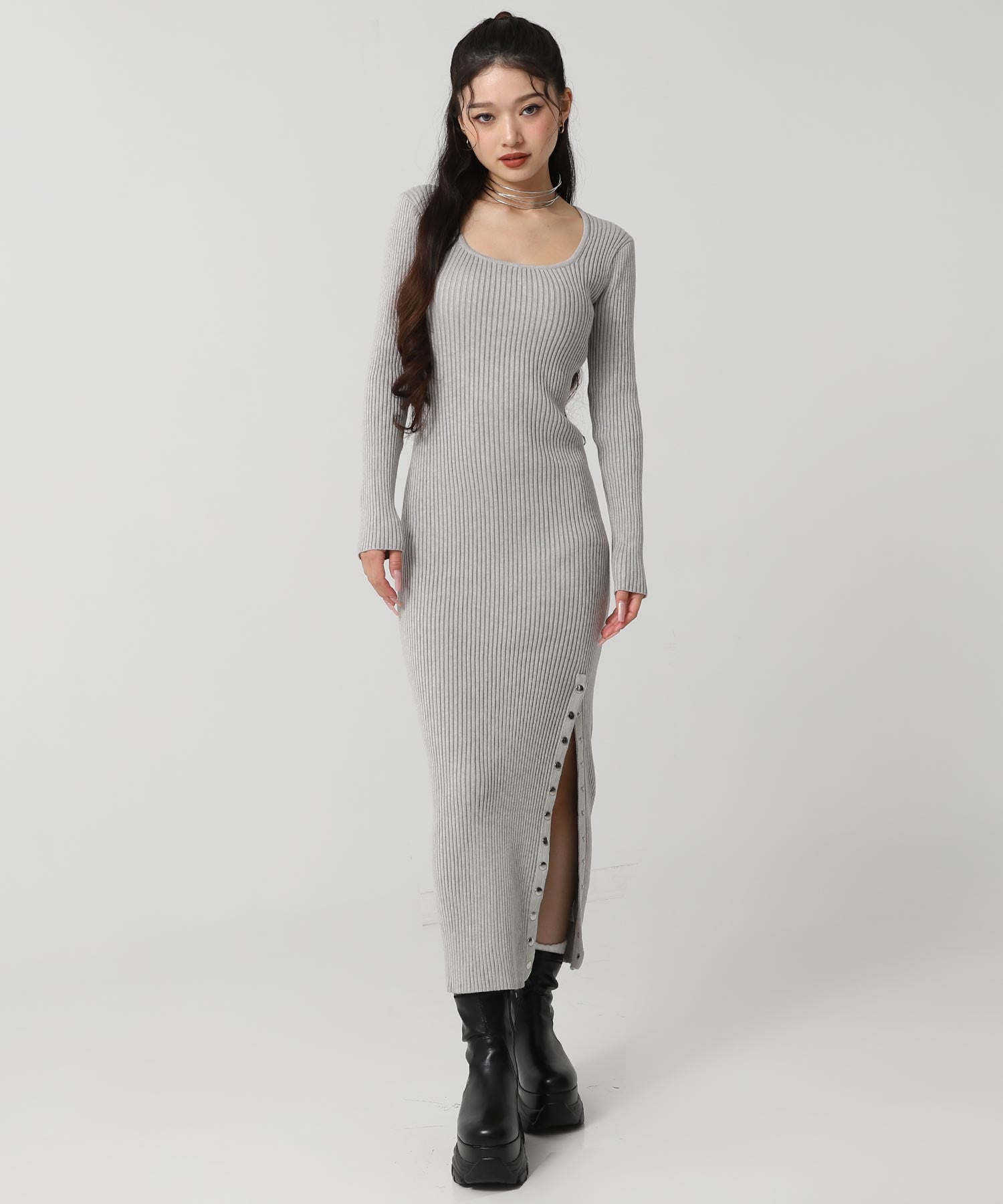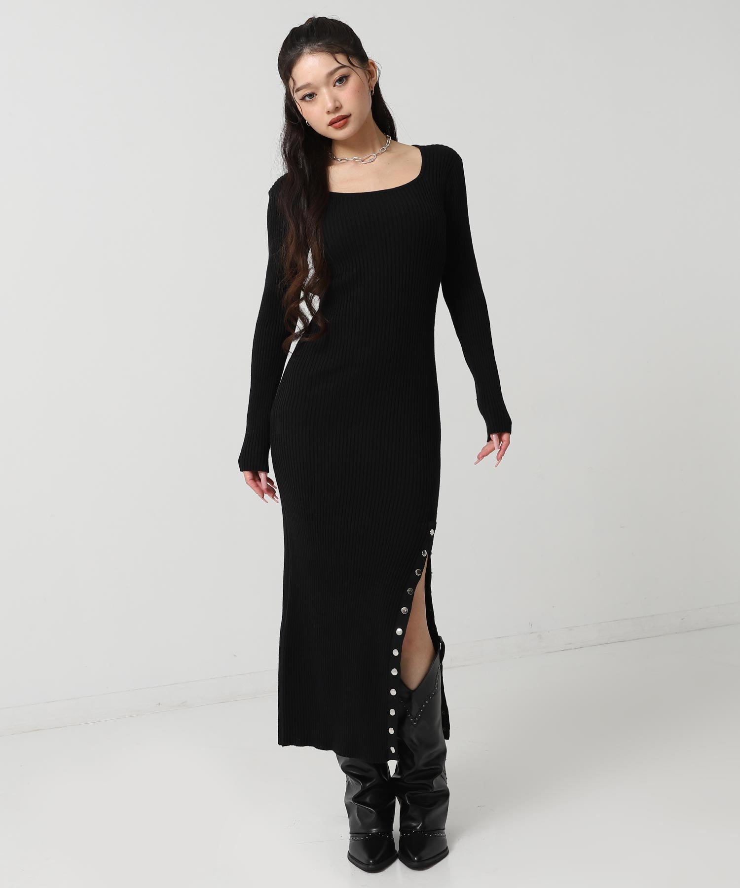 ドットボタン スリット リブ ニット ロング ワンピース 157-5952