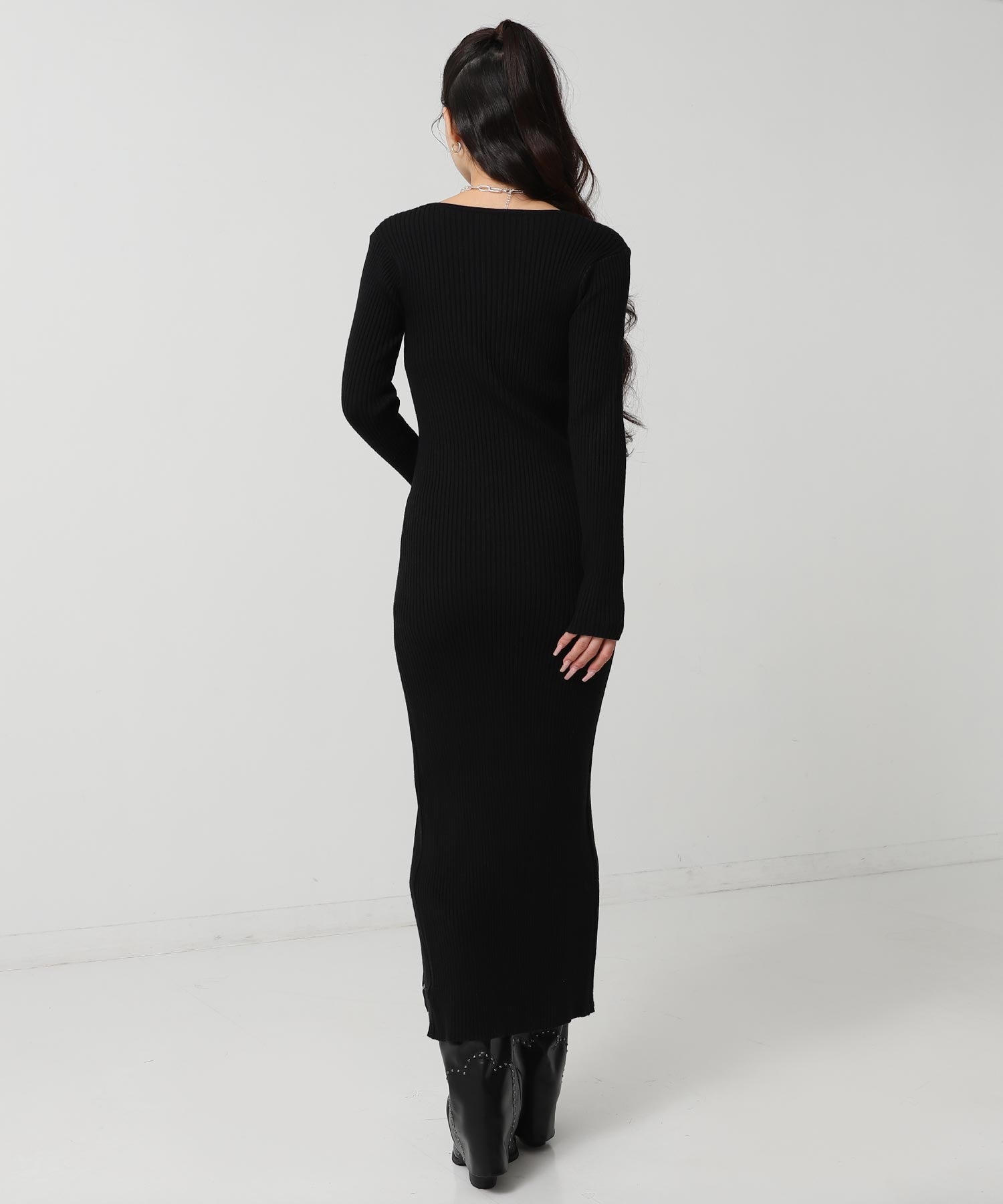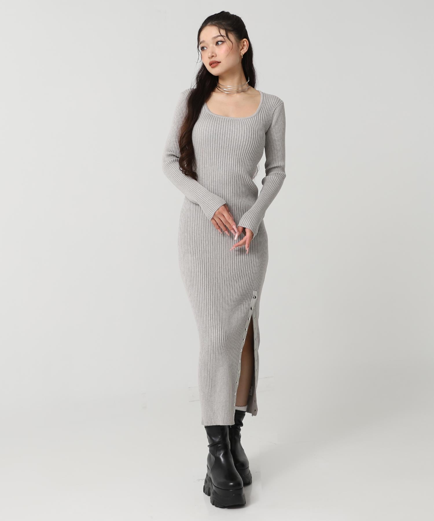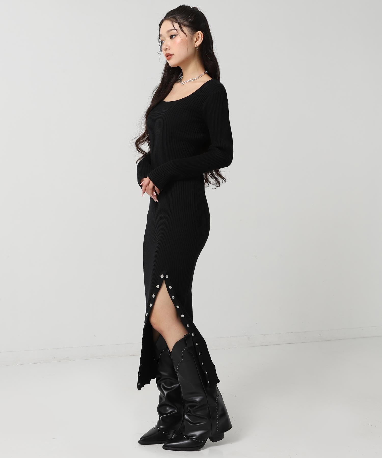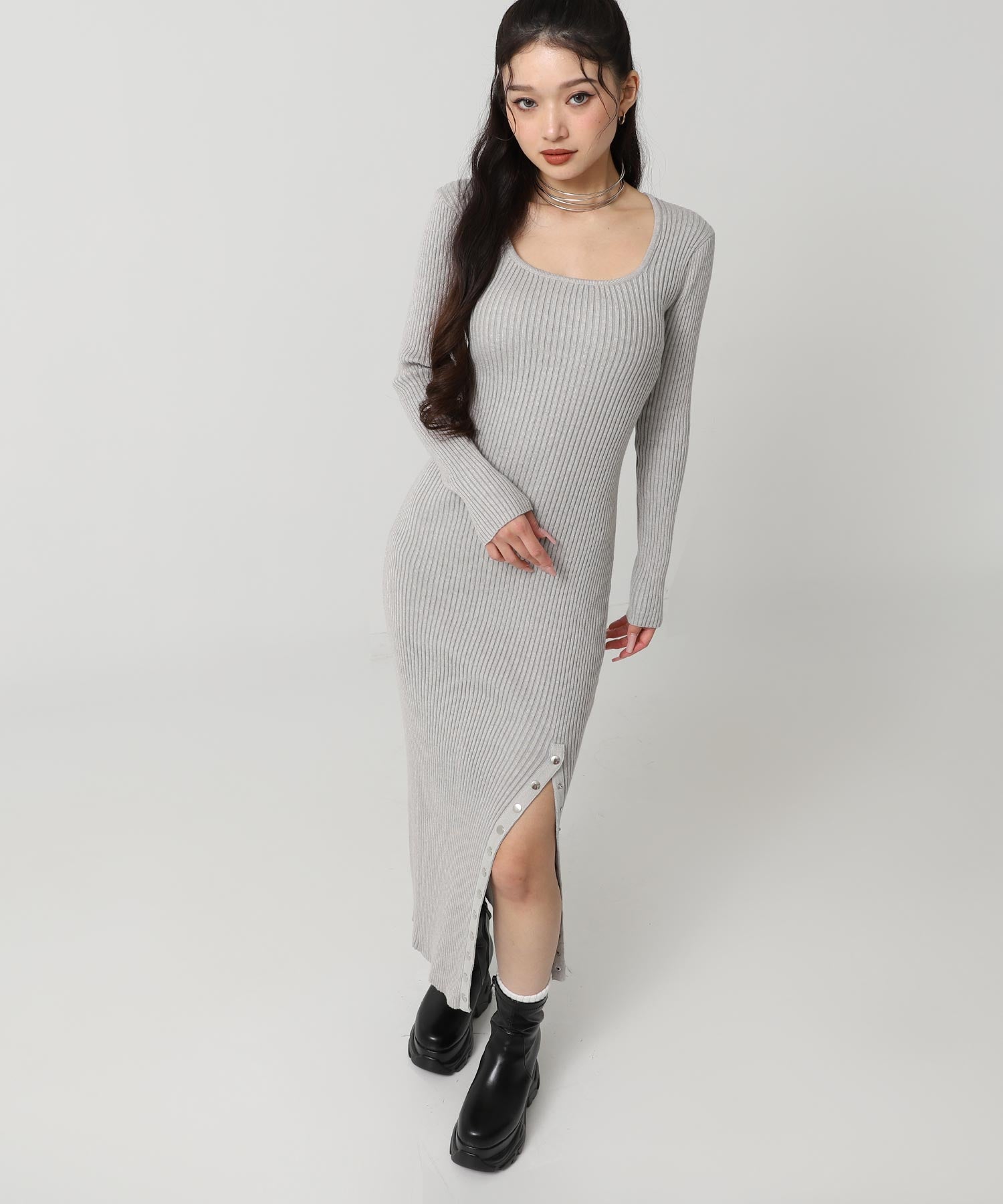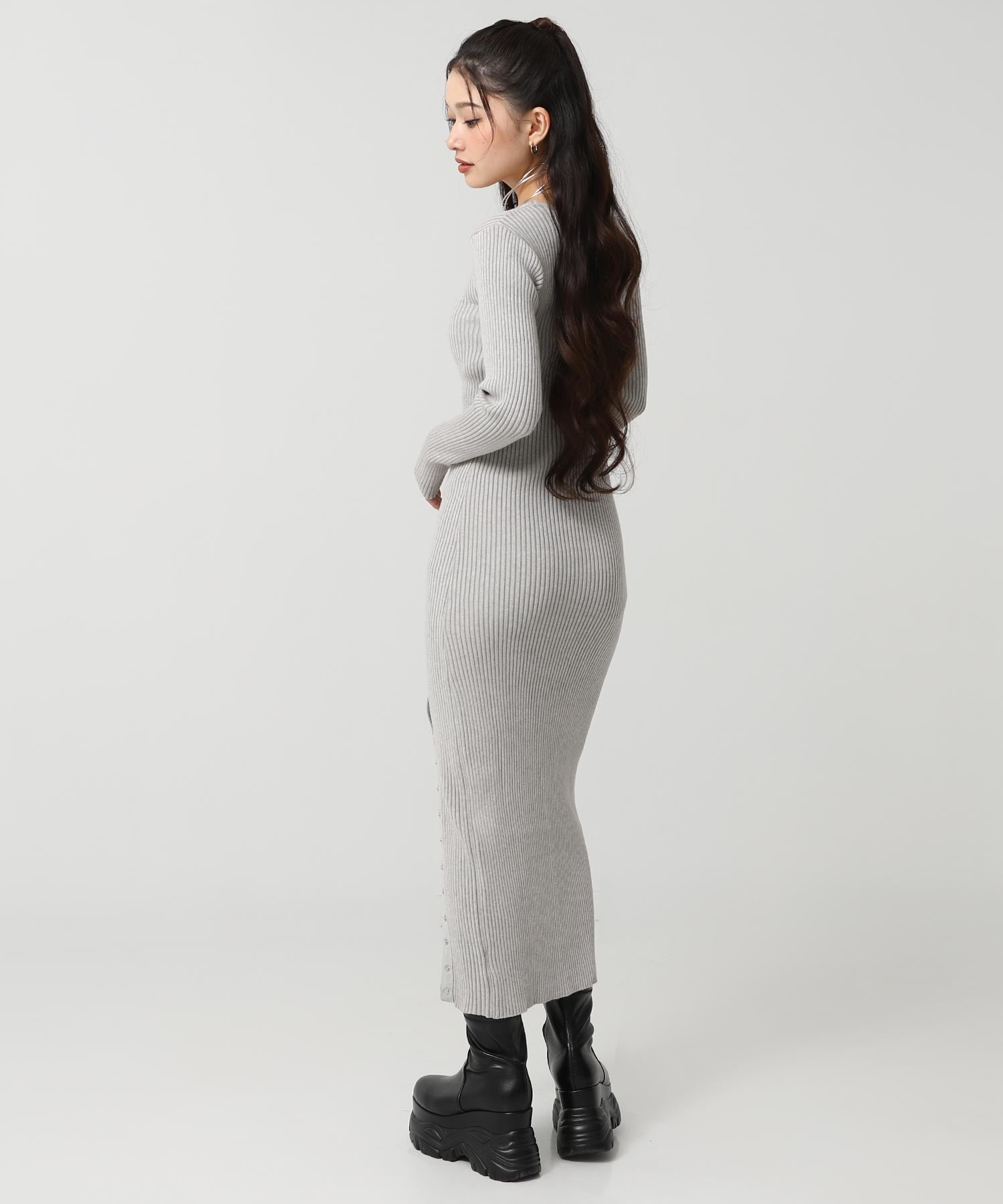 ドットボタン スリット リブ ニット ロング ワンピース 157-5952