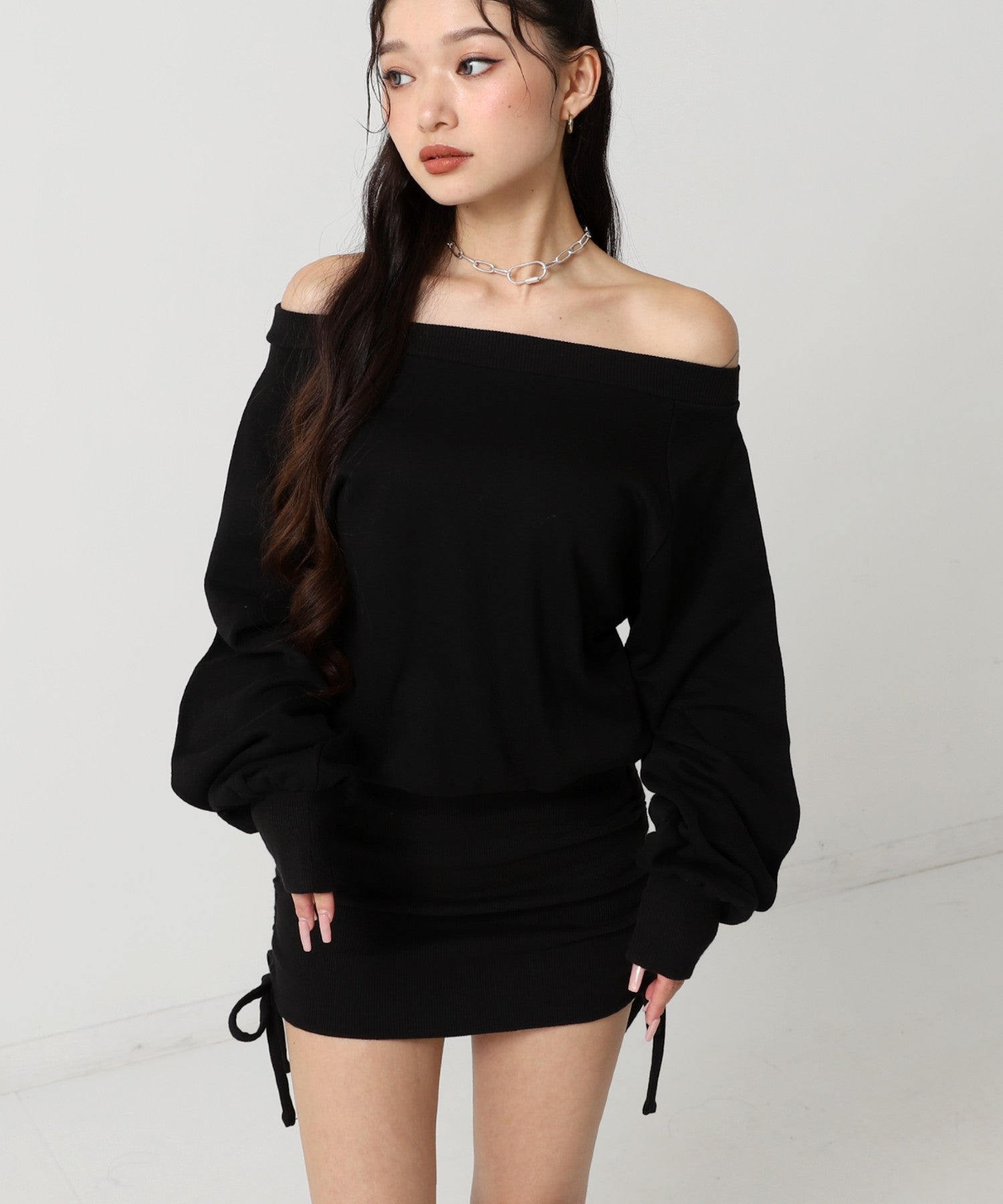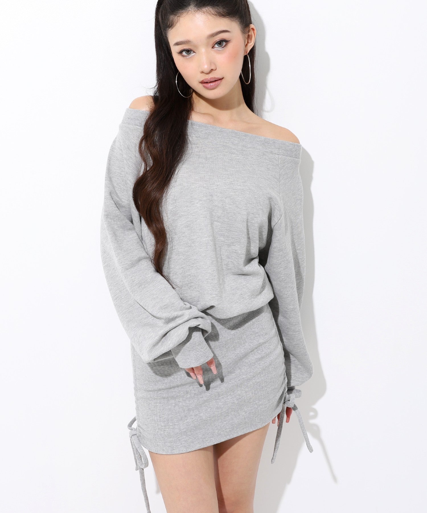 裏毛 オフショルダー サイドギャザー ミニ スウェット ワンピース 797-9394