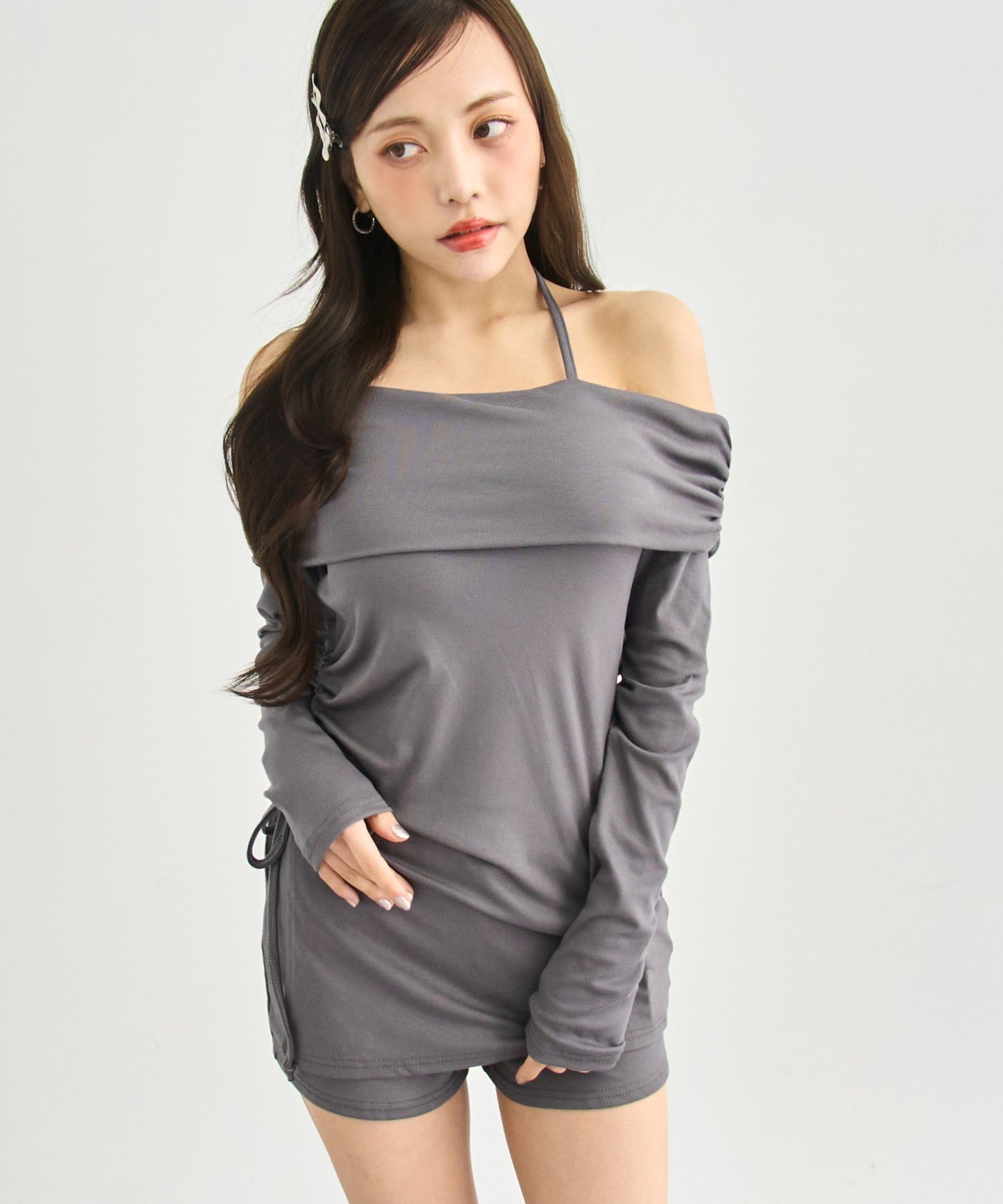 デコルテを美しく魅せるオフショルデザインに華奢なストラップをプラスし、安定感と抜け感を両立。なめらかに伸びるストレッチ素材がボディラインに心地よくフィットし、女性らしい曲線を引き立てます。サイドのドロスト仕様で丈感やシルエットの微調整が可能。さらにインパン付きの安心設計で、ミニ丈でもアクティブに動ける一着に仕上げました。