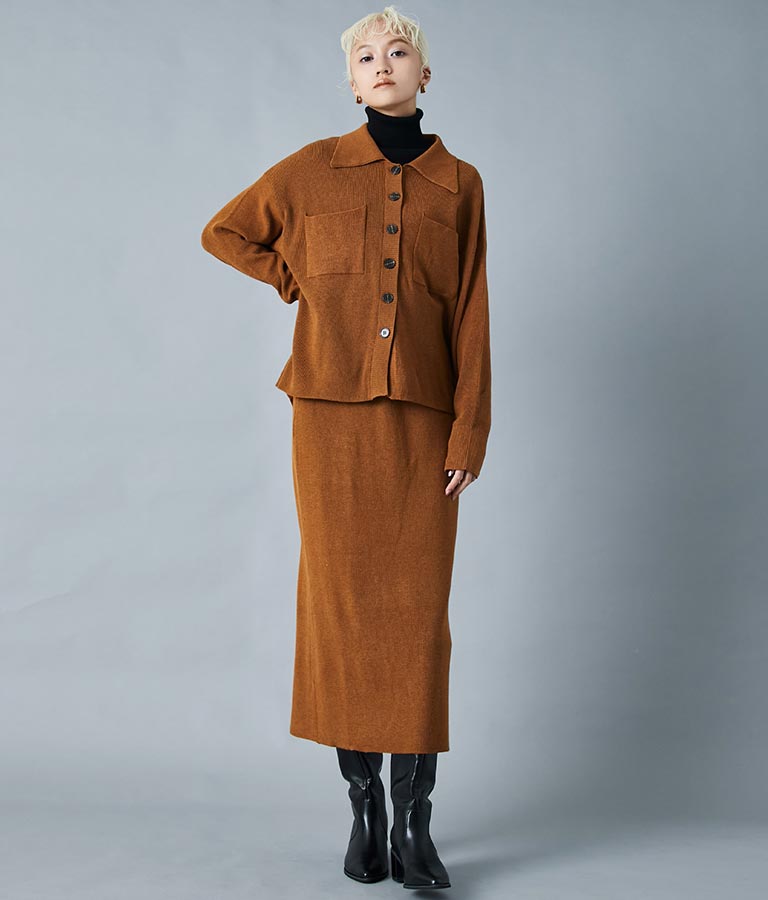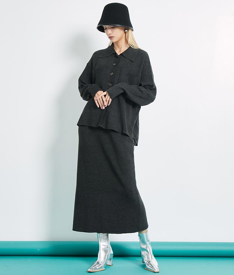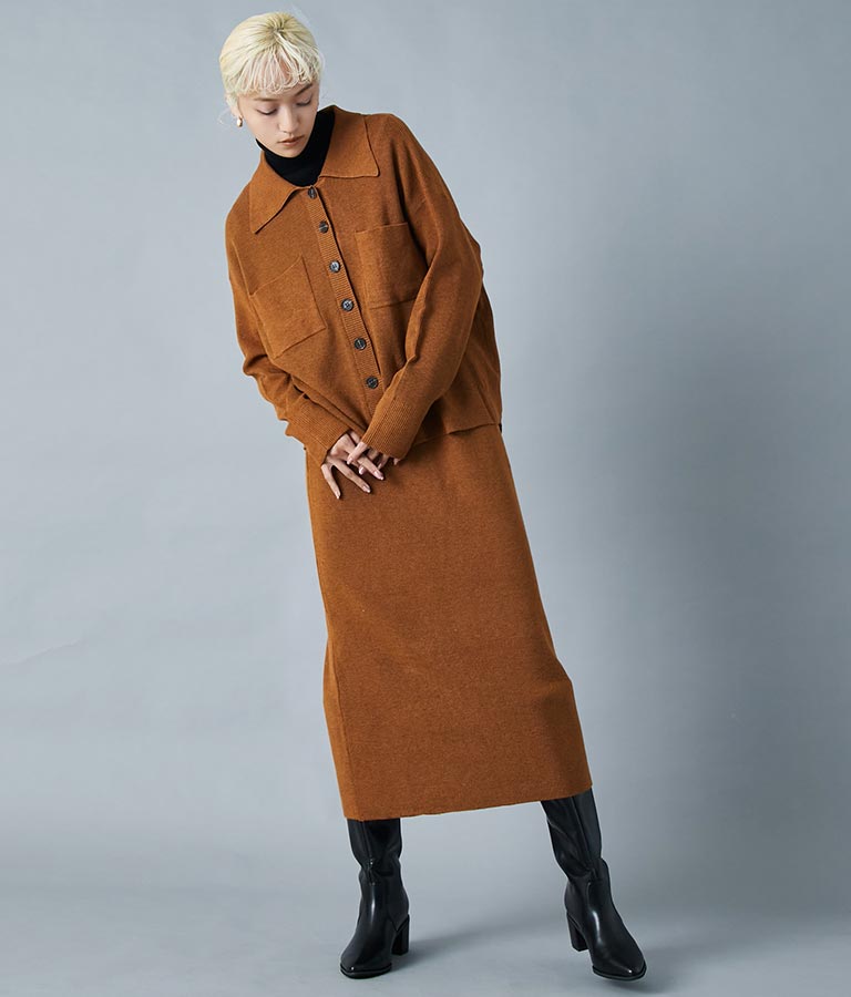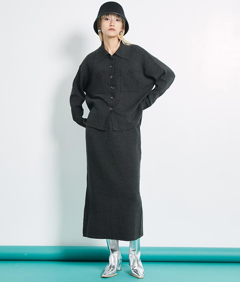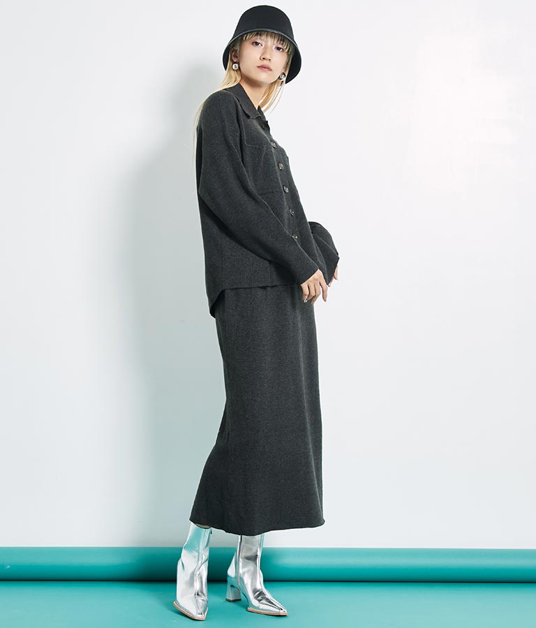 同素材を使用した【リブ バックロング ニットシャツ 長袖】とセットアップでの着こなしもおススメ。