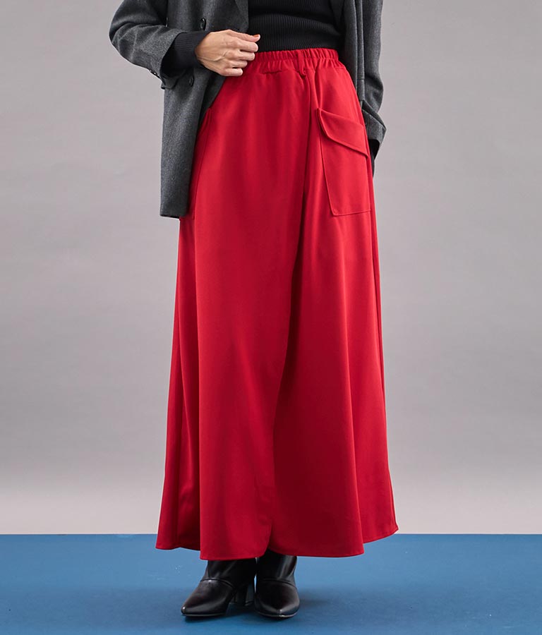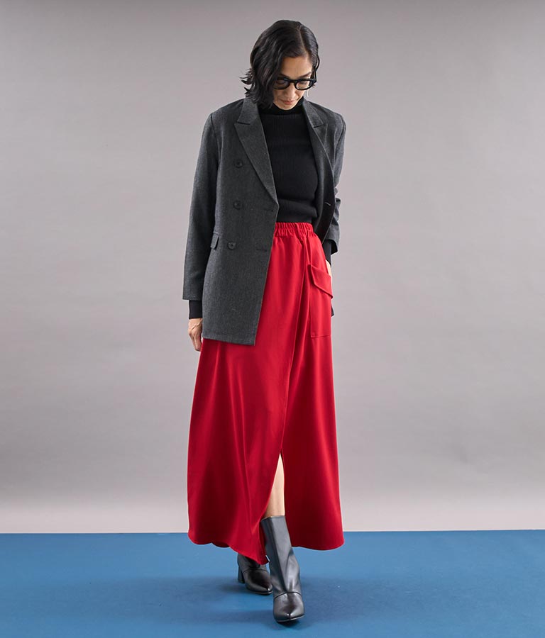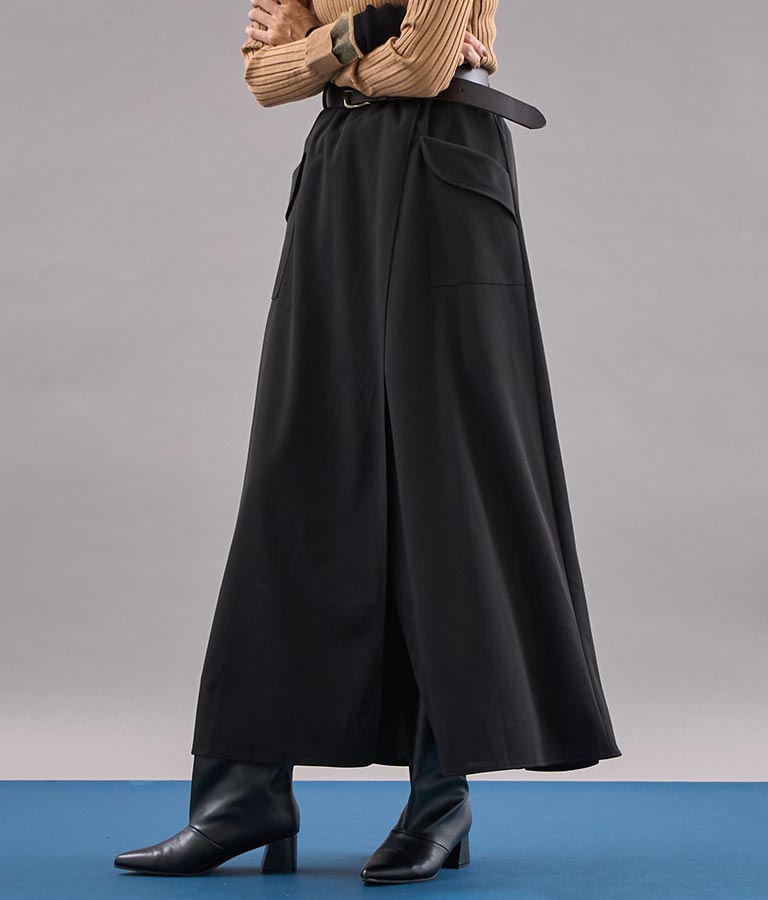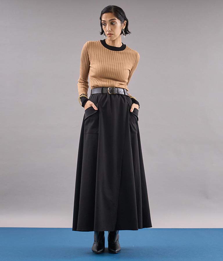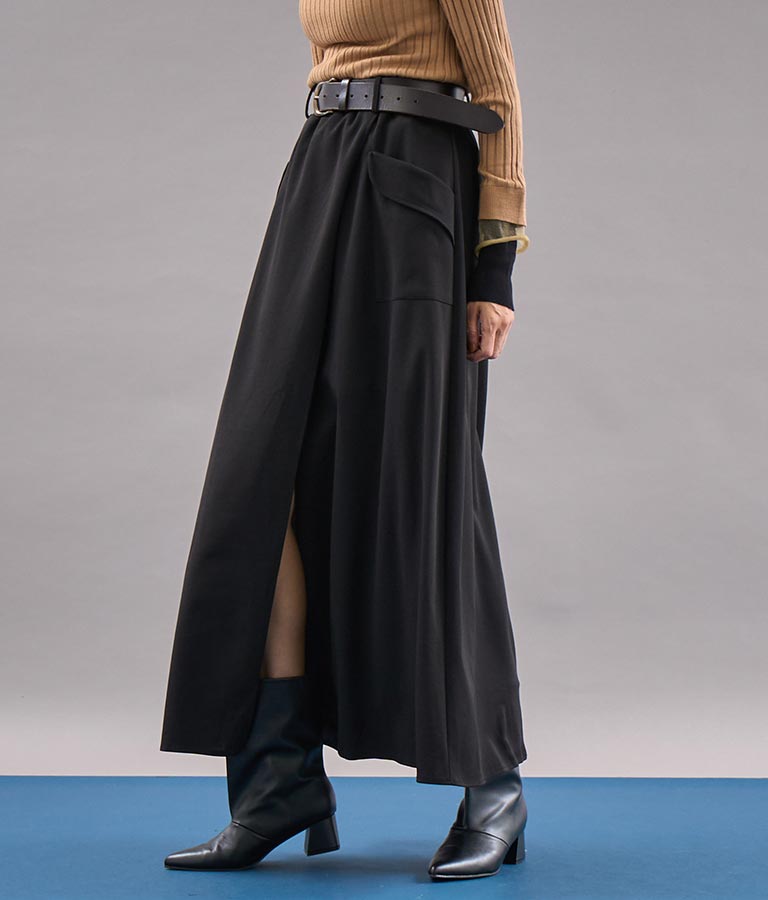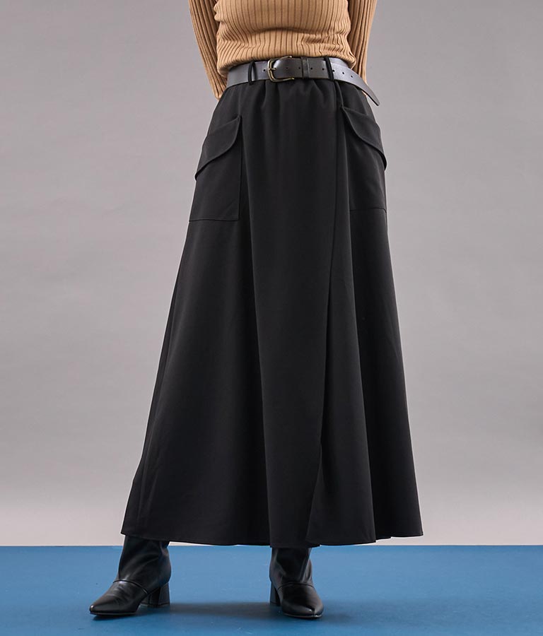 ロング丈のフレアシルエットが印象的なラップスカート。