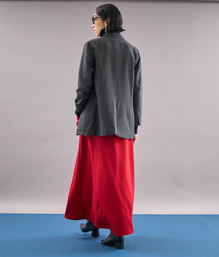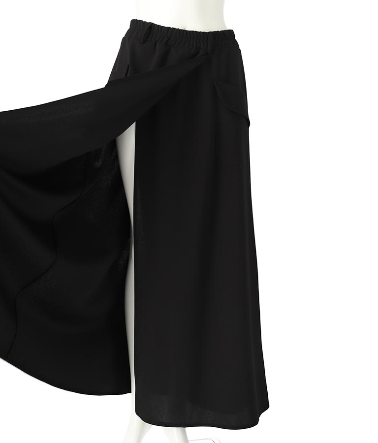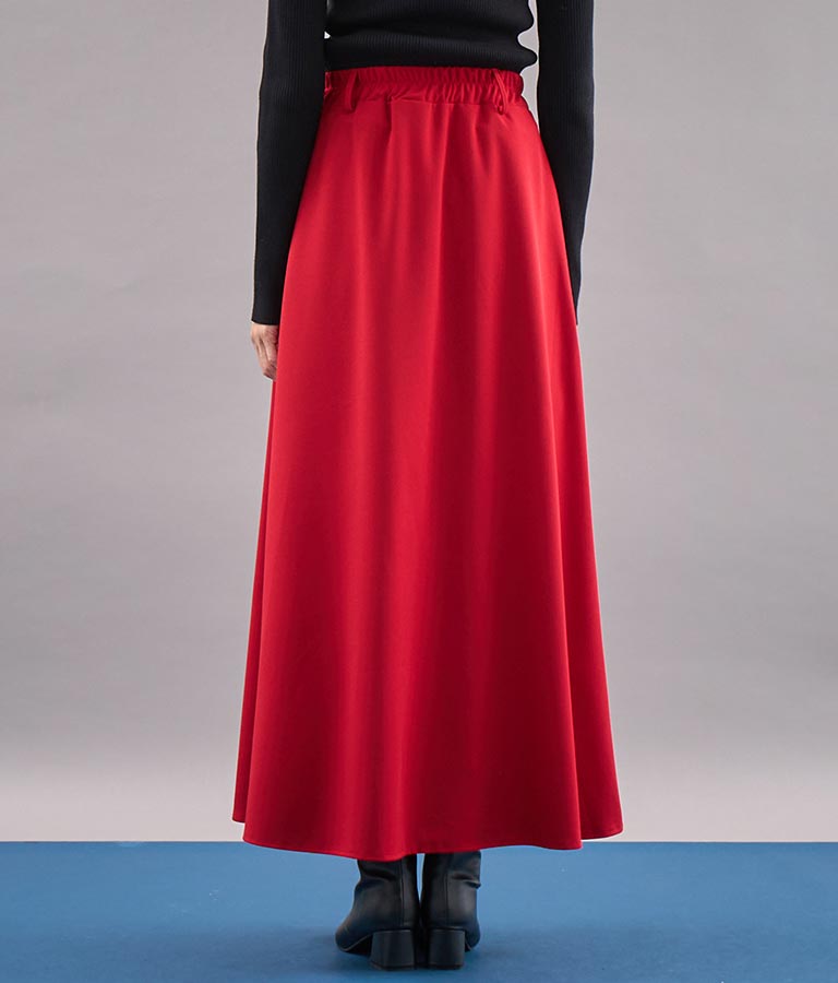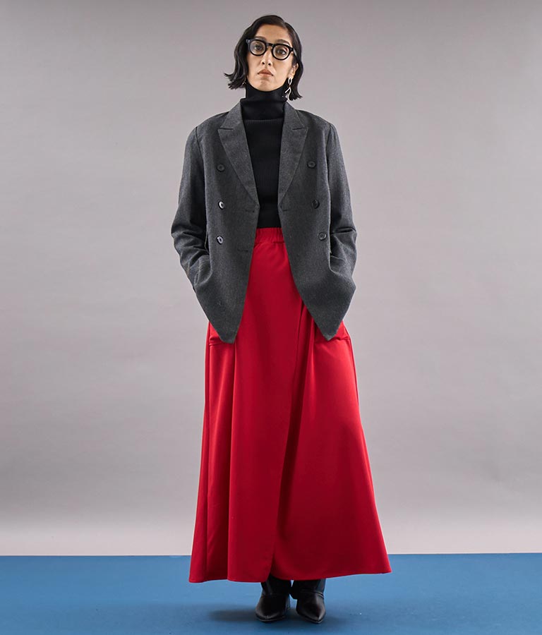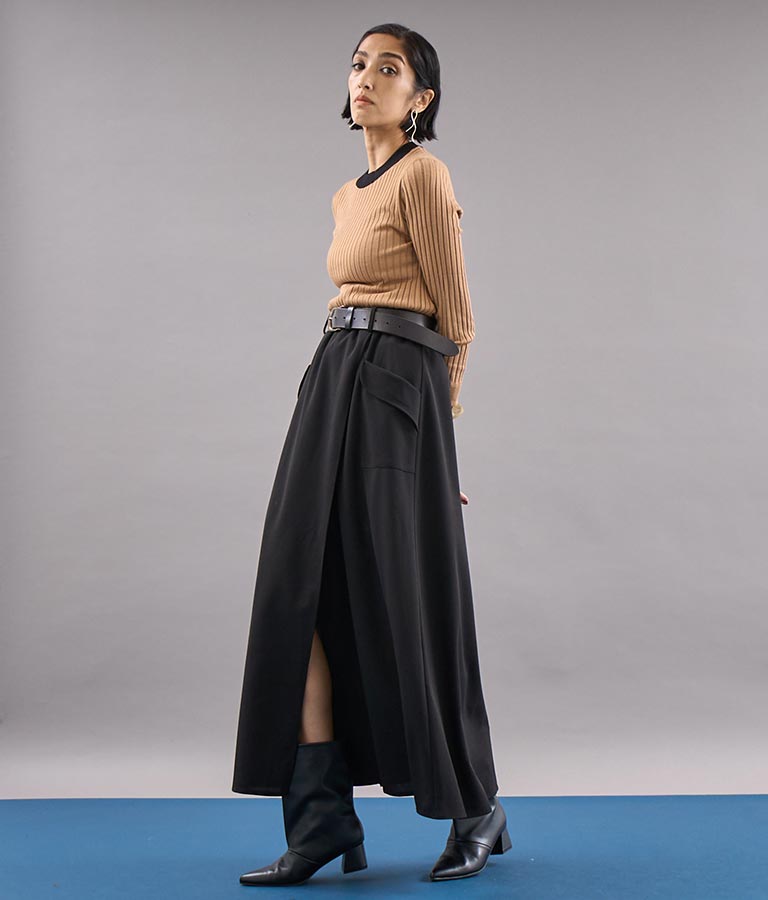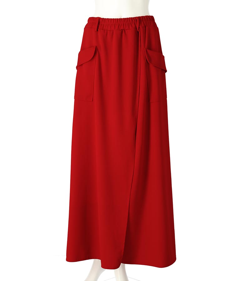 ロング丈のフレアシルエットが印象的なラップスカート。