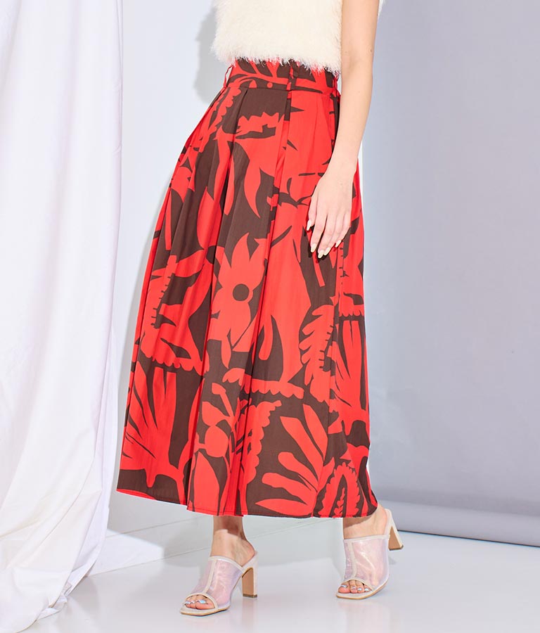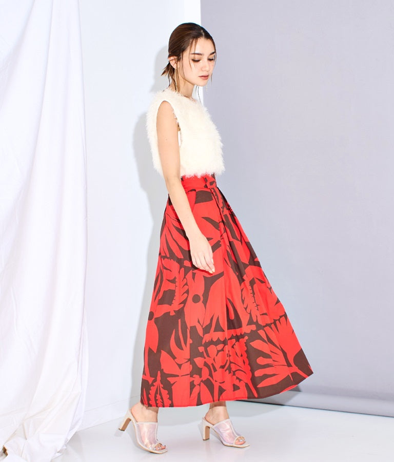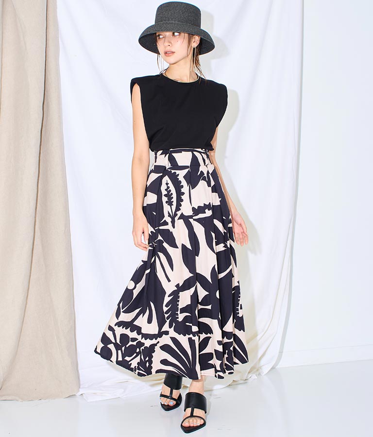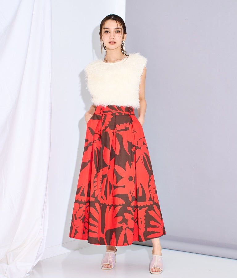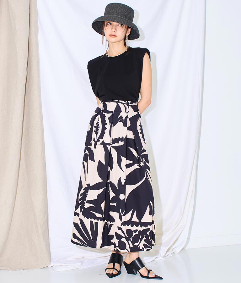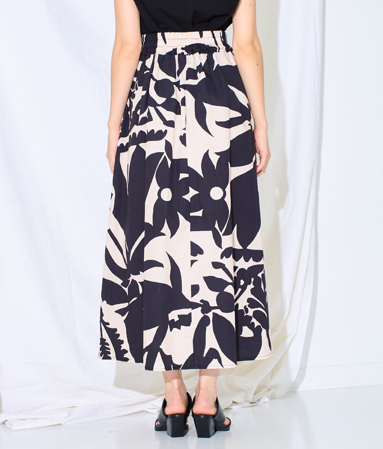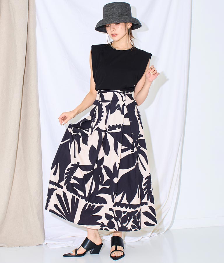 コーディネートを華やかに飾るボタニカル柄のロングスカート。