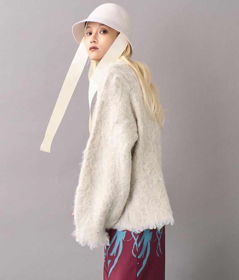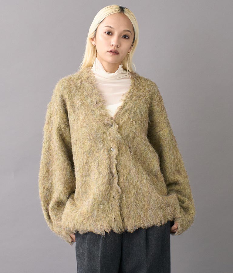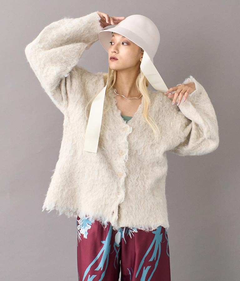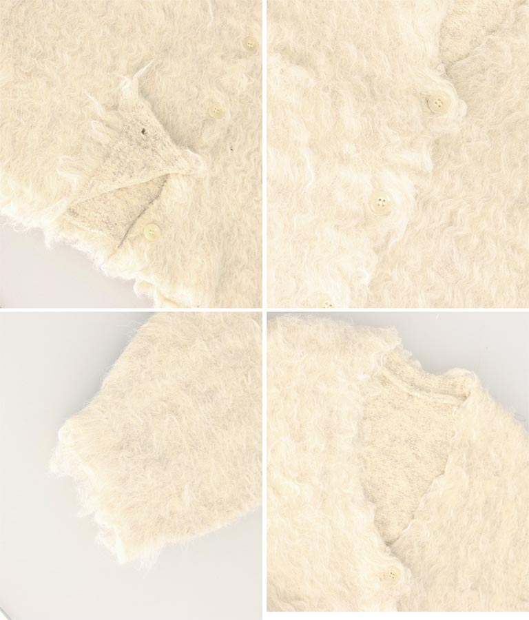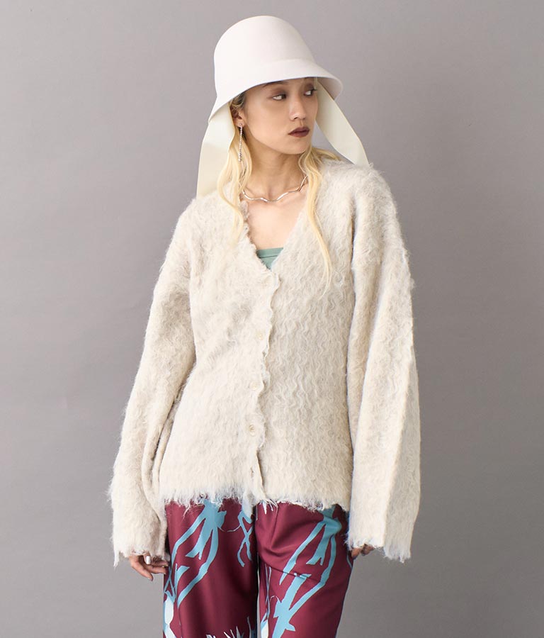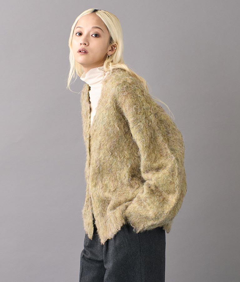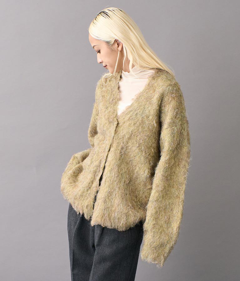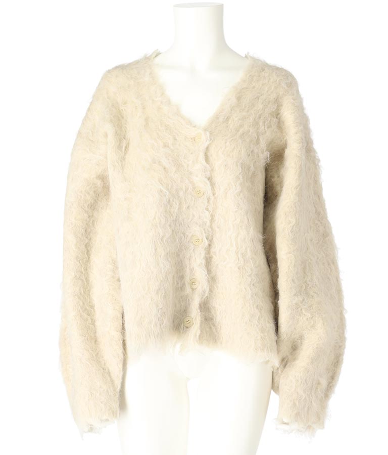 ふんわりと柔らかい手触りのブークレシャギーVネックカーディガン。