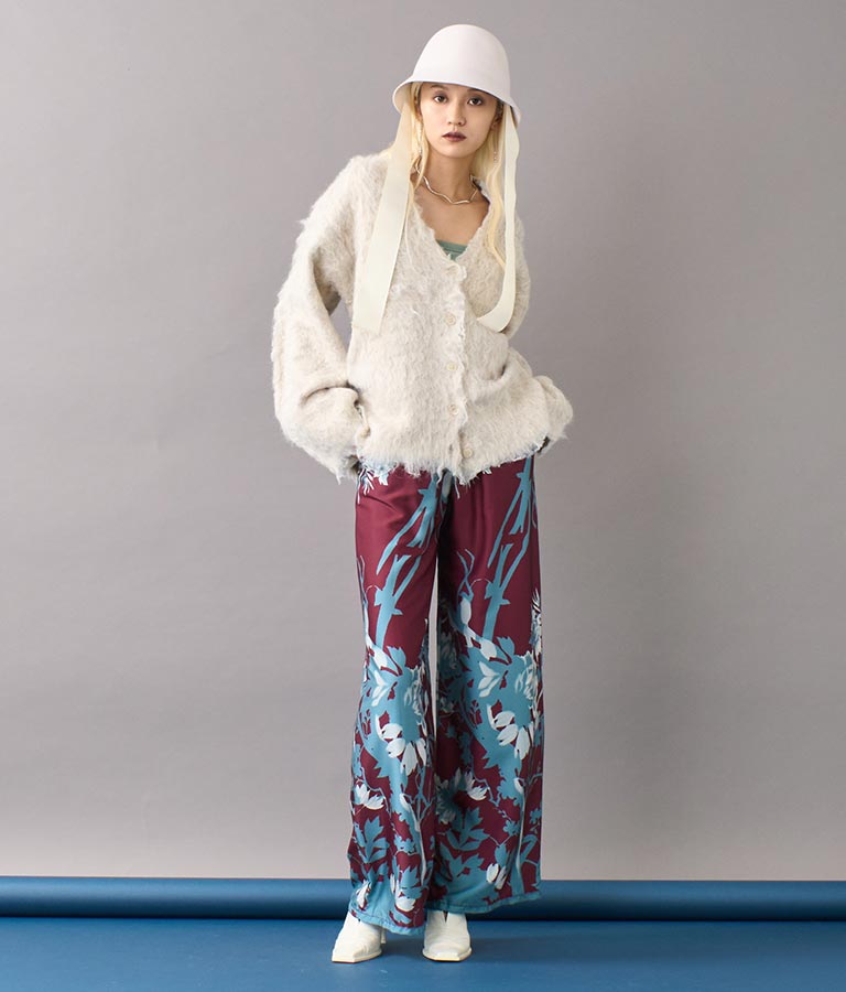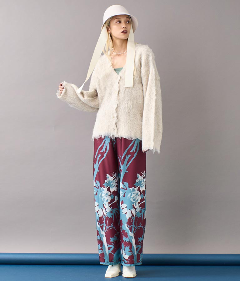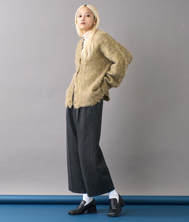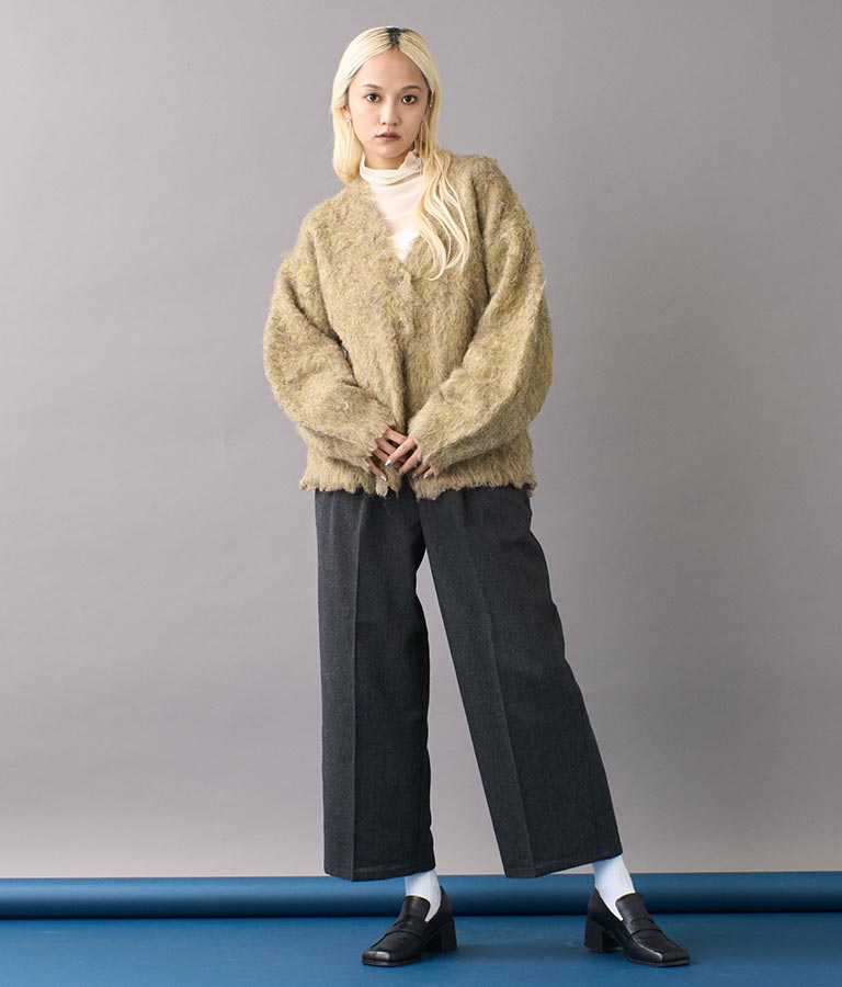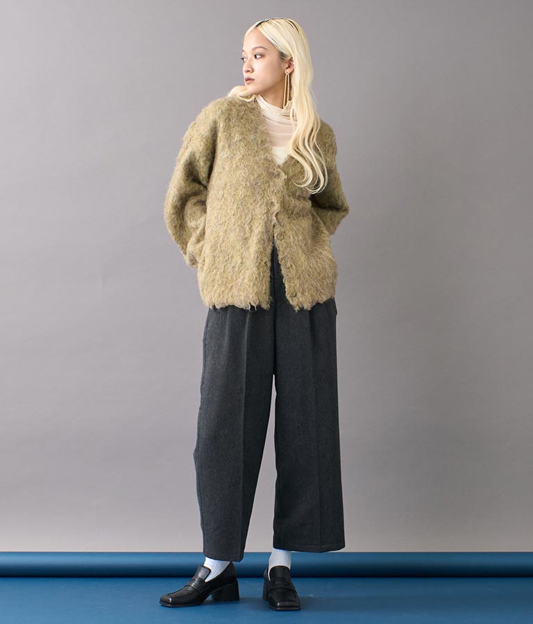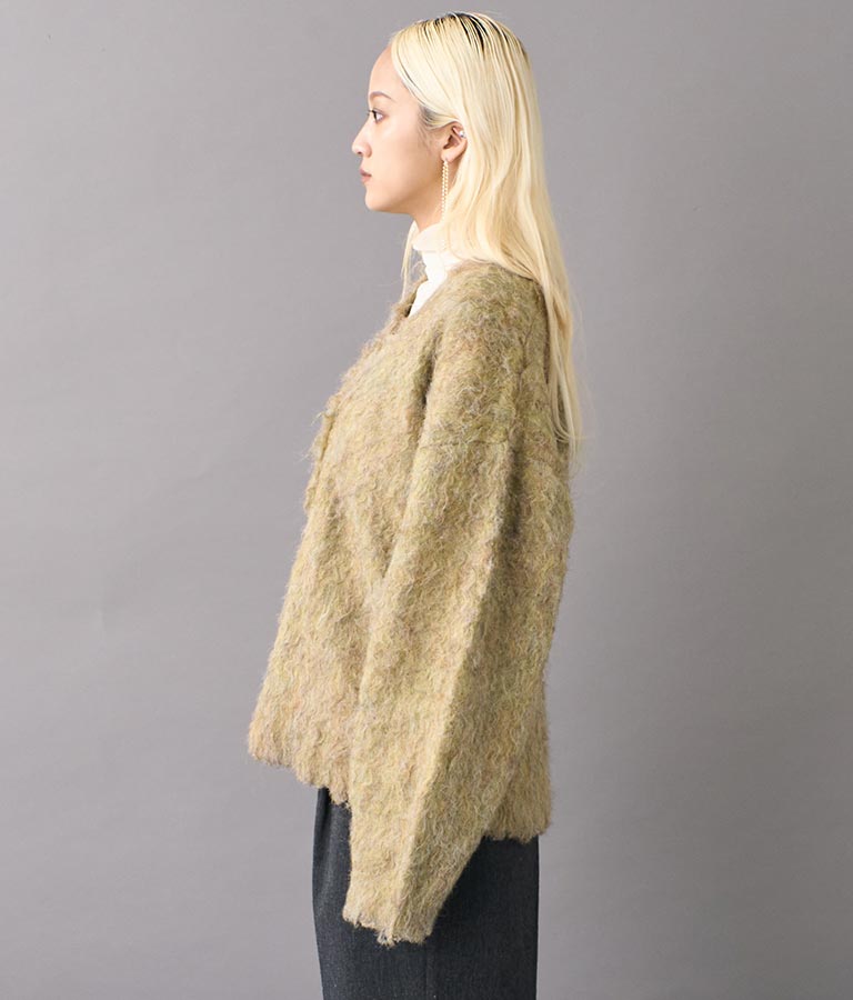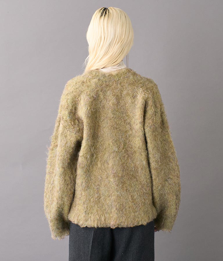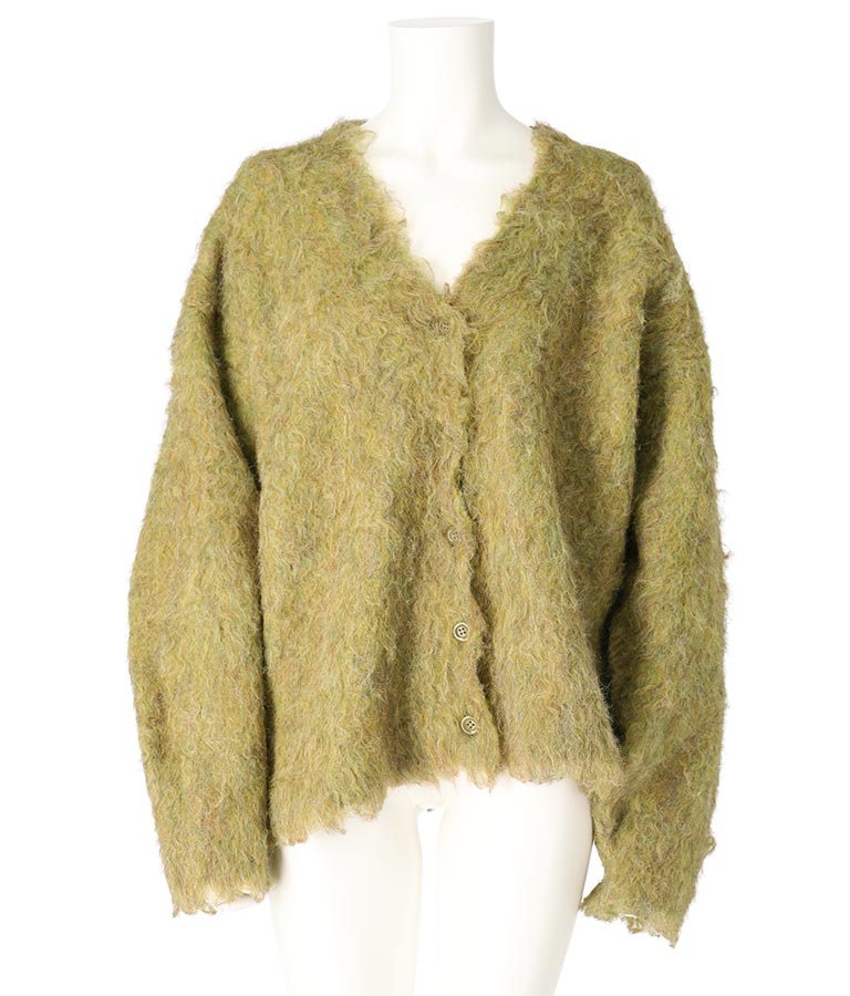 ふんわりと柔らかい手触りのブークレシャギーVネックカーディガン。