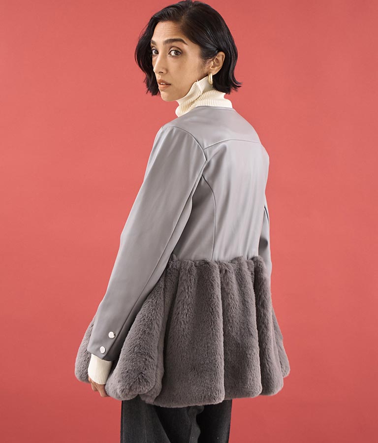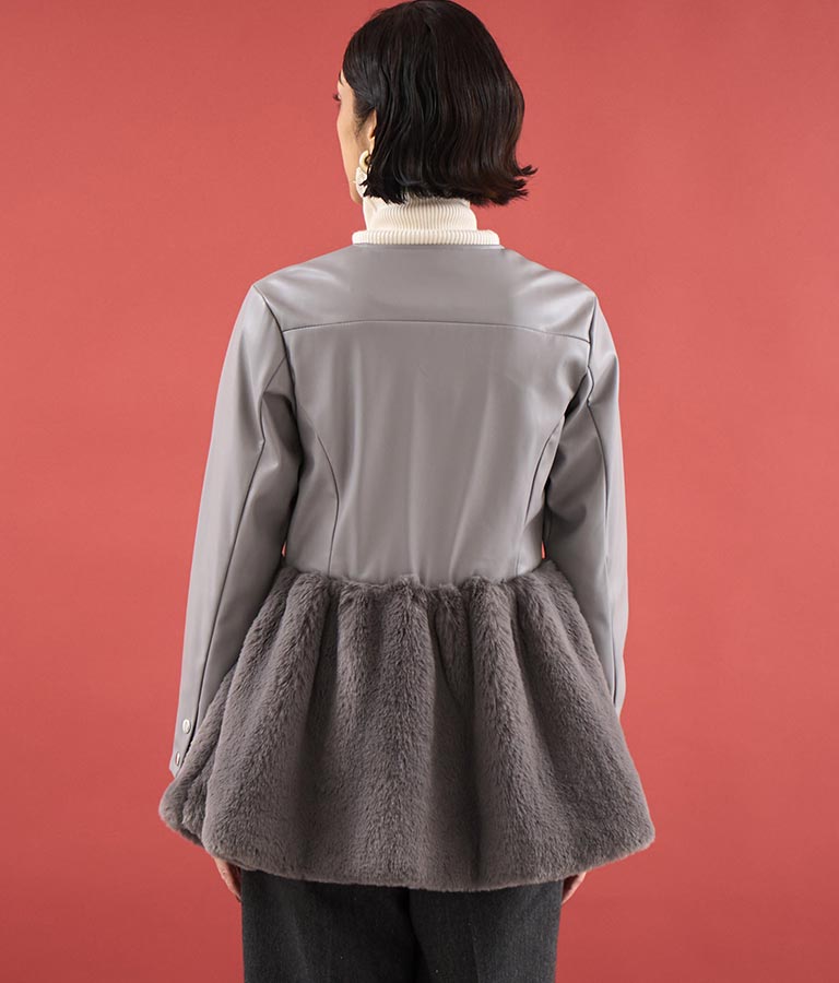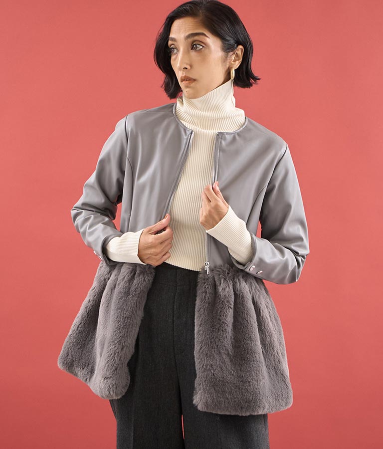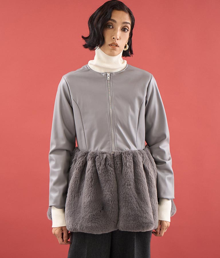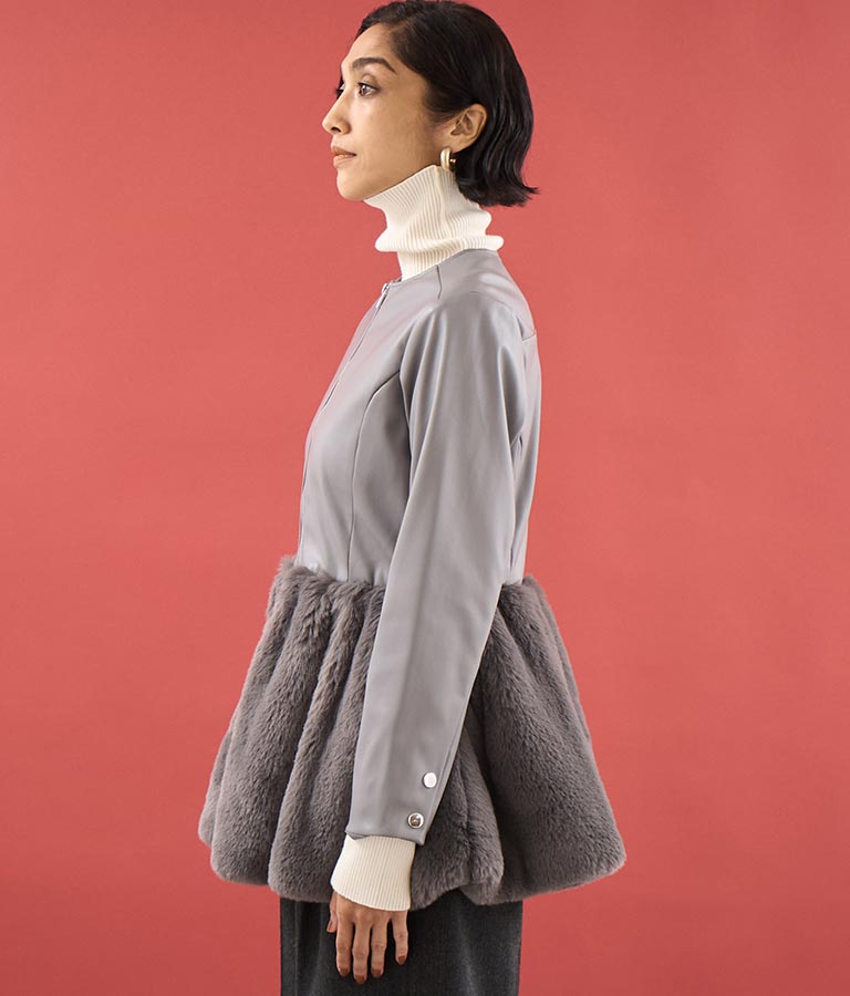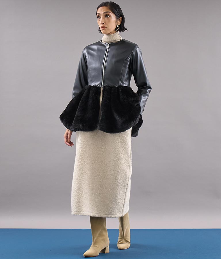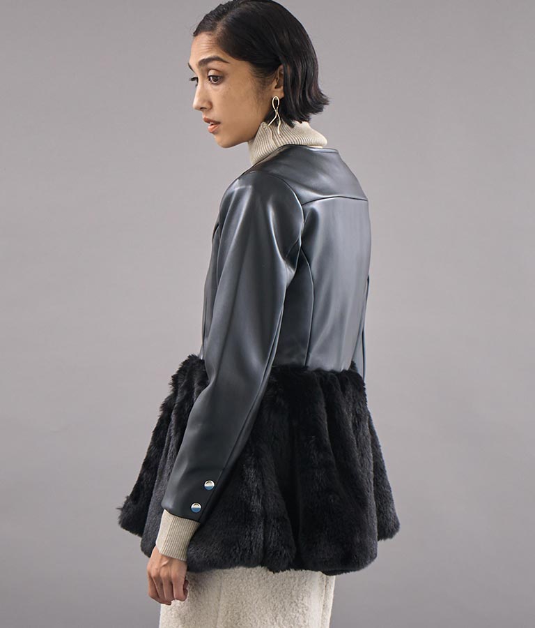 裾に配置されたボリュームたっぷりのエコファーとタイトなフェイクレザーがメリハリのあるジャケット。