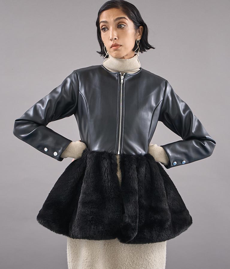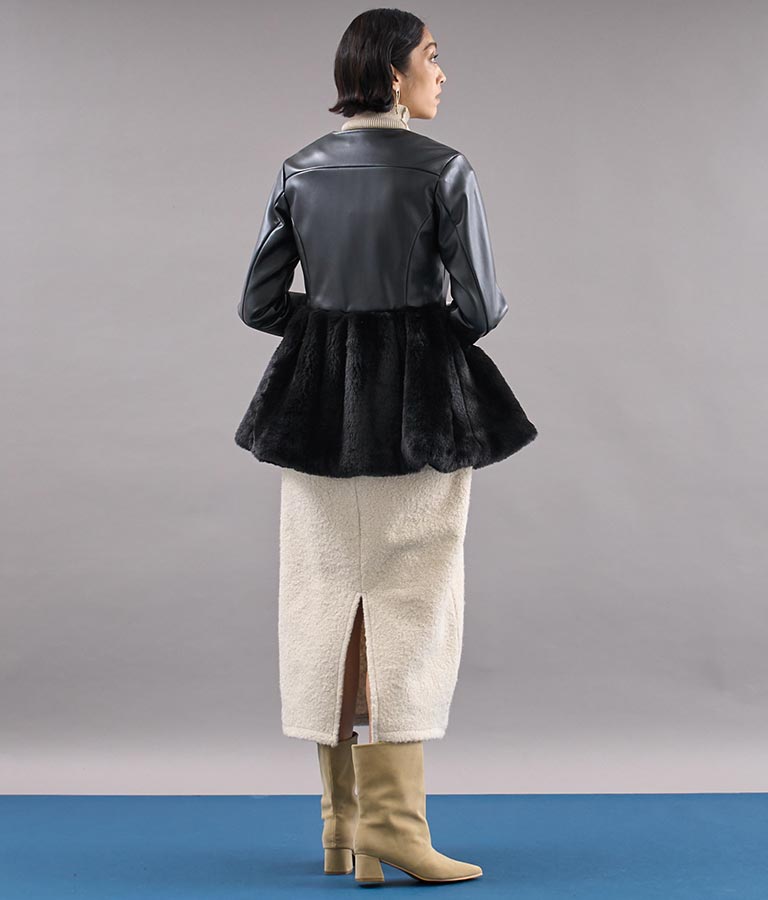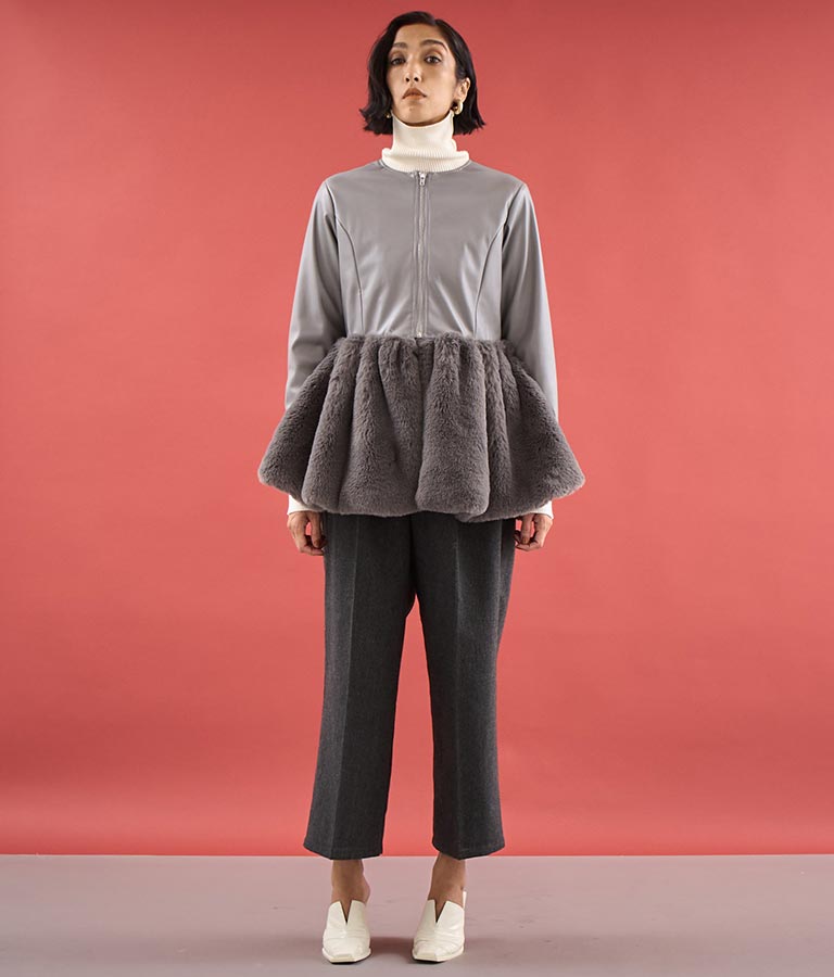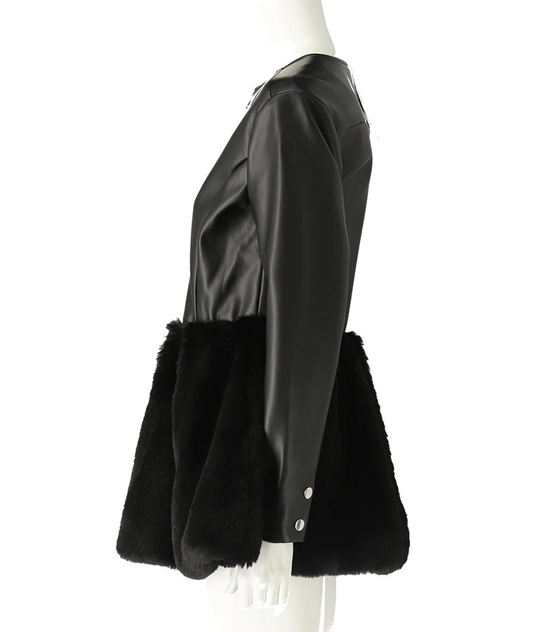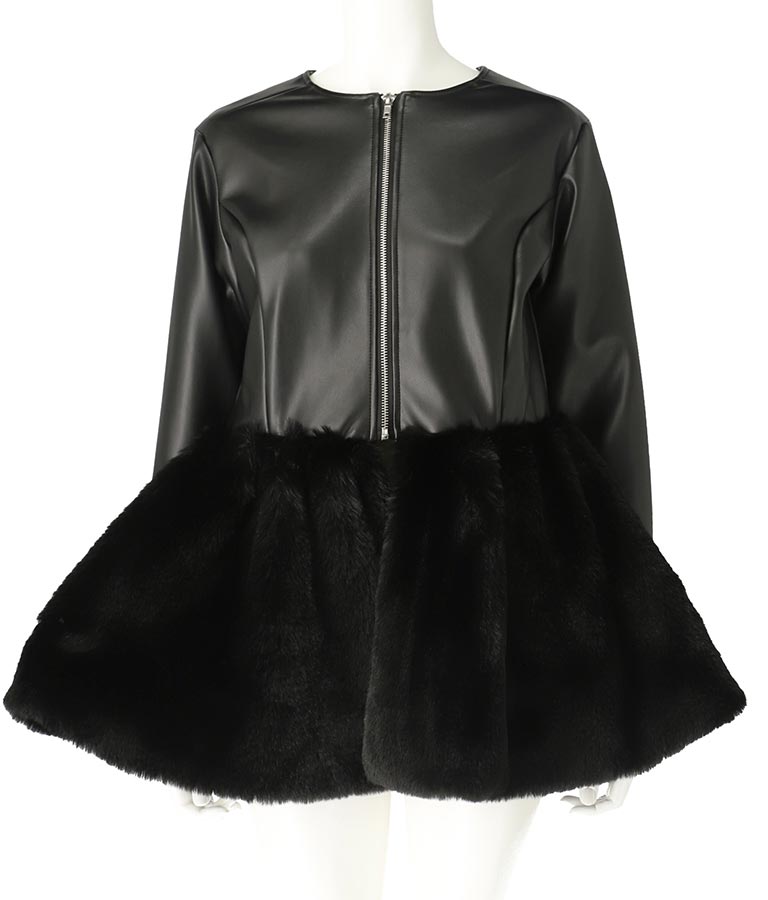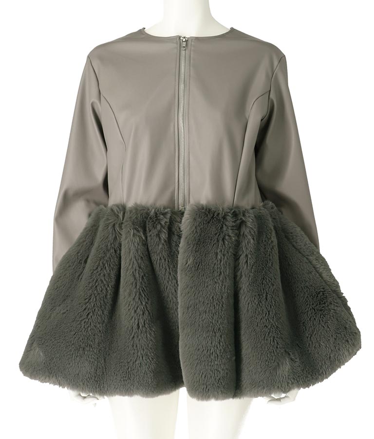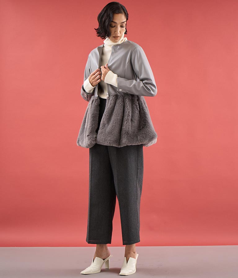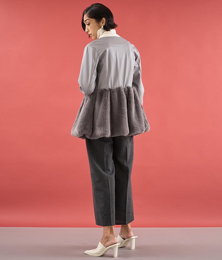 裾に配置されたボリュームたっぷりのエコファーとタイトなフェイクレザーがメリハリのあるジャケット。