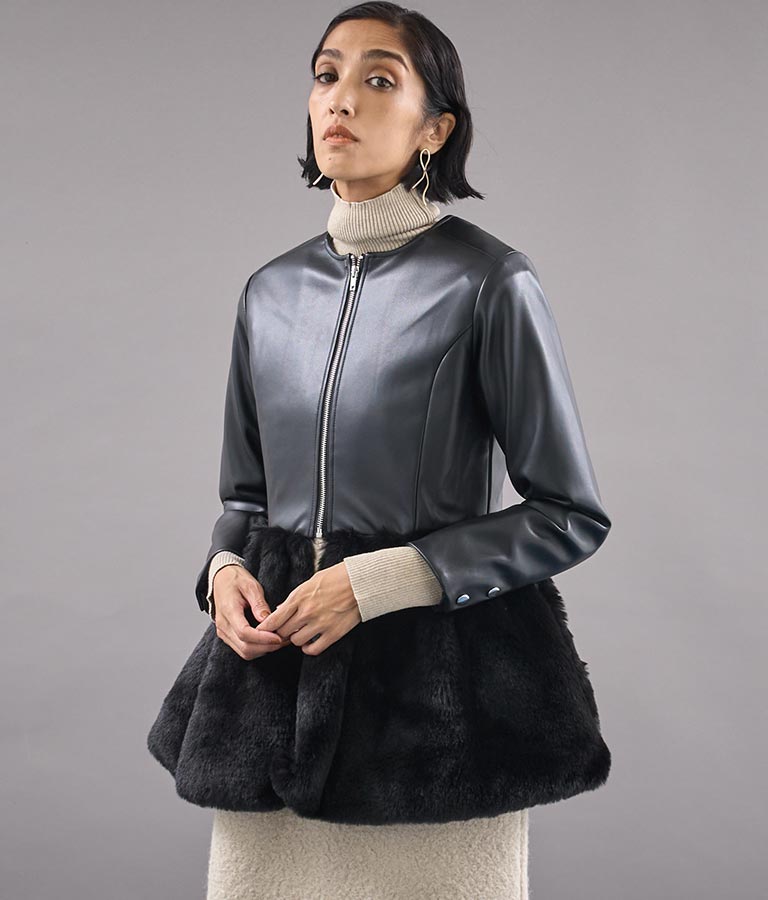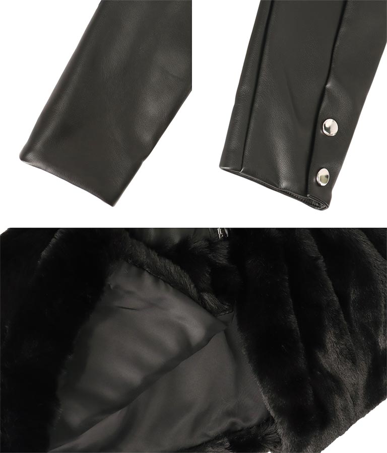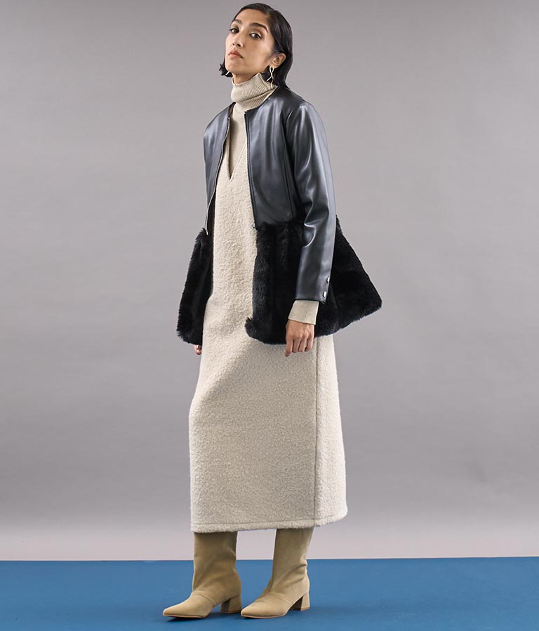 ハードな印象になりがちなフェイクレザーが女性らしいエコファーで中和され、柔らかな雰囲気を醸し出します。
