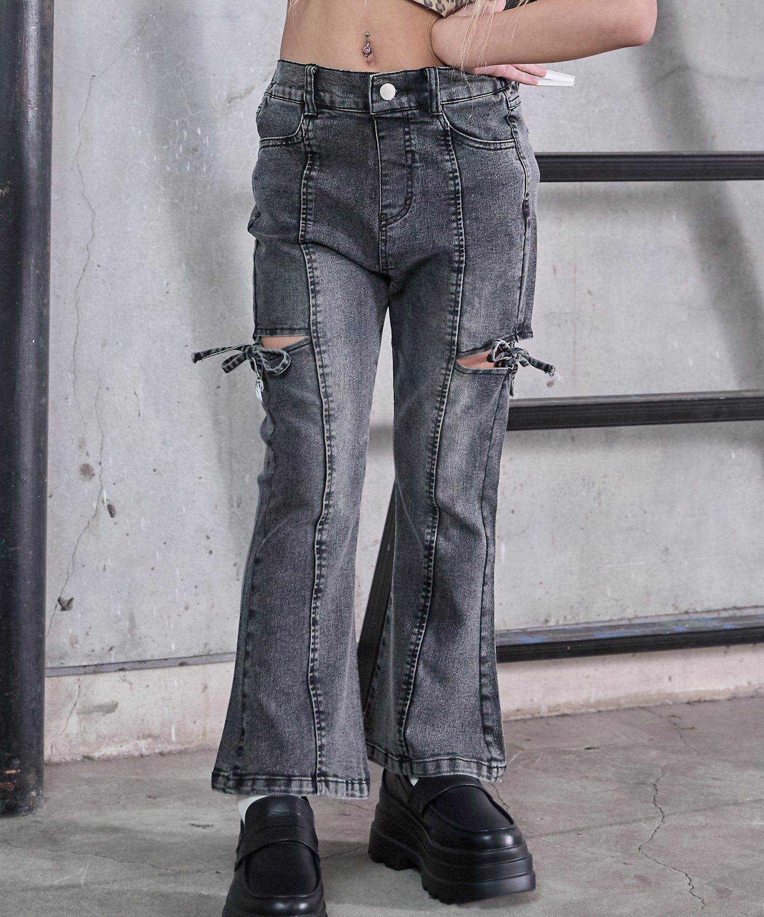 柔らかなデニム素材で動きやすく、アクティブなシーンでも快適に過ごせます。膝部分のカットデザインにリボンを添えることで、程よい抜け感と可愛らしさをプラス。裾に向かって広がるフレアラインが脚をきれいに見せ、すっきりとした印象に仕上げてくれます。ウエストは着脱しやすい仕様で、毎日のコーデに取り入れやすいのも嬉しいポイントです。
