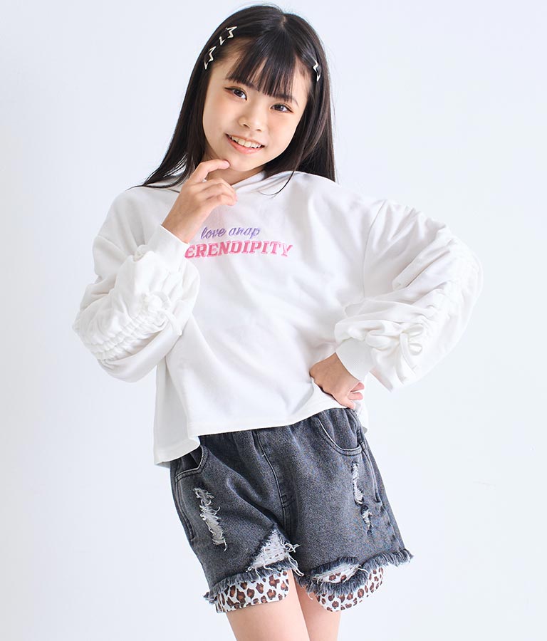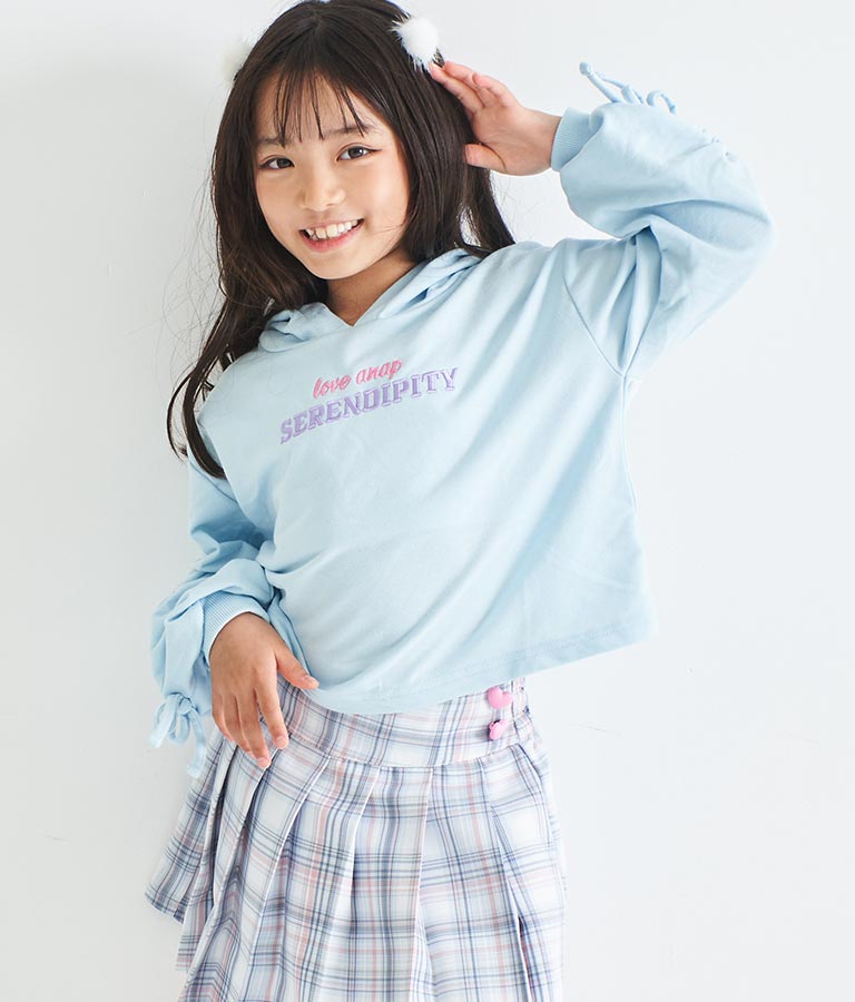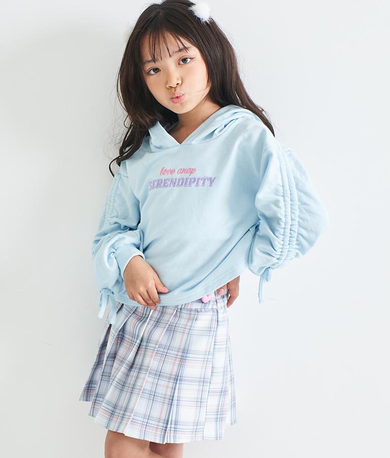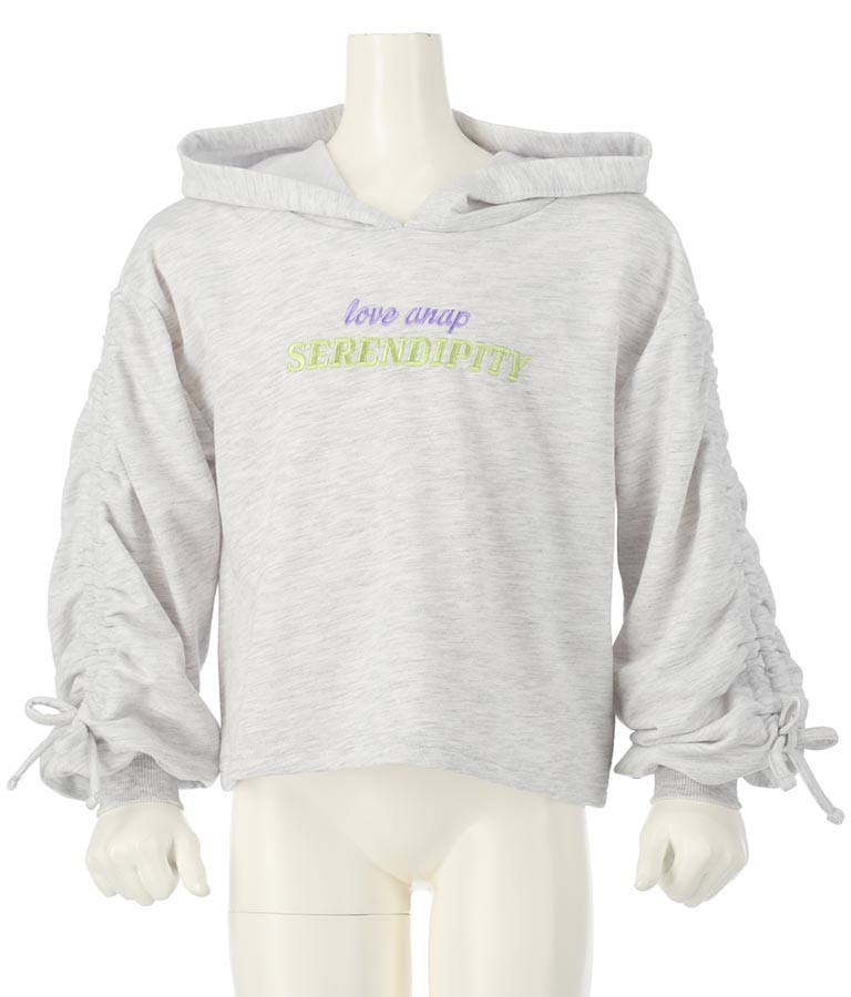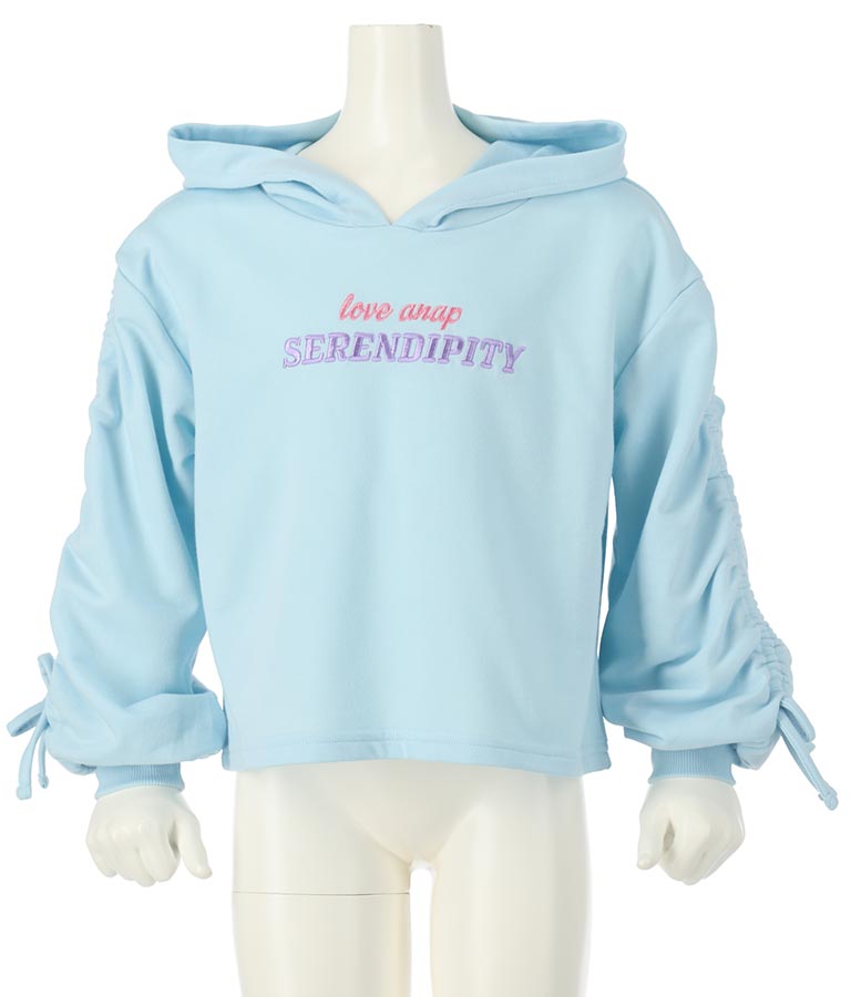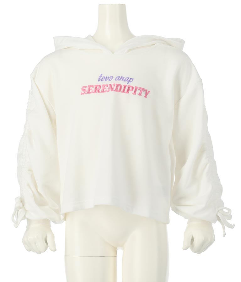カジュアルコーデの定番フーディも袖のシャーリング+フロントに施した可愛い配色の刺繍でキュートかつおしゃれな装いに☆