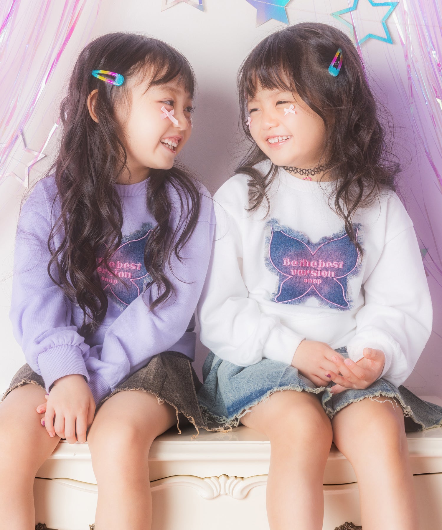 デニムバタフライが映える、遊び心いっぱいのクロップドスウェット
