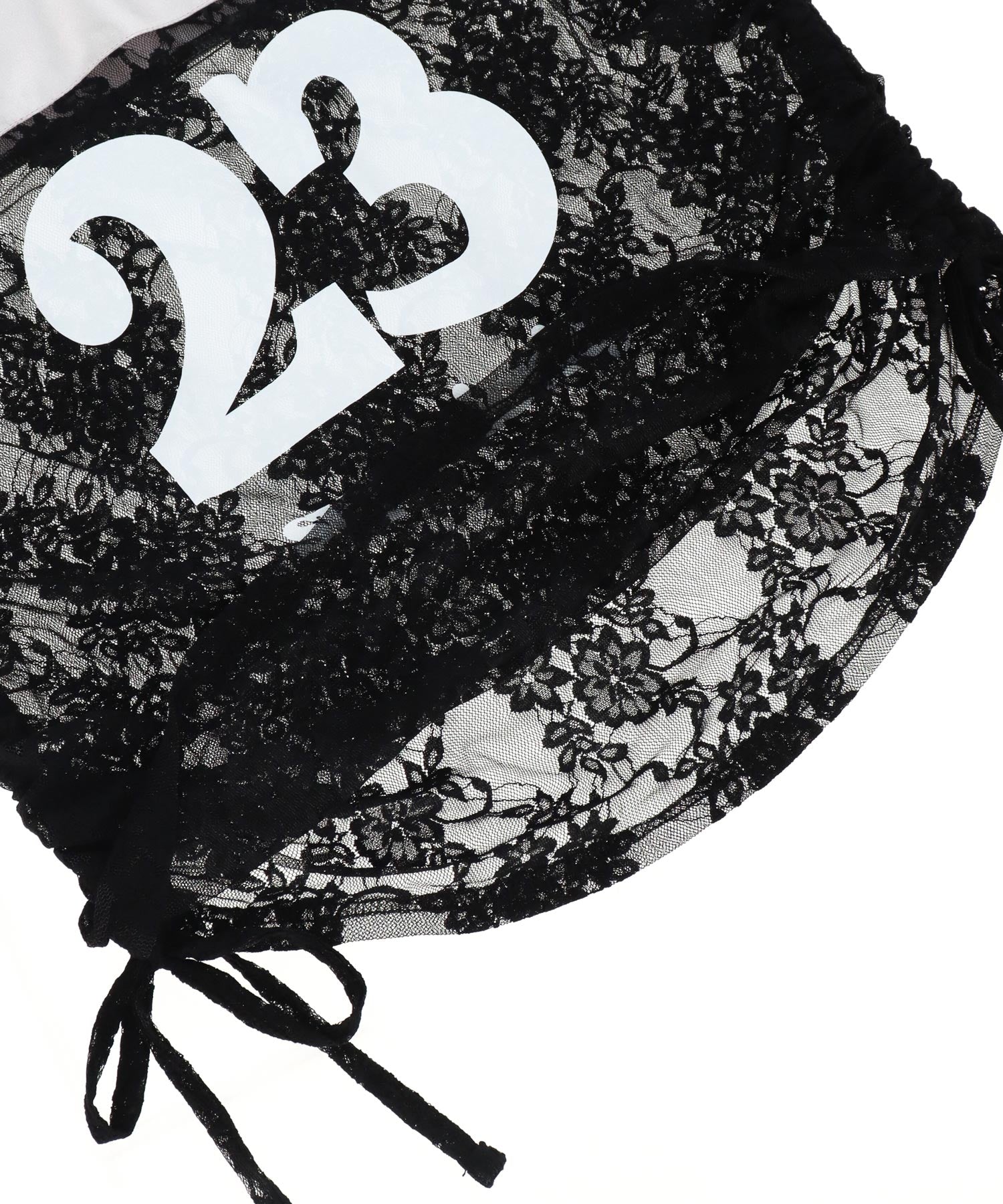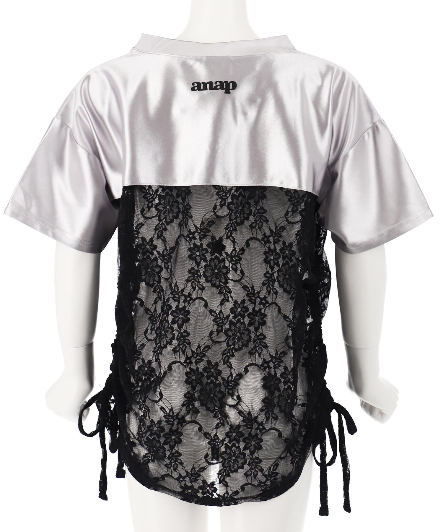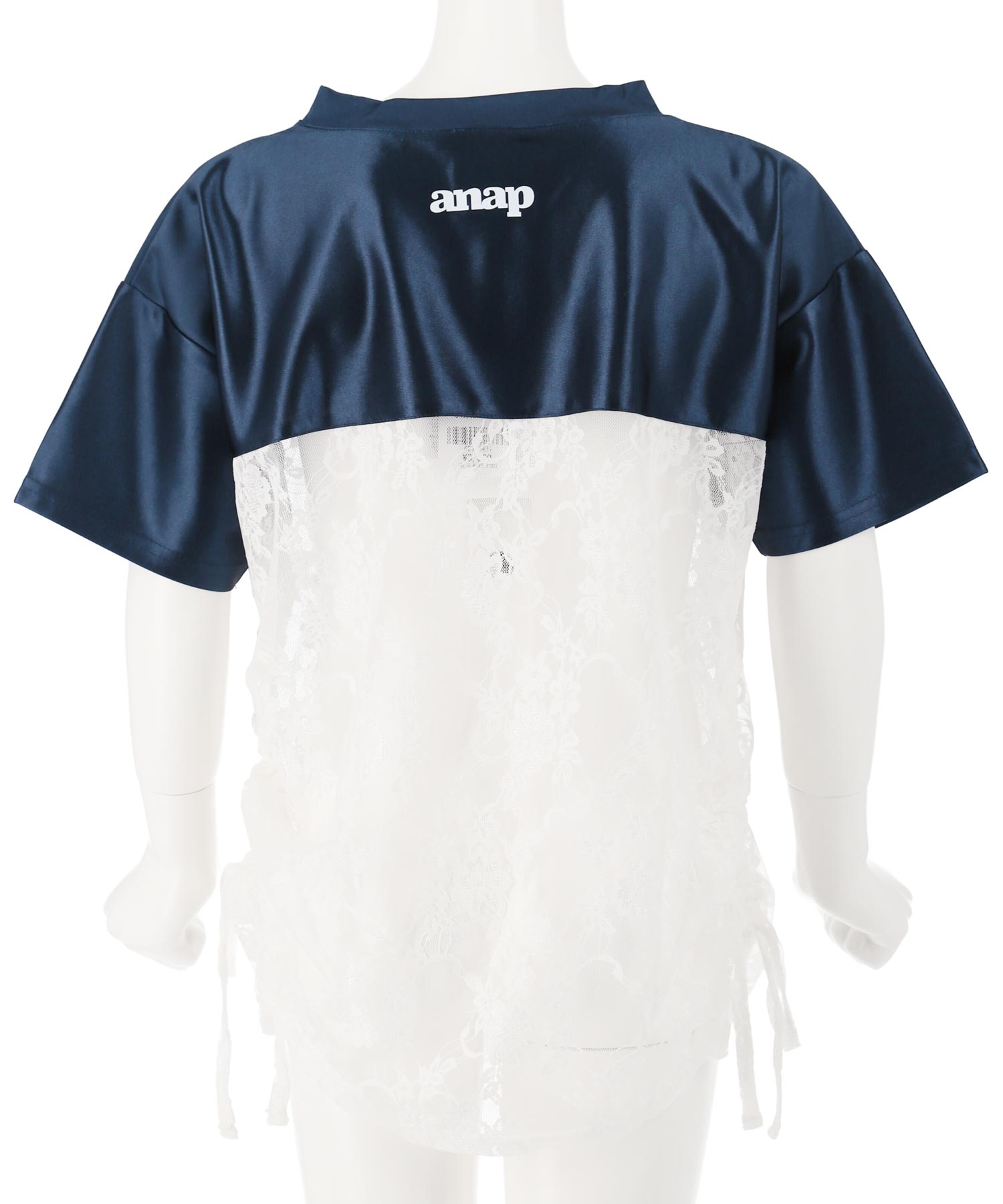 目を引く大胆なレース切り替えが、普段のコーデに新鮮さをプラス。