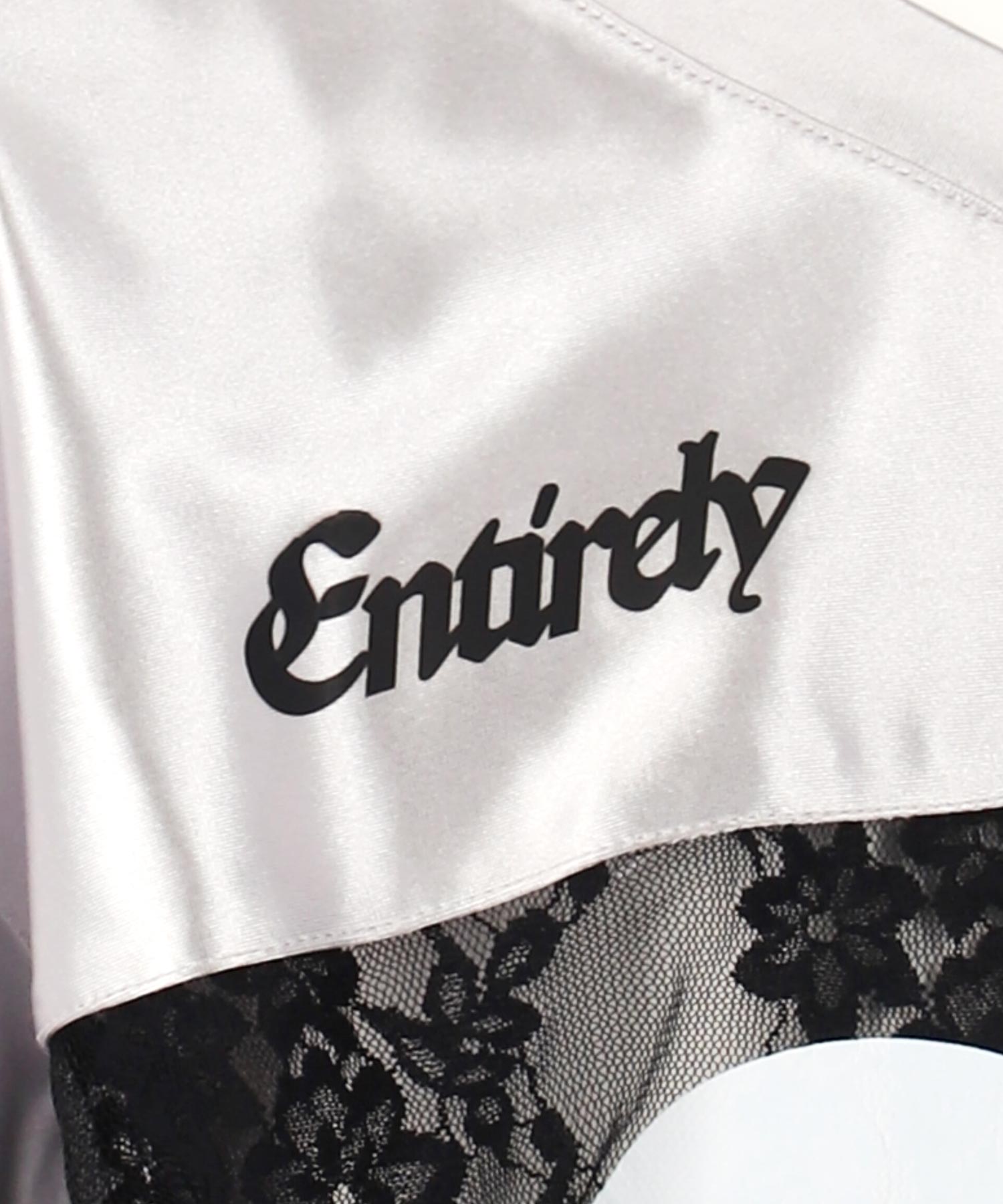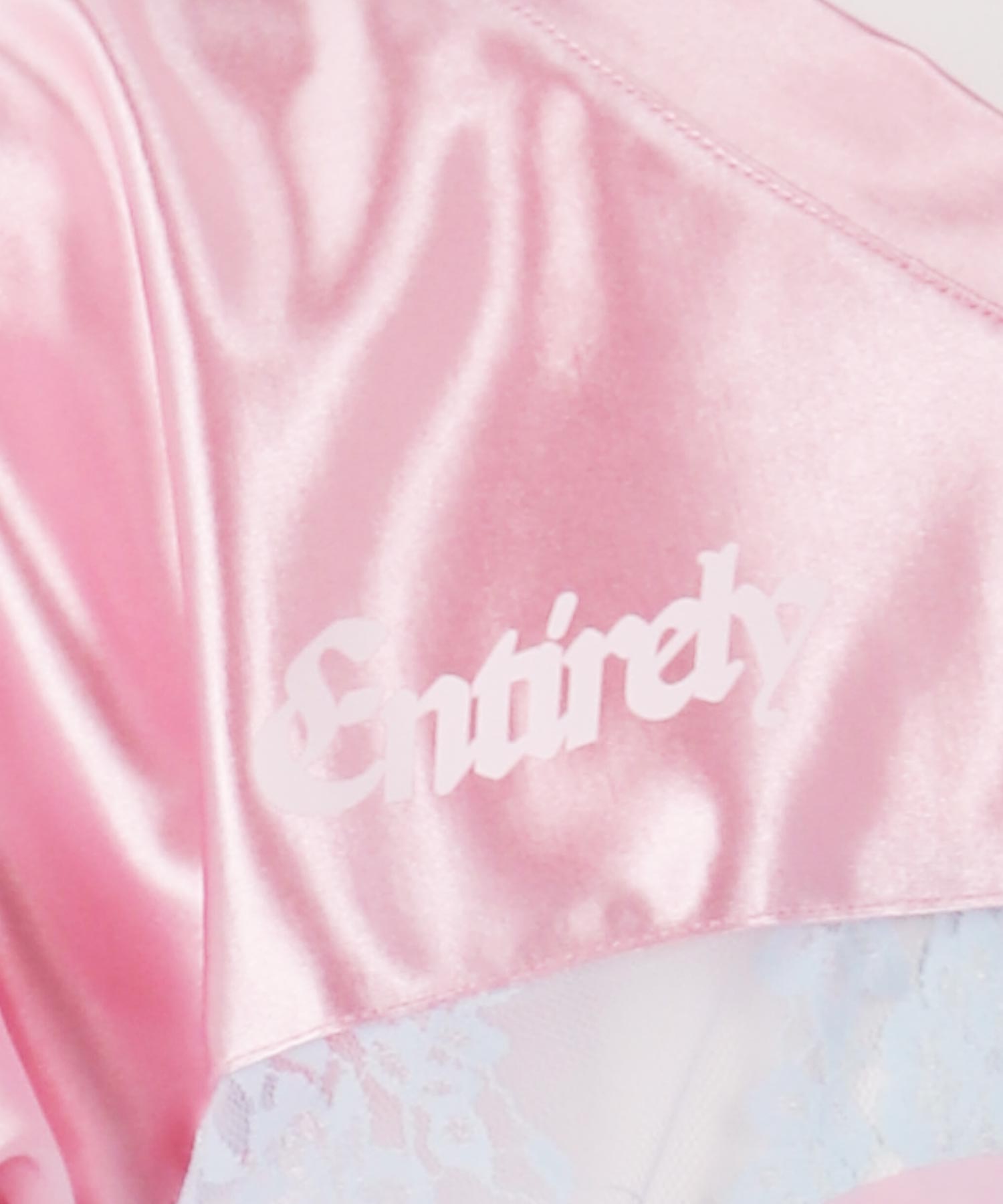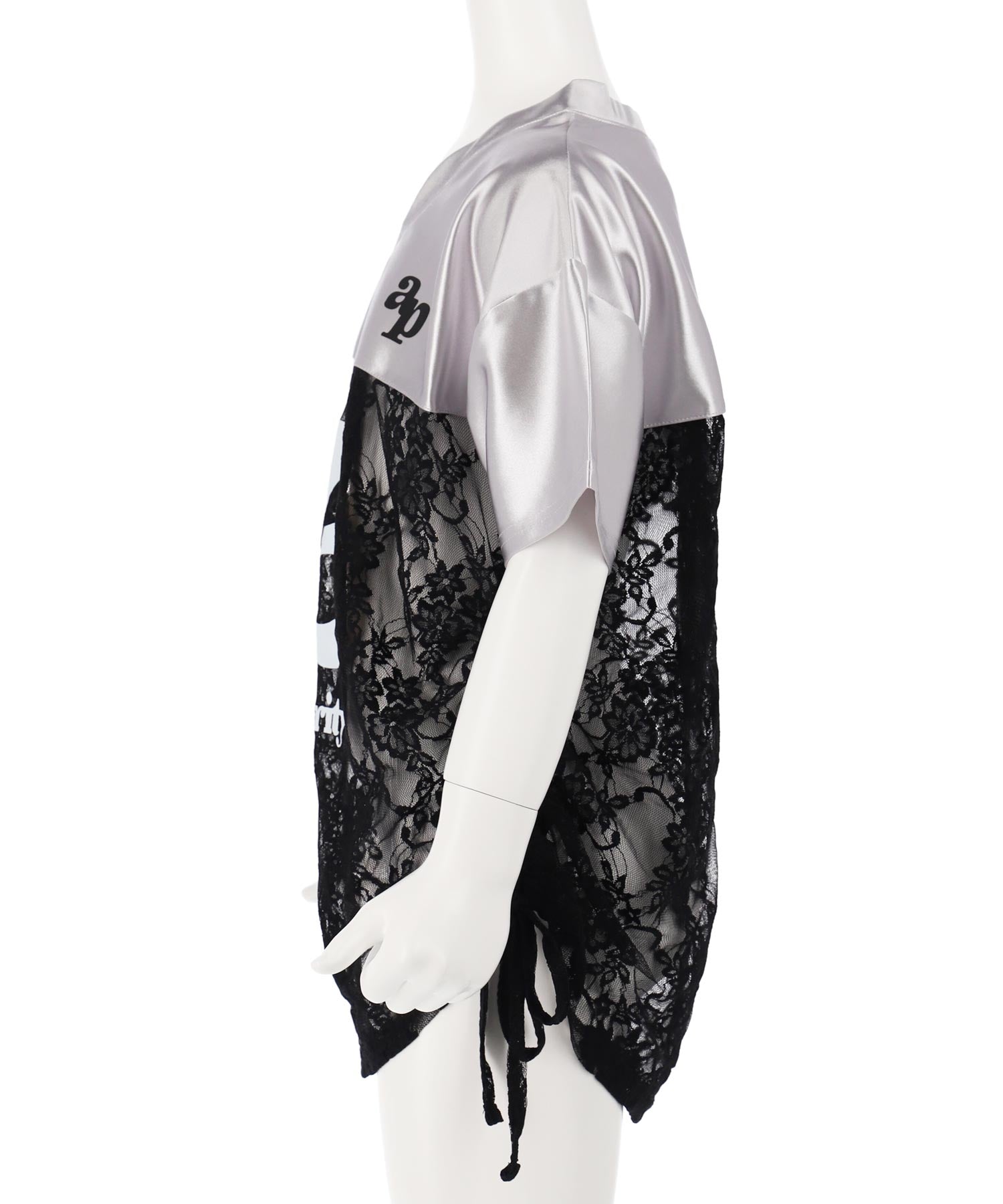 光沢感のあるサテン調素材に、フロントを覆う総レースが印象的なデザイン。