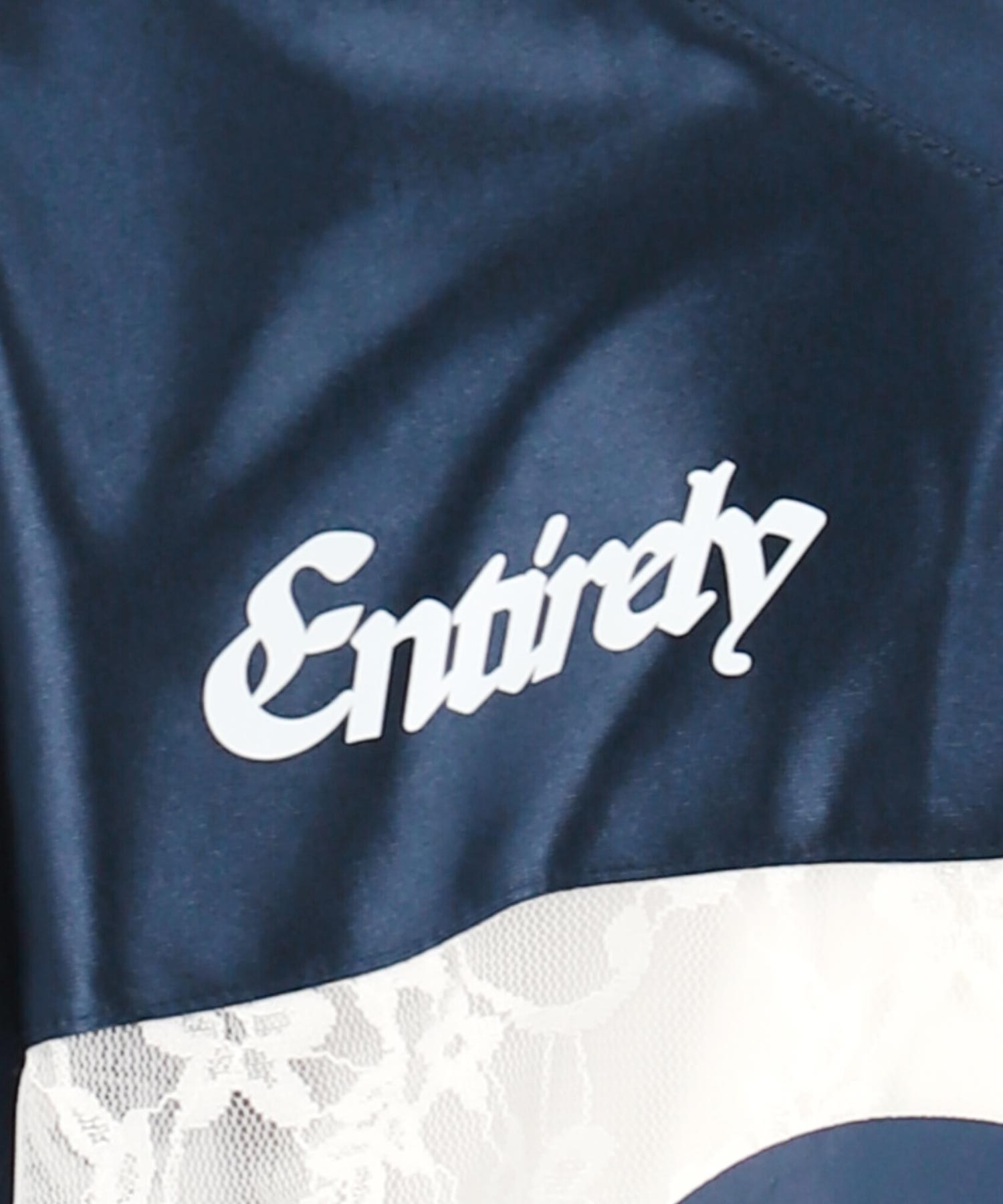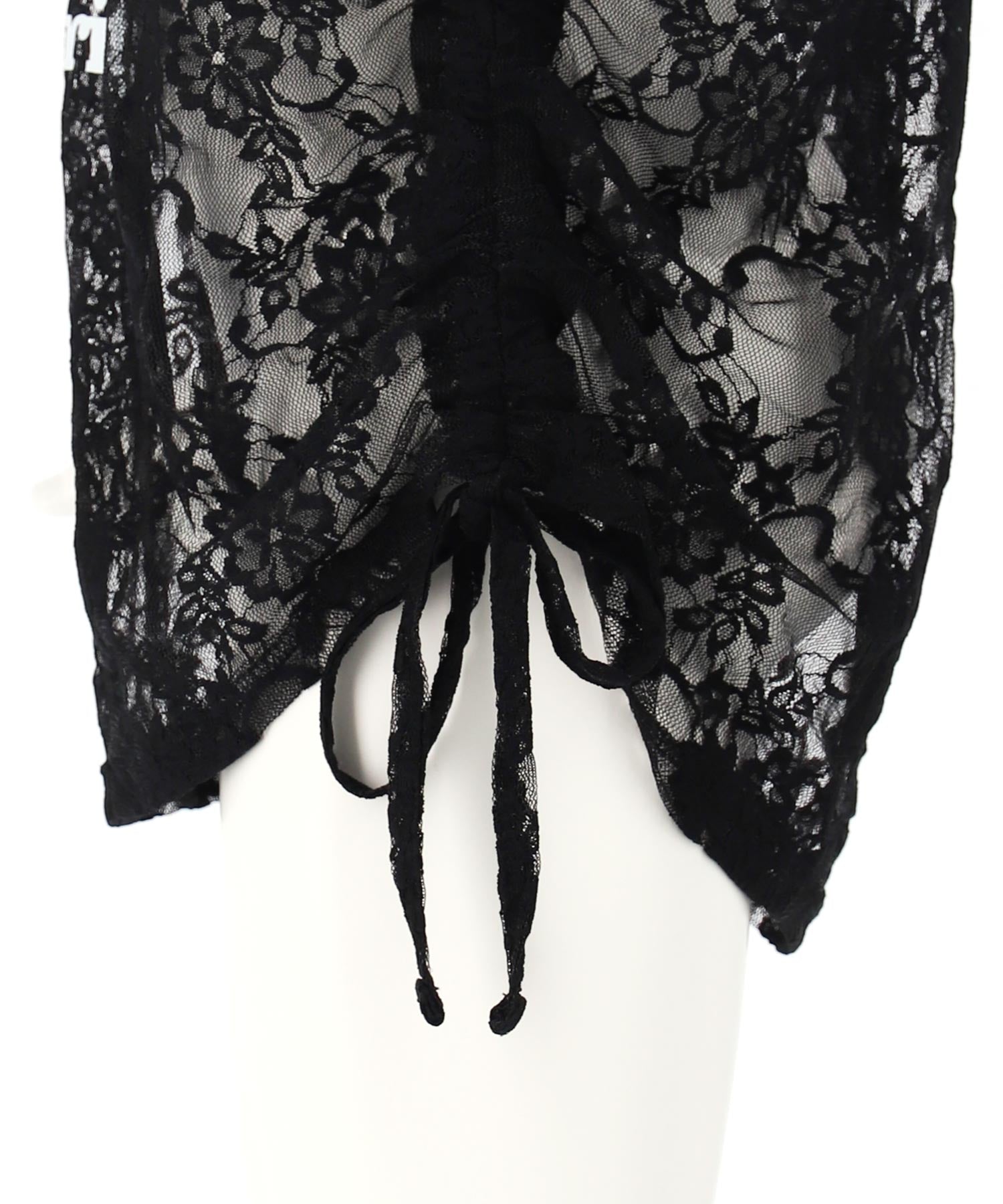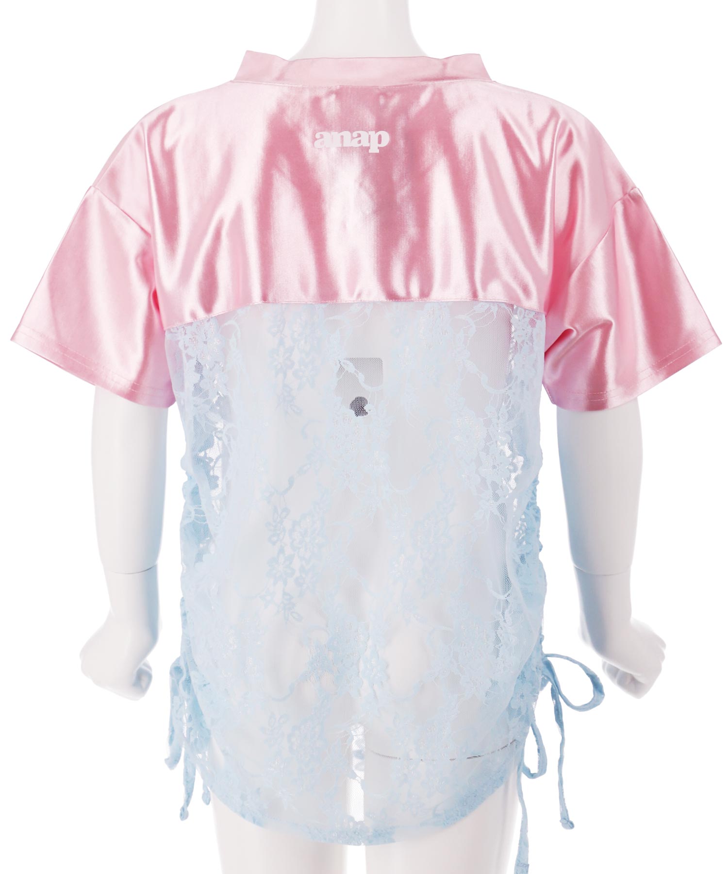光沢感のあるサテン調素材に、フロントを覆う総レースが印象的なデザイン。