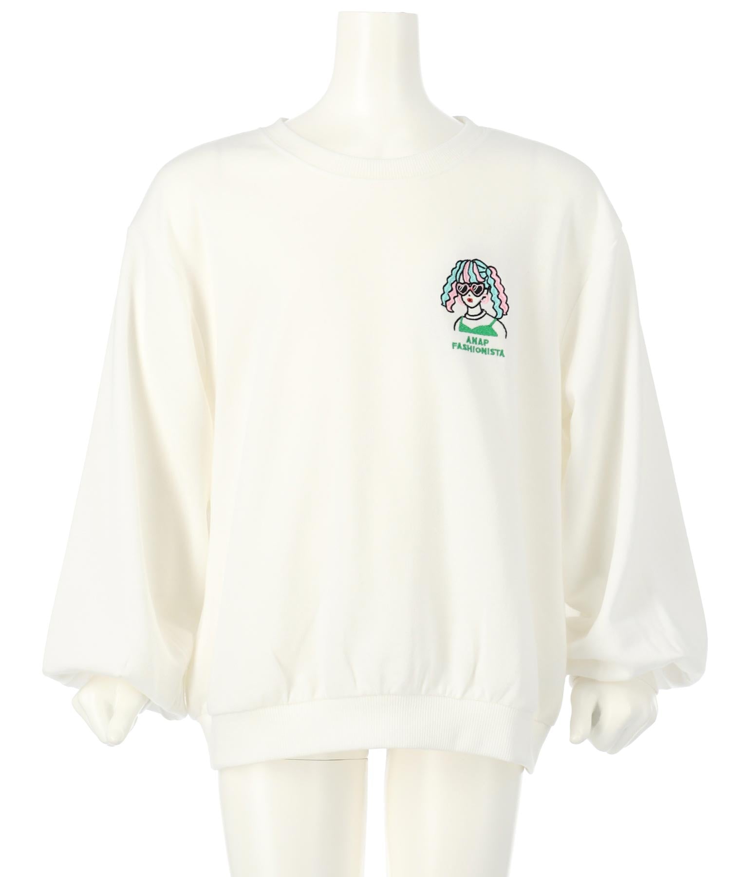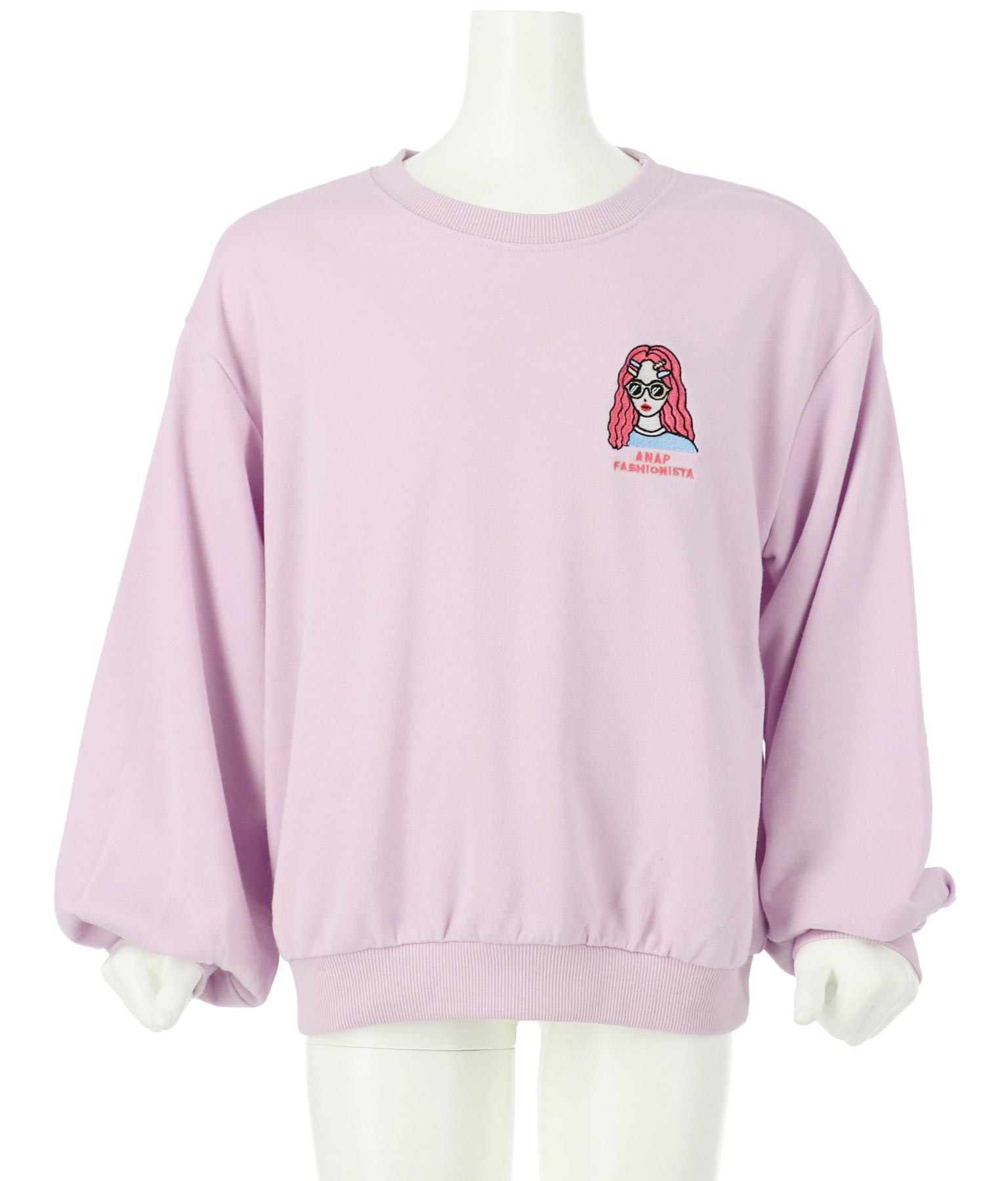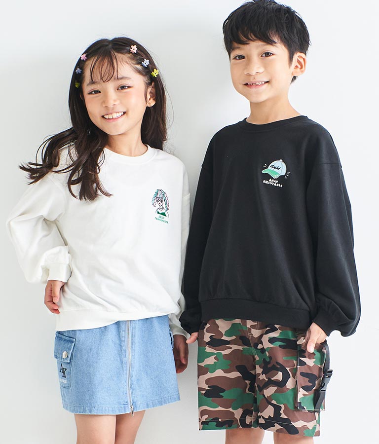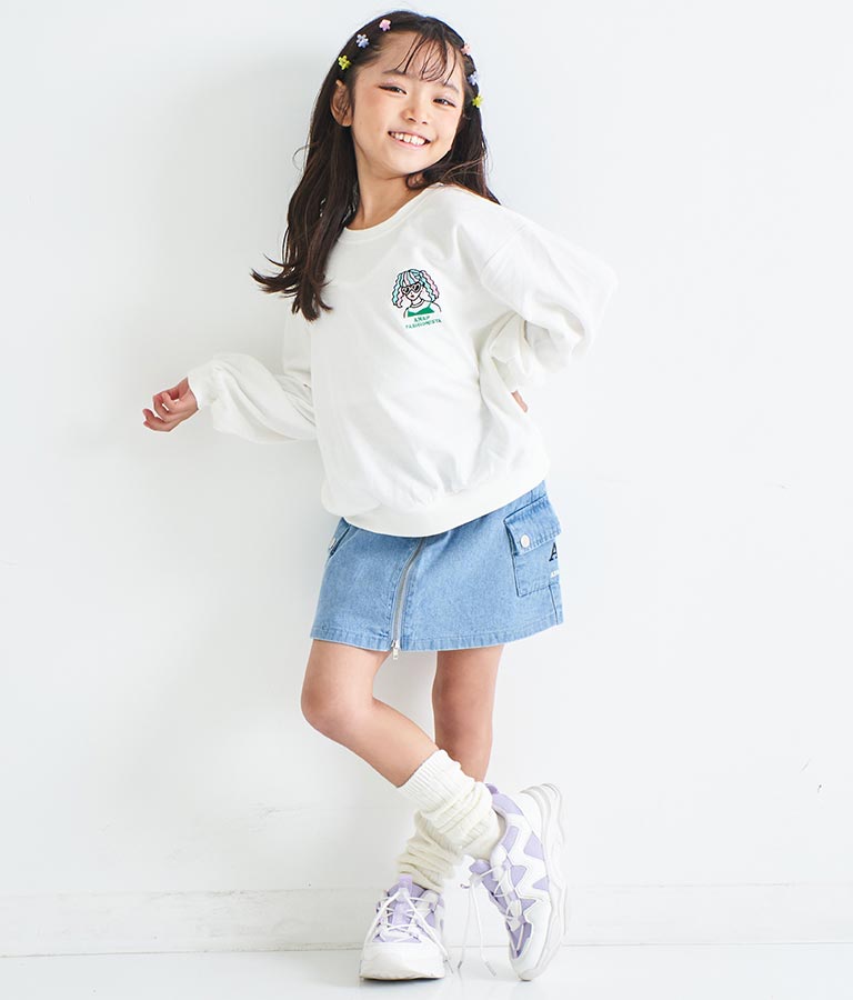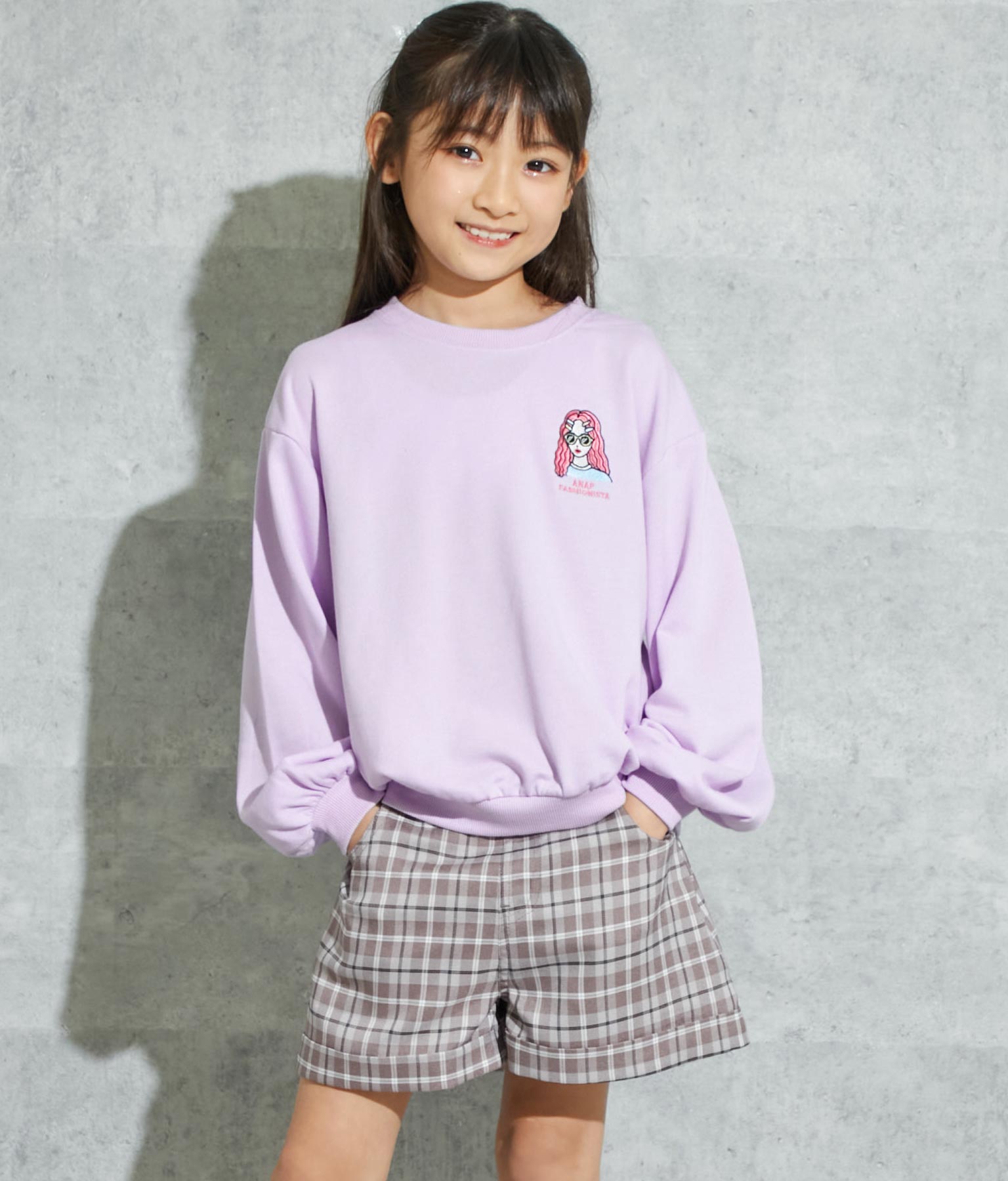 ファッショニスタやキャップなど興味を引くモチーフ刺しゅうをあしらったミニ裏毛トレーナー♪