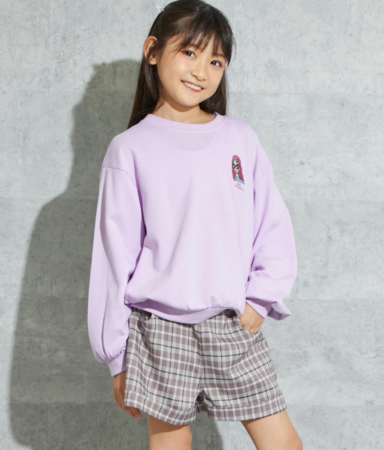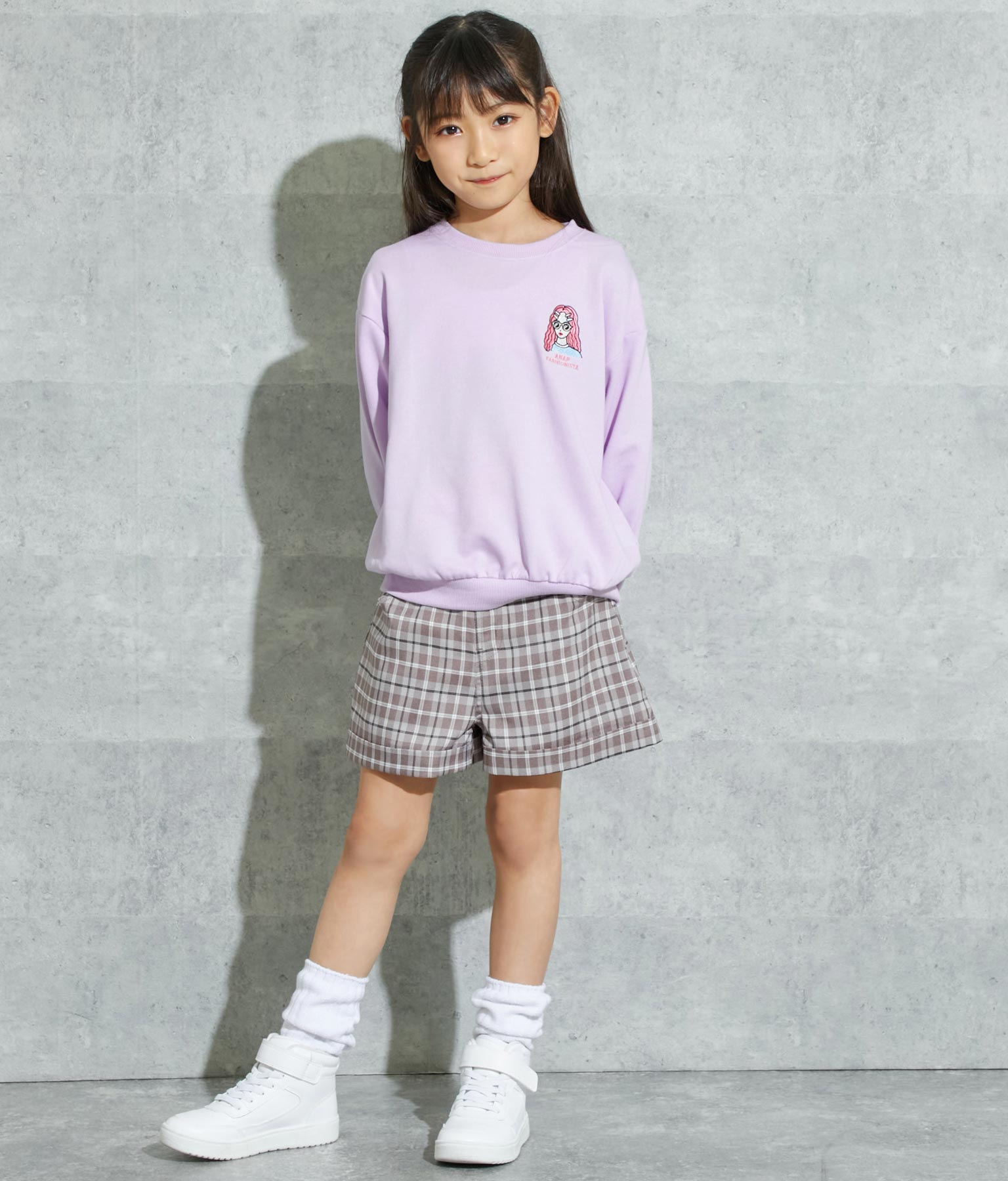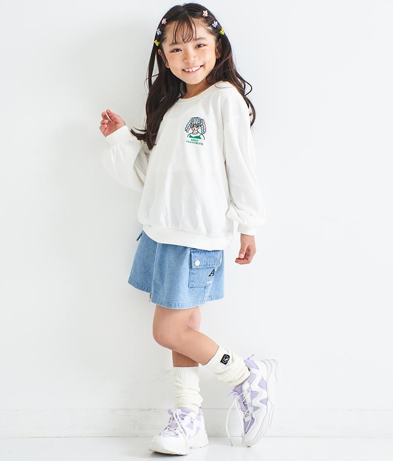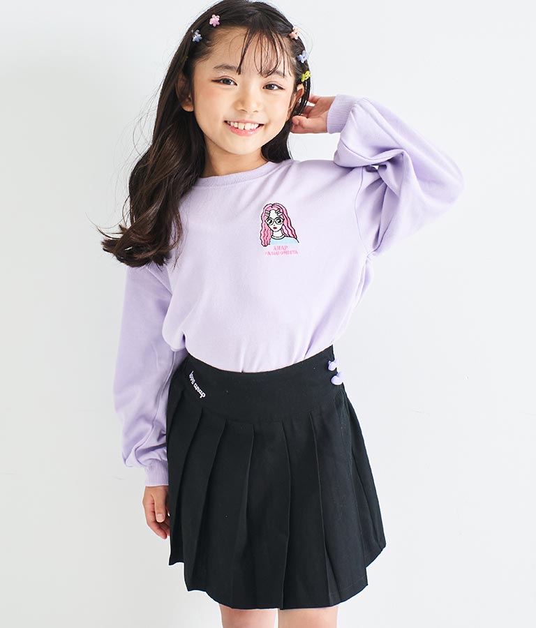 ファッショニスタやキャップなど興味を引くモチーフ刺しゅうをあしらったミニ裏毛トレーナー♪