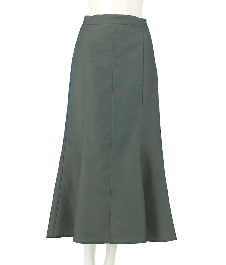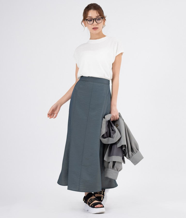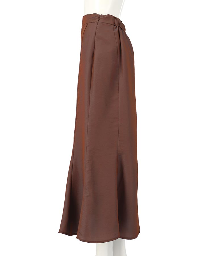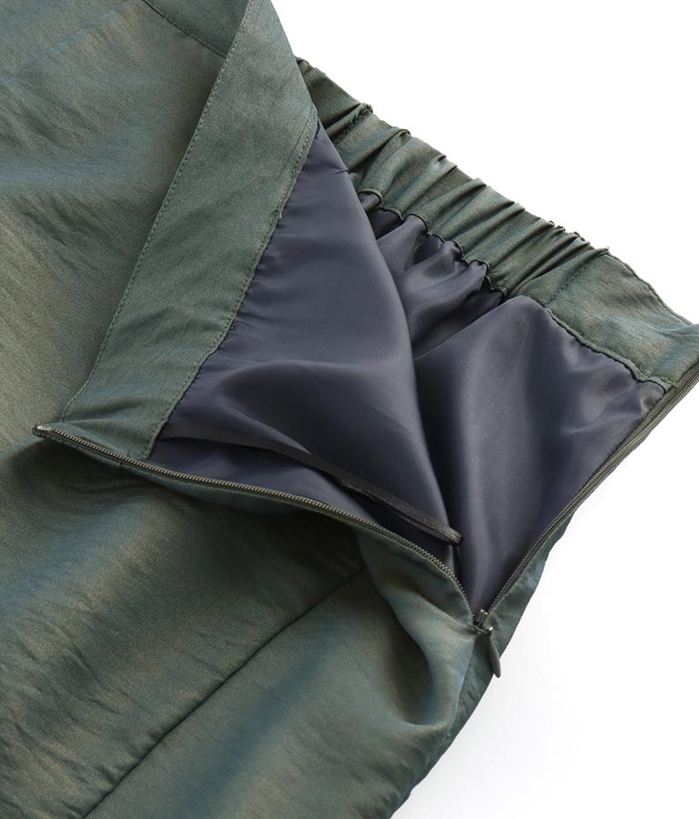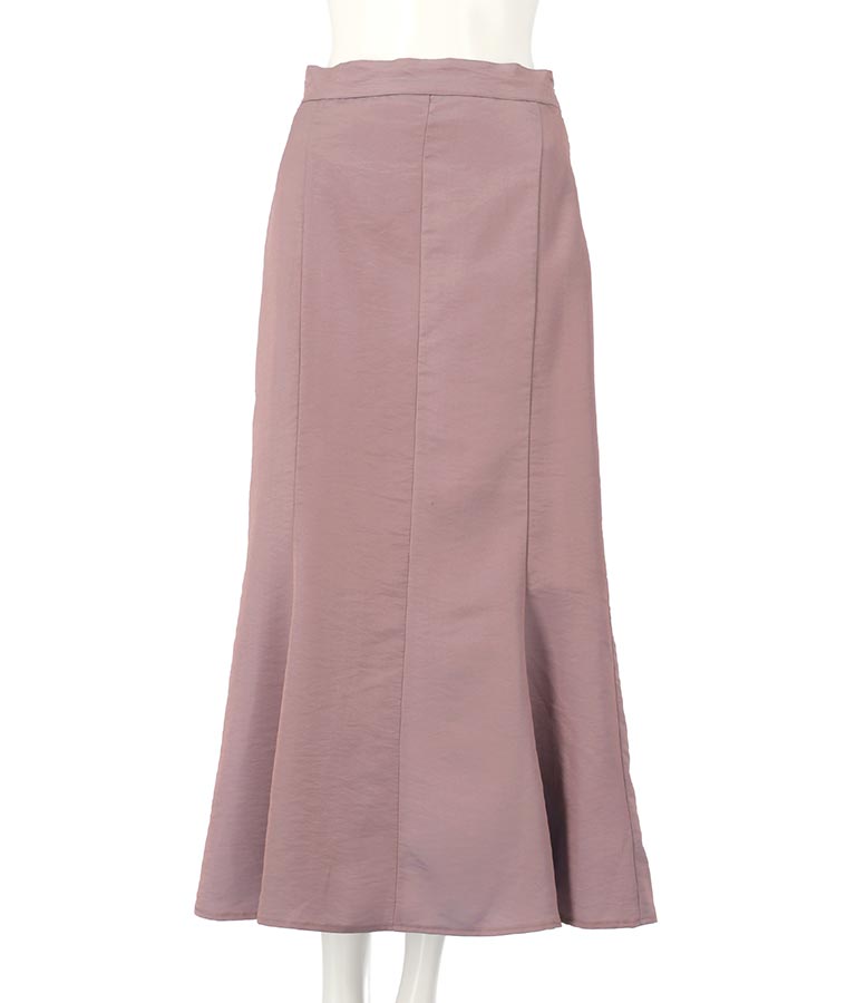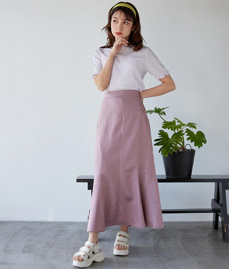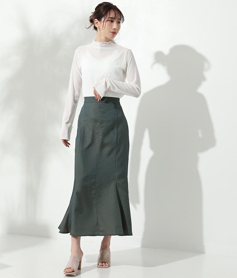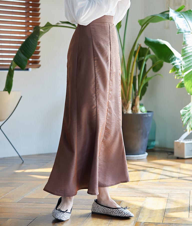 光沢感のある風合いでスタイリングがリュクスにまとまるスカート。