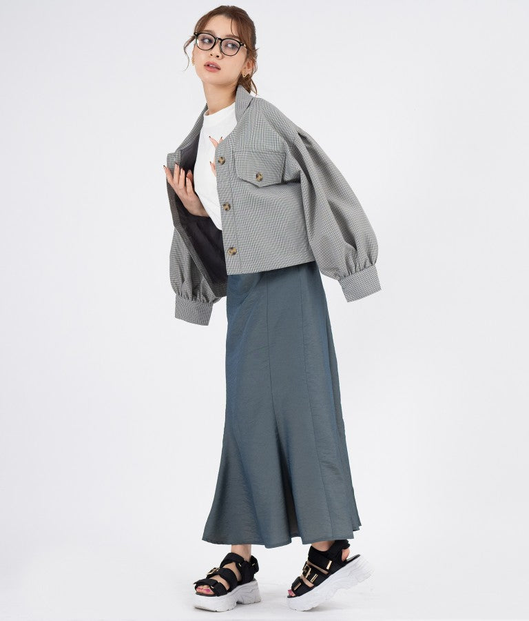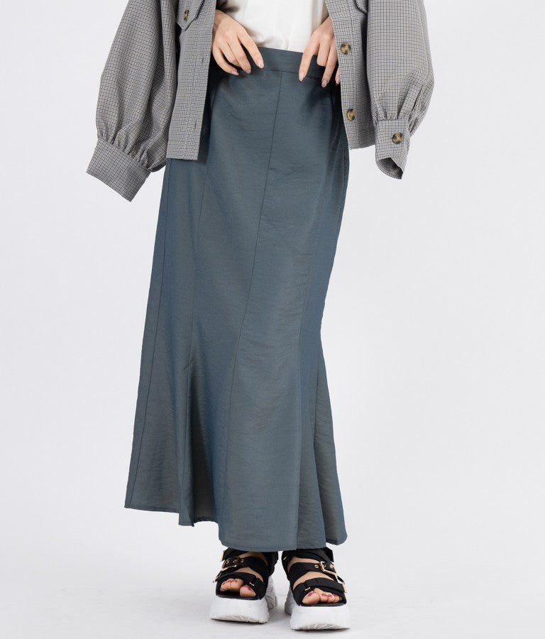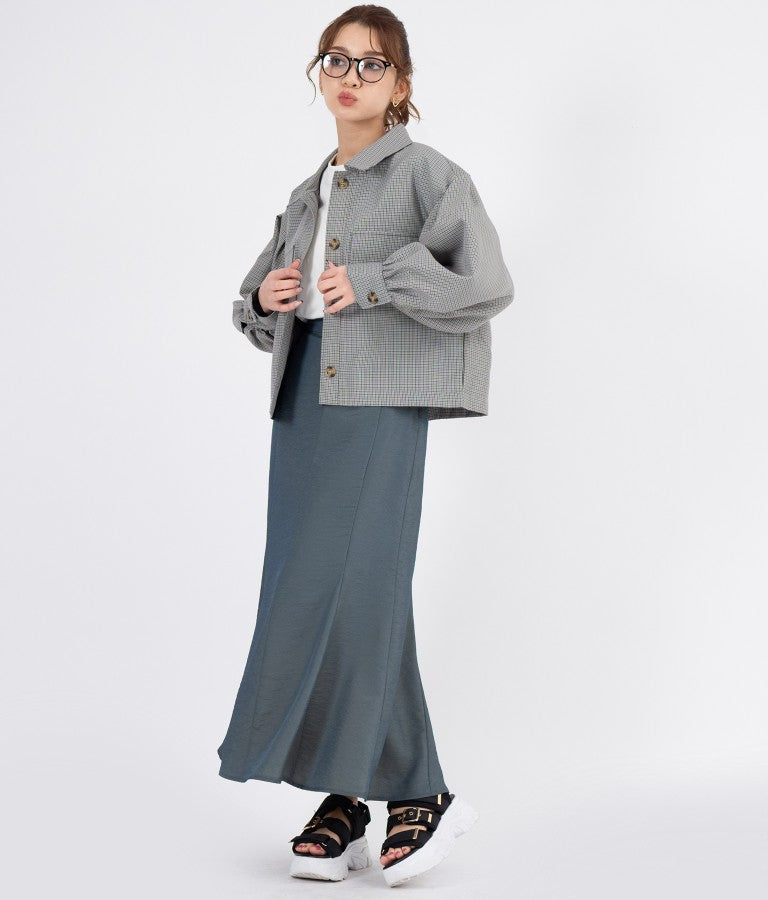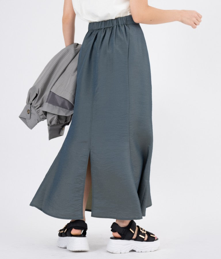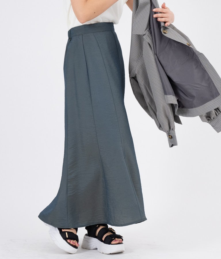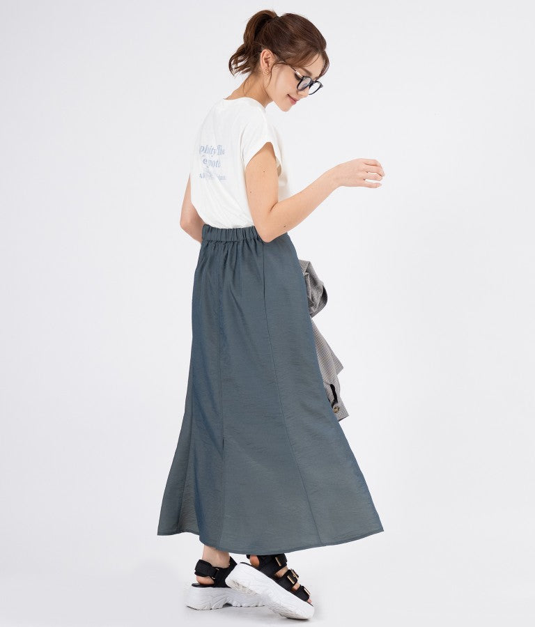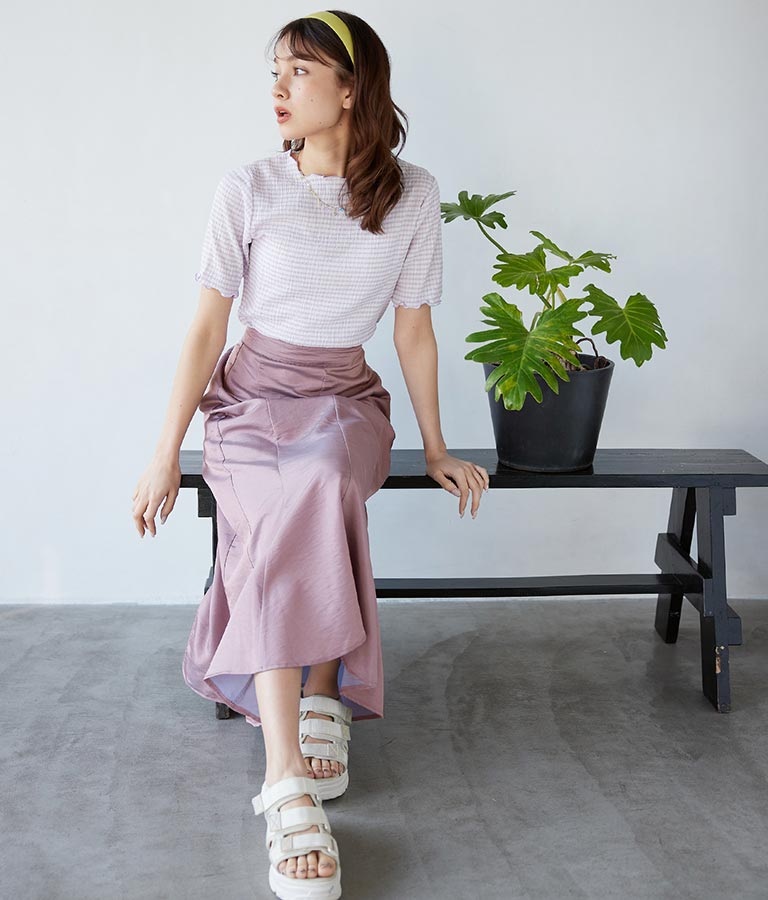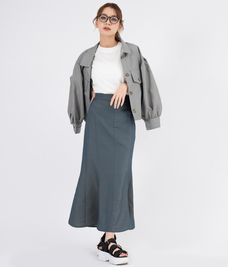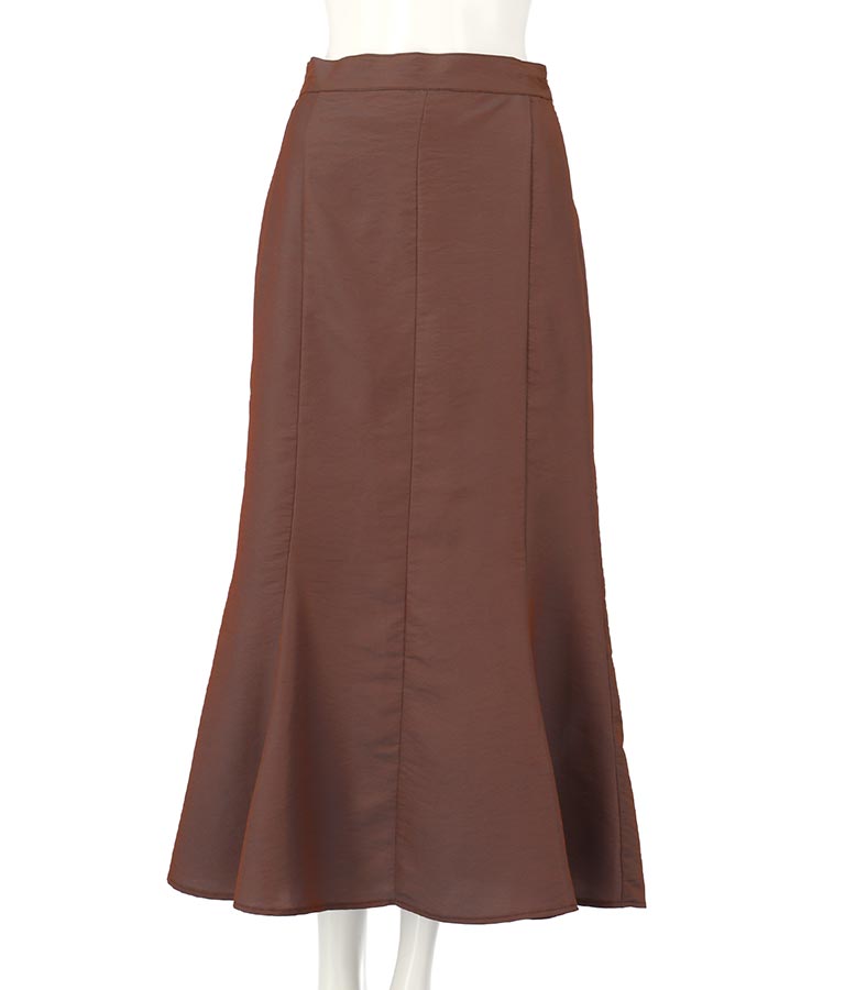 光沢感のある風合いでスタイリングがリュクスにまとまるスカート。