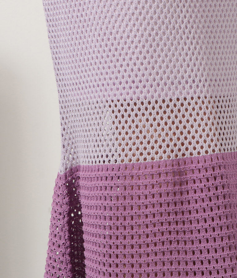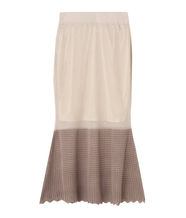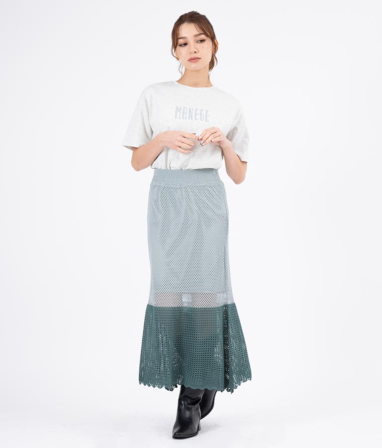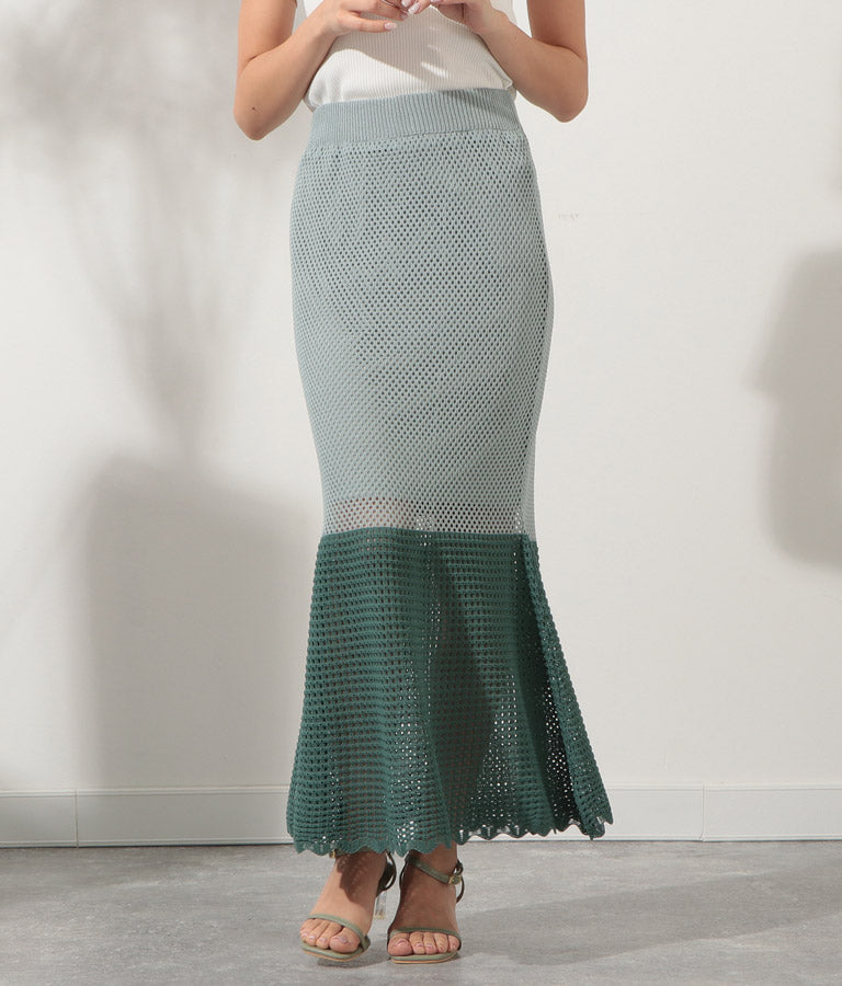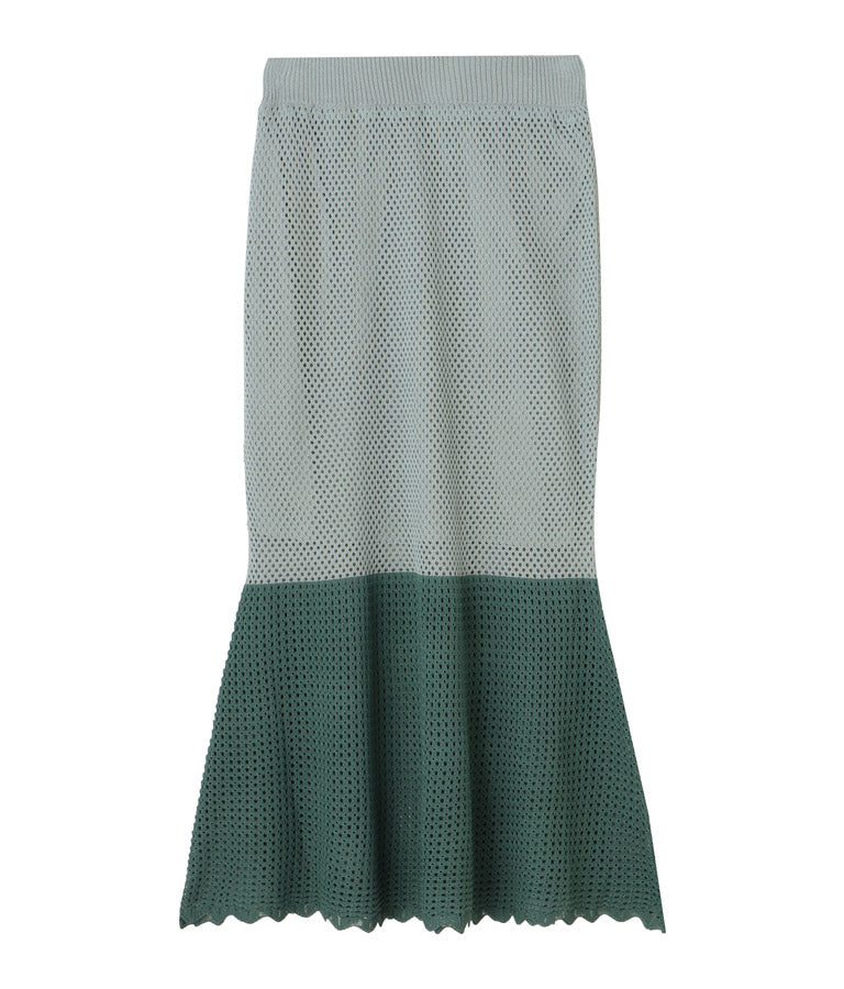 裾フレアに広がるトレンドのマーメイドシルエットはバイカラーの配色仕立てで個性をプラスしました。