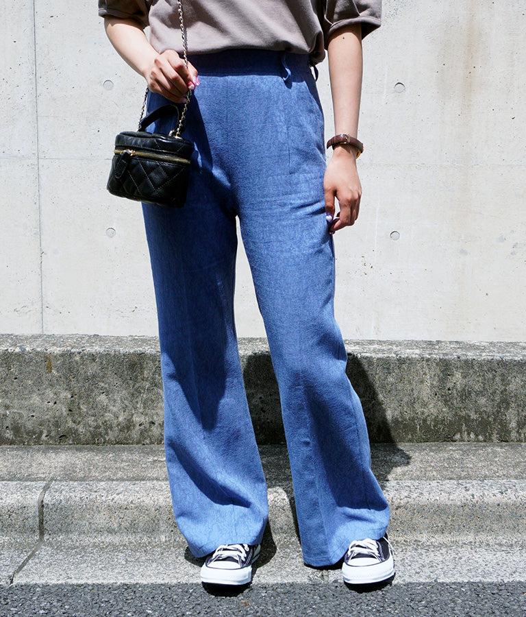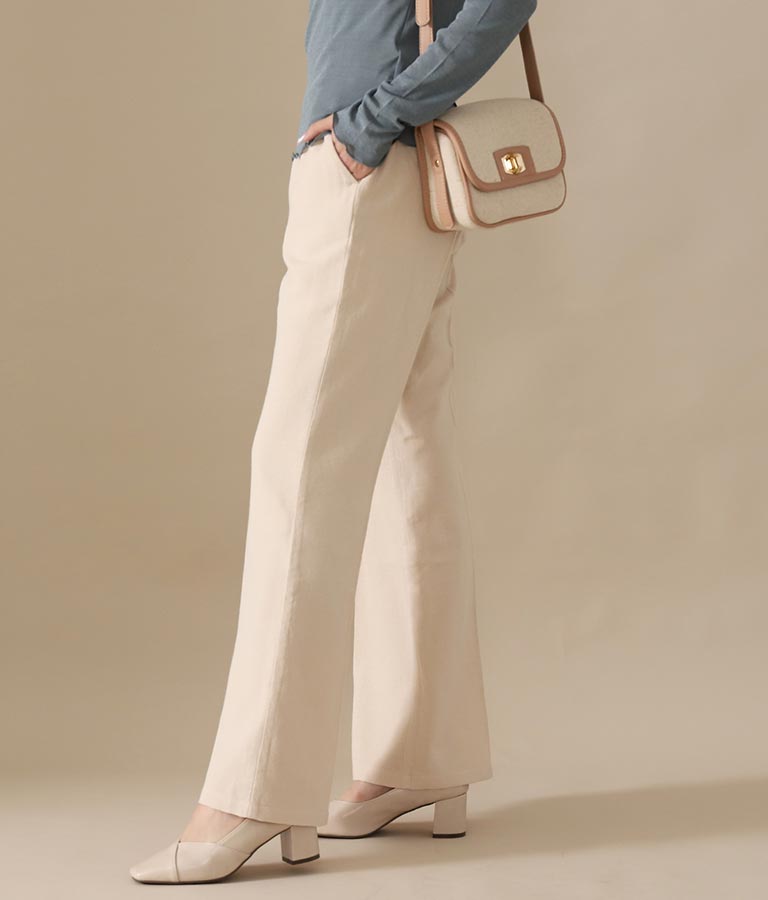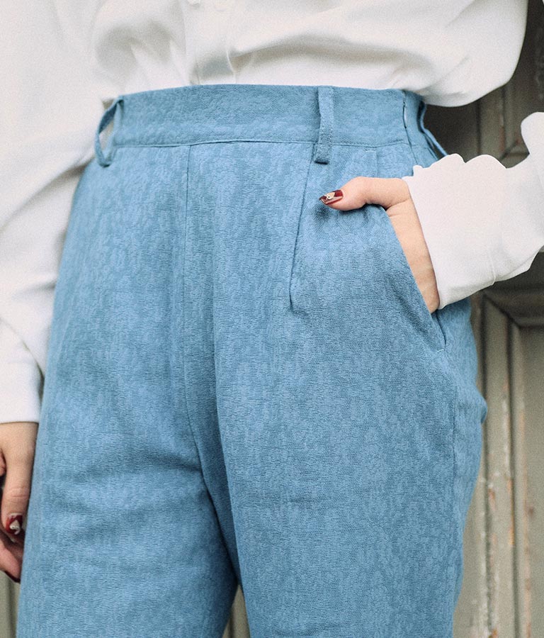 無地のように見える控えめなダマスク柄が上品なパンツ。