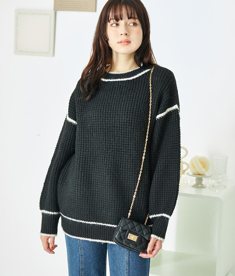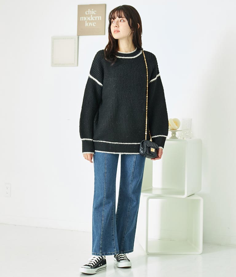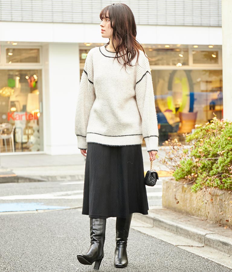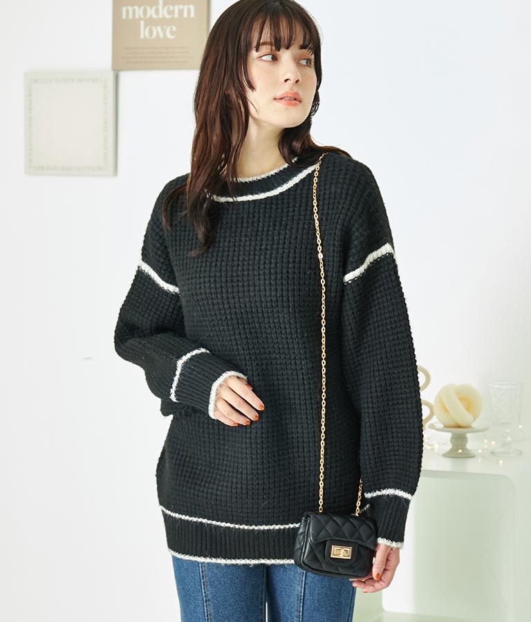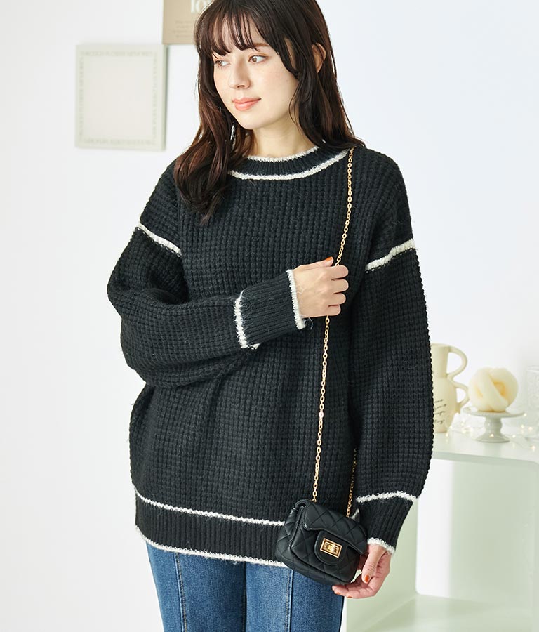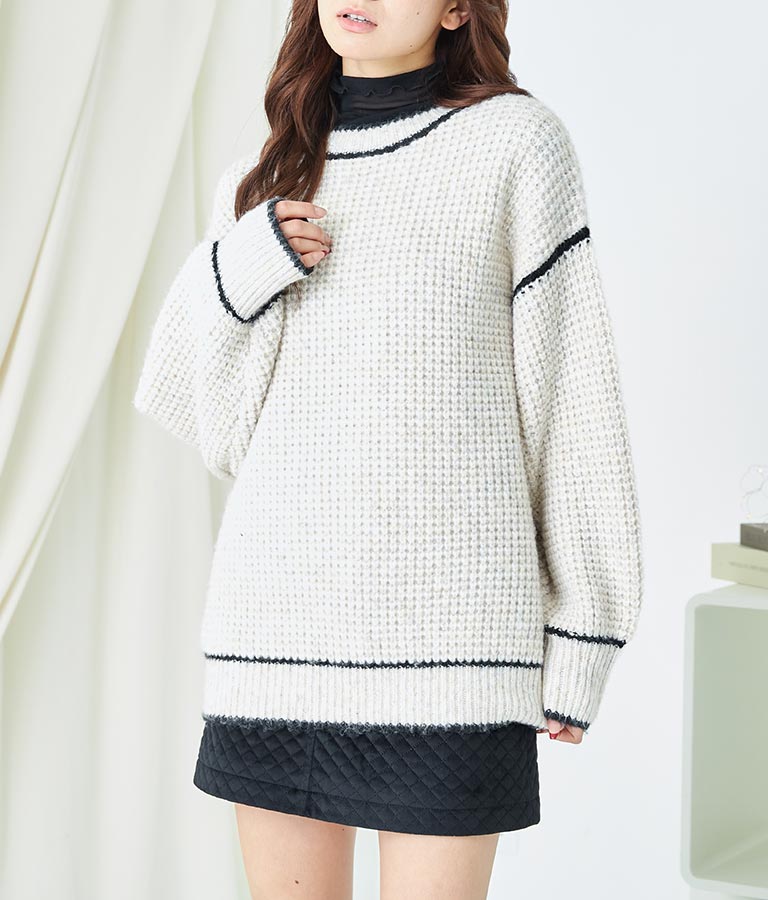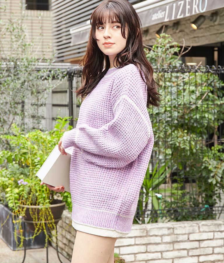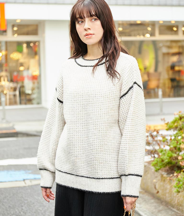 手編み風のざっくりとした編地が抜け感を演出するニットトップス。