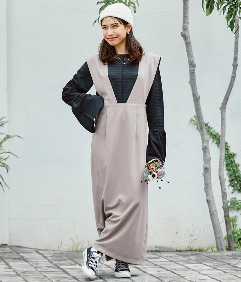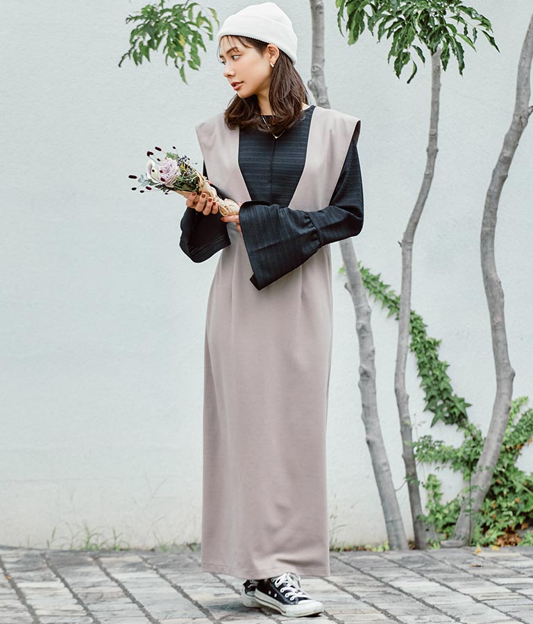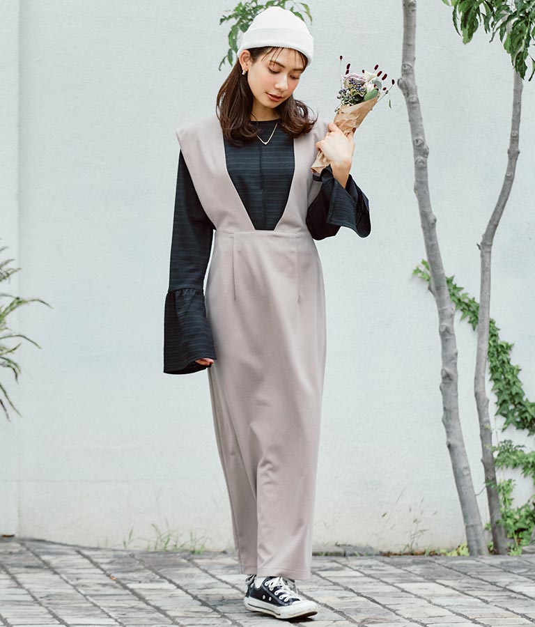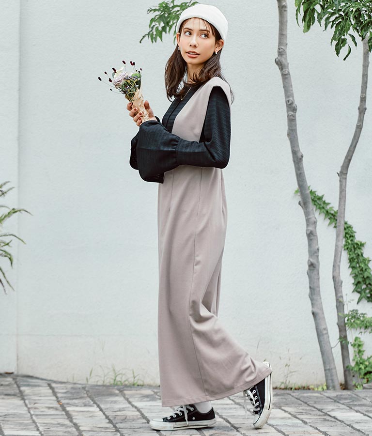 定番のデニムパンツと合わせたり、ジャンパースカートやベストとのコーディネートもおすすめ。