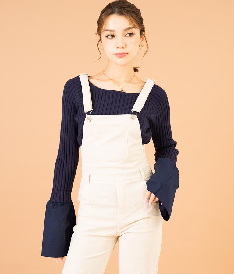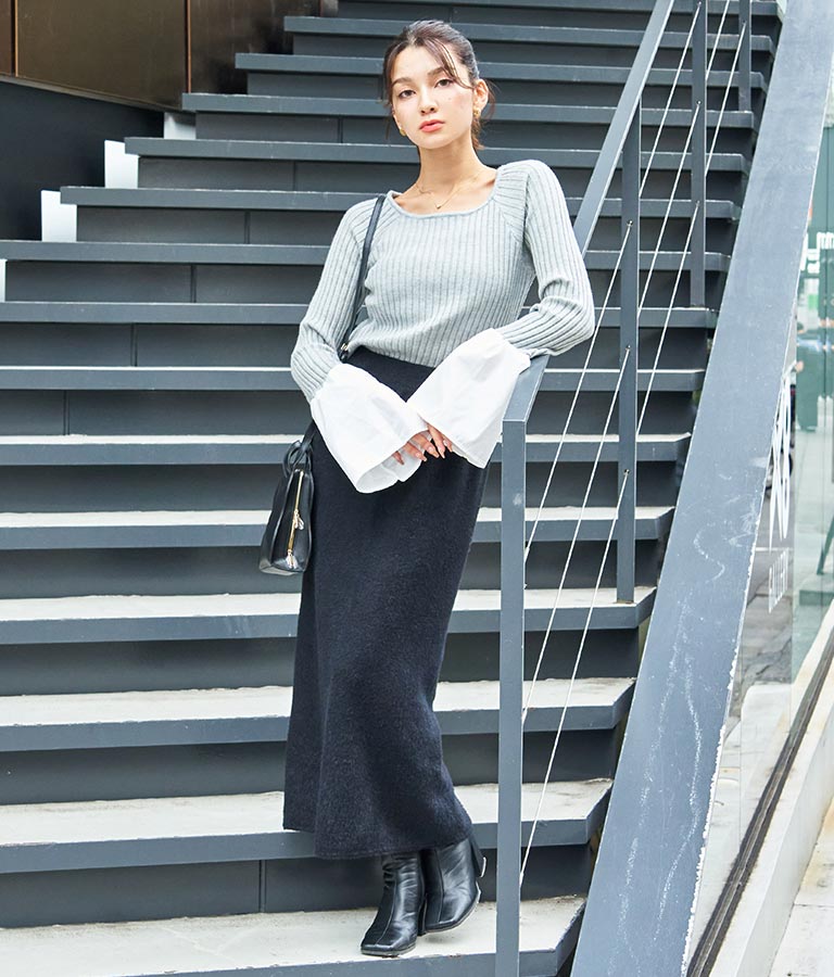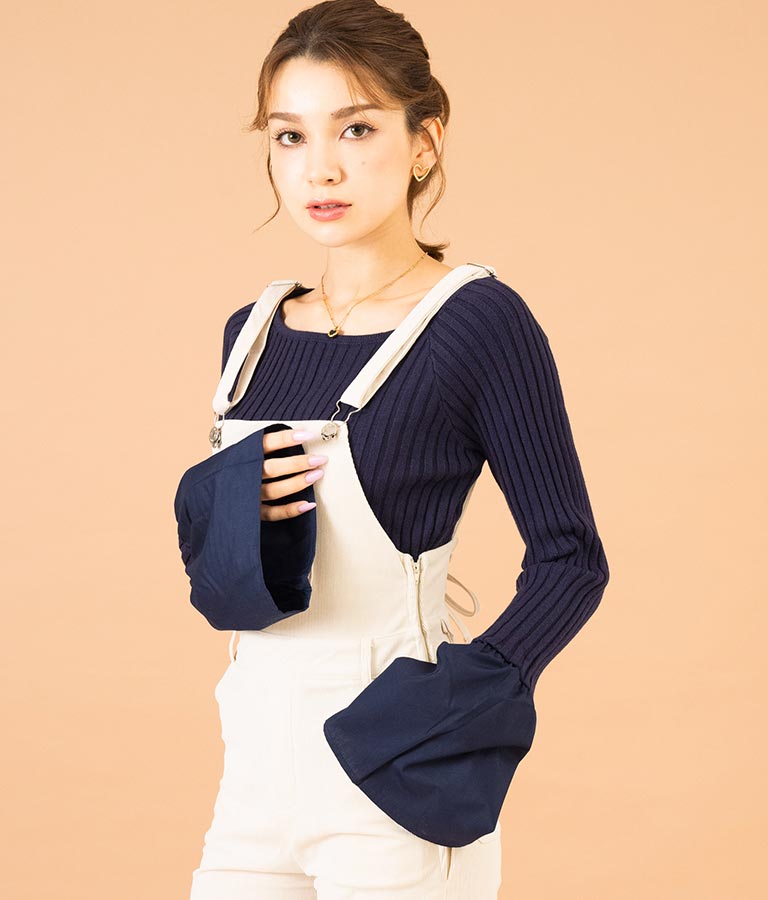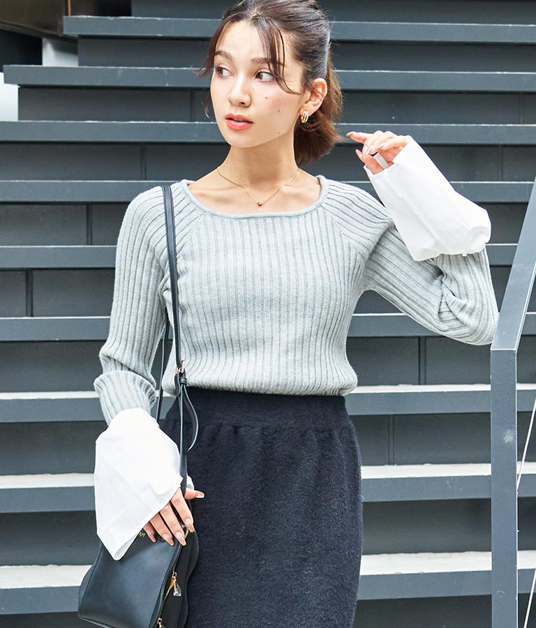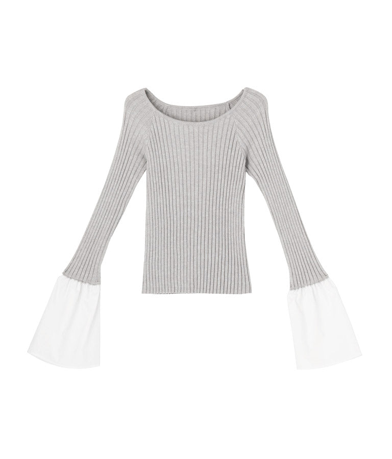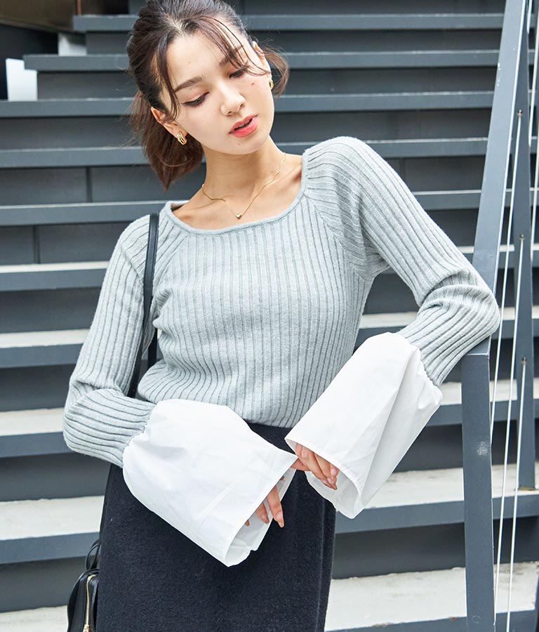 異素材に切り替えたベルスリーブがアクセントのニットトップス。